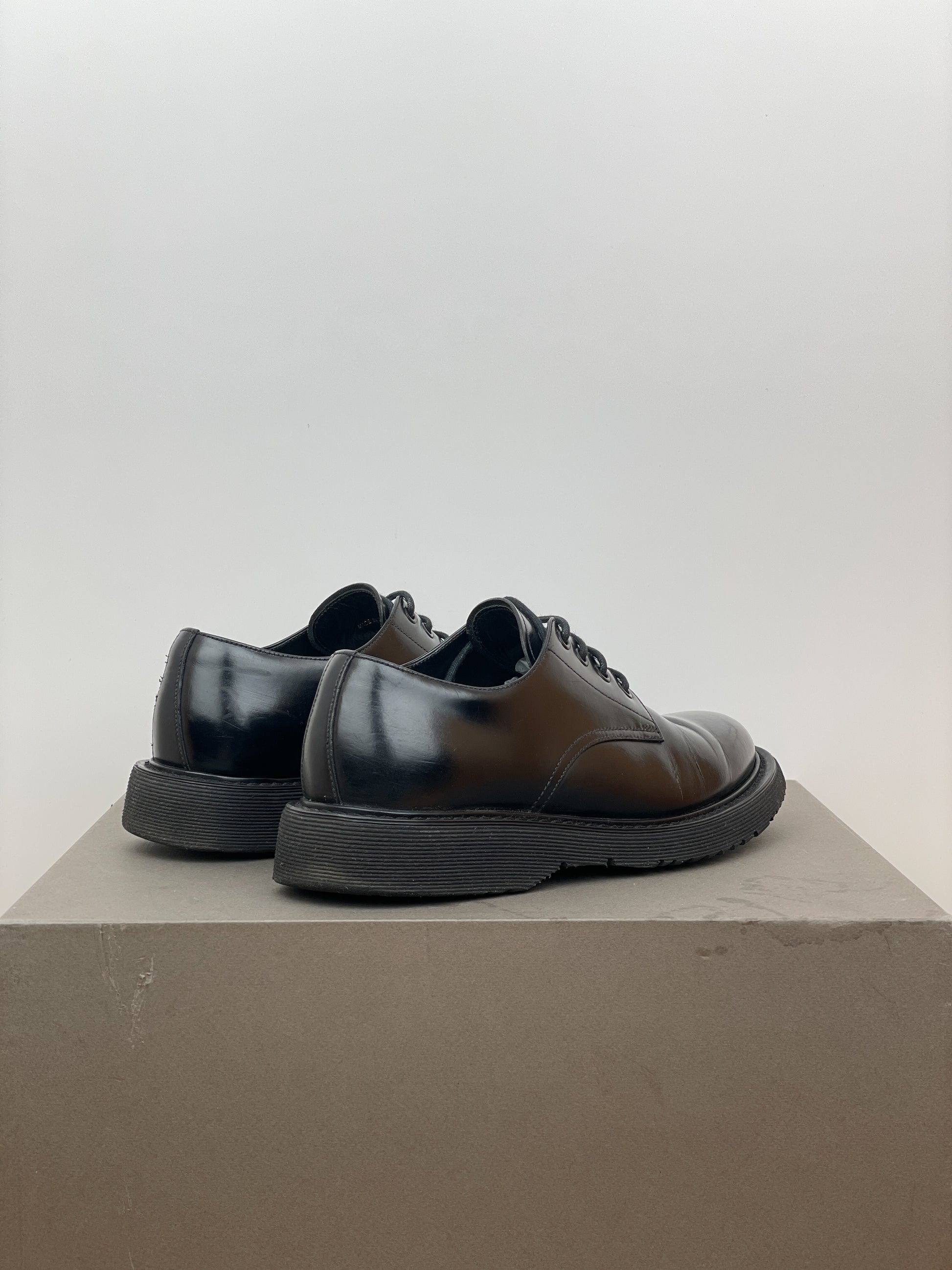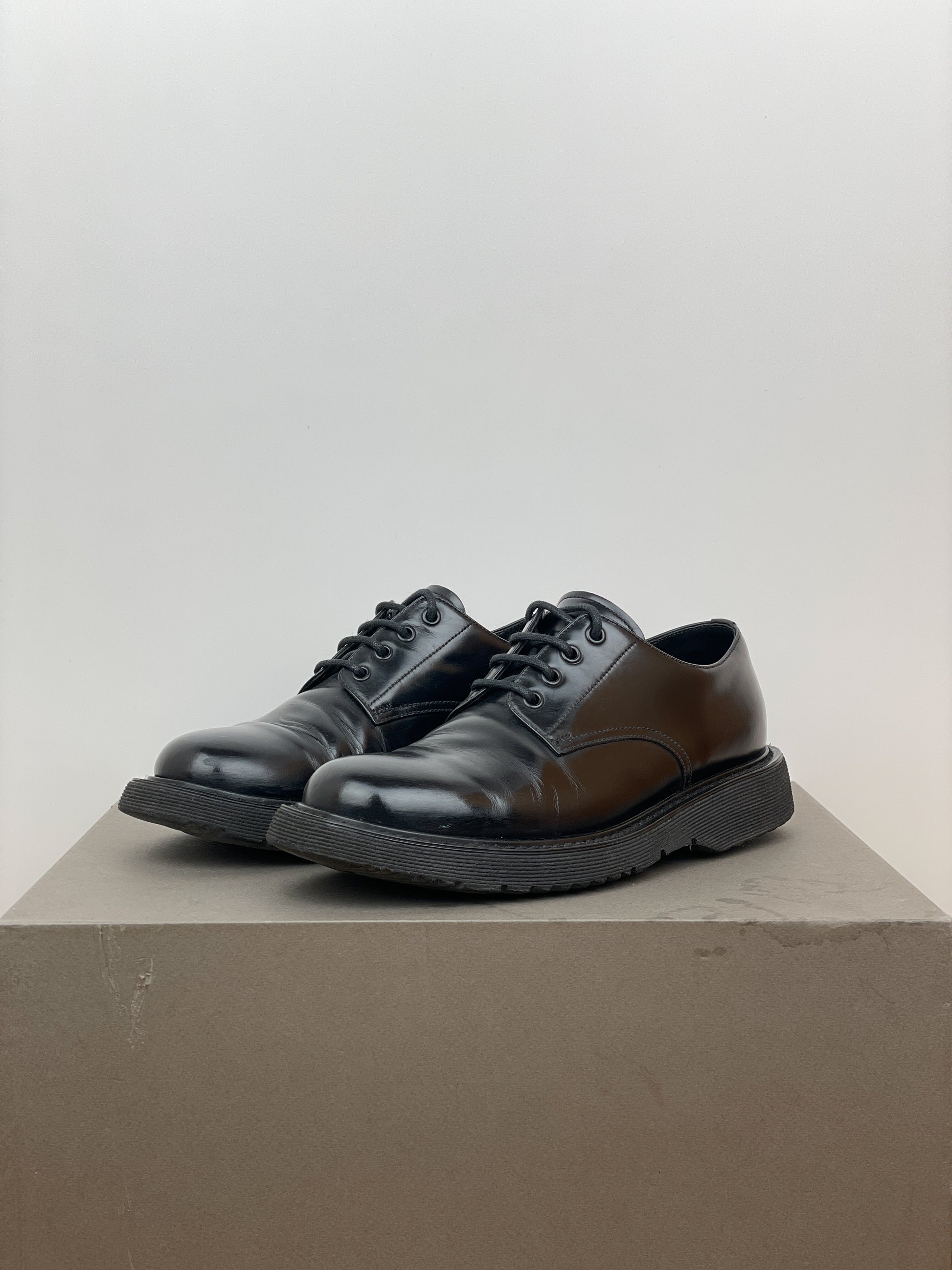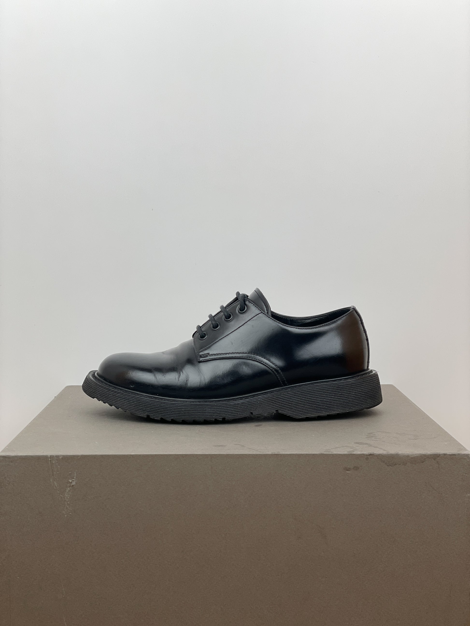 Black leather derby shoes with black metal eyelets and a chunky rubber sole, from the autumn-winter 2021 collection.