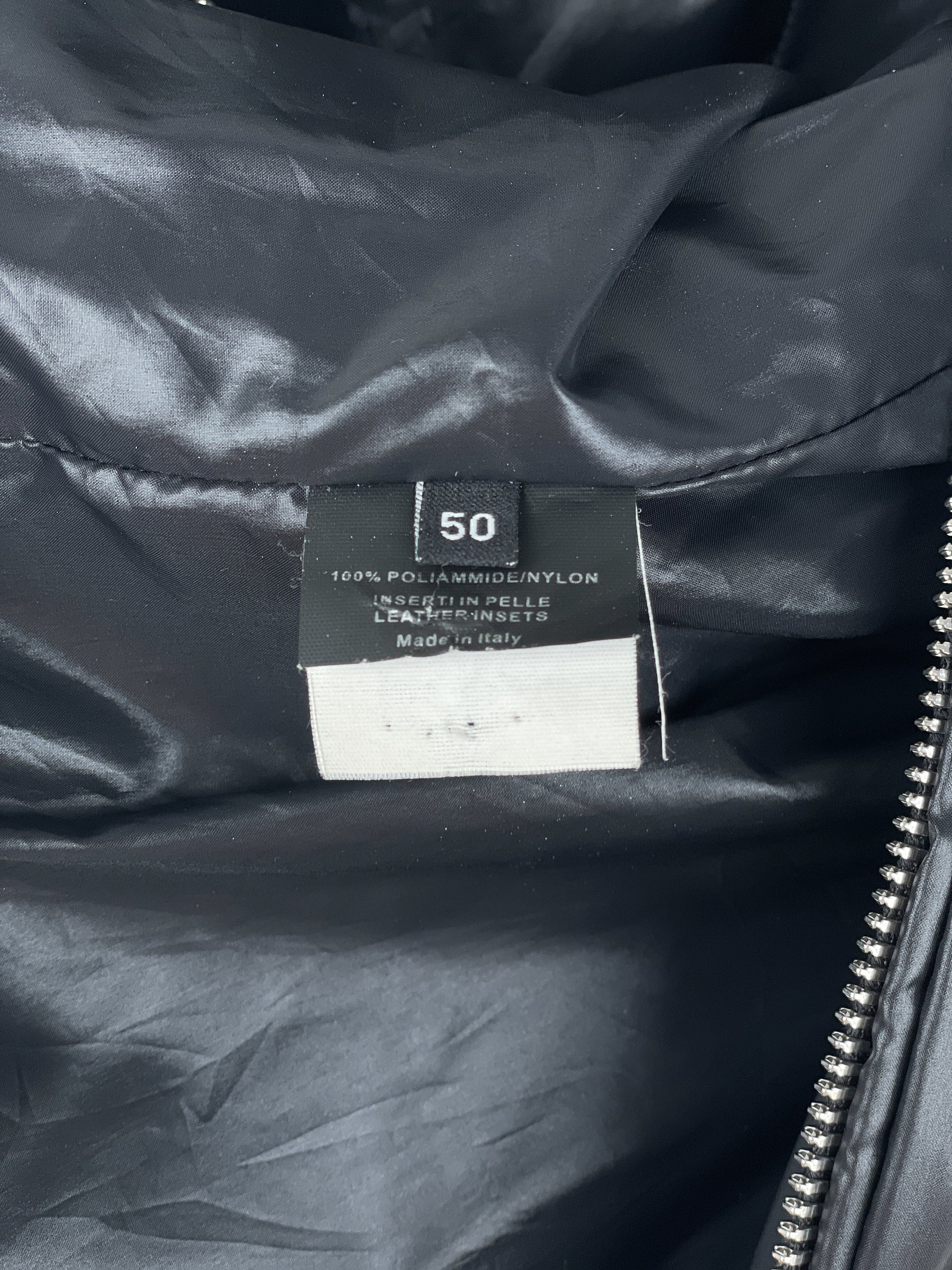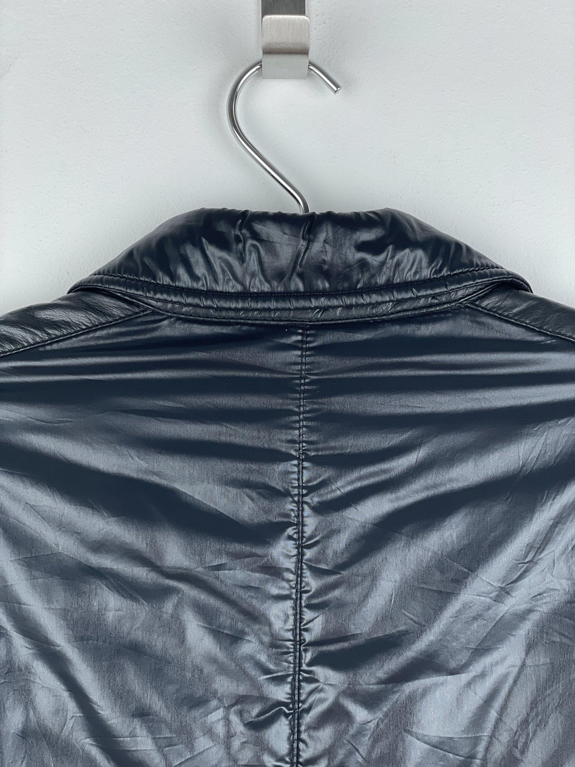 Black down jacket with slightly shiny finish, featuring ribbed biker details throughout and an angular chest pocket, from the autumn-winter 1997 collection.