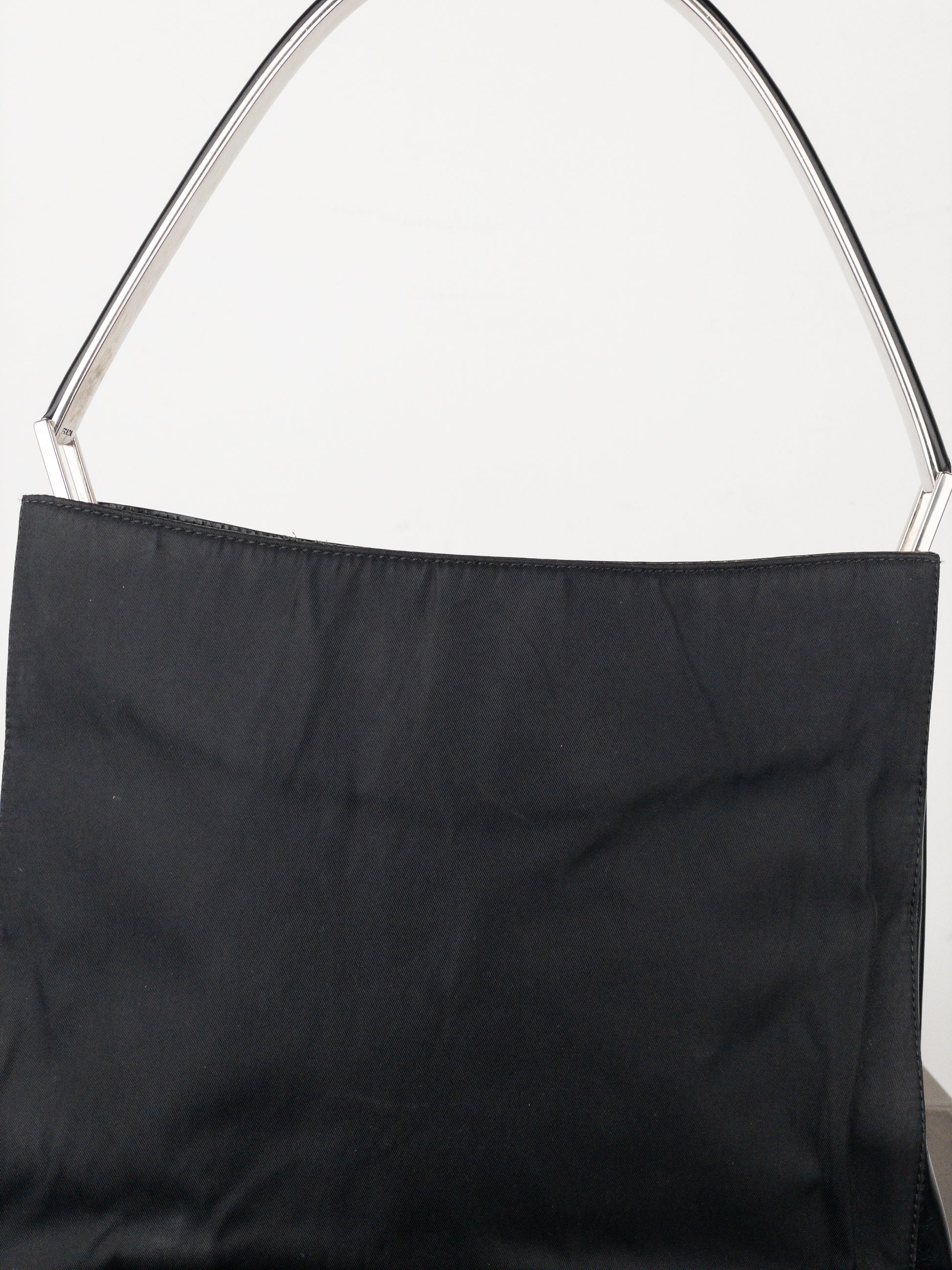 Black leather shoulder bag with rigid silver-colored metal handle trimmed with black leather, from the autumn-winter 1998 collection. Featured in the ad campaign.
