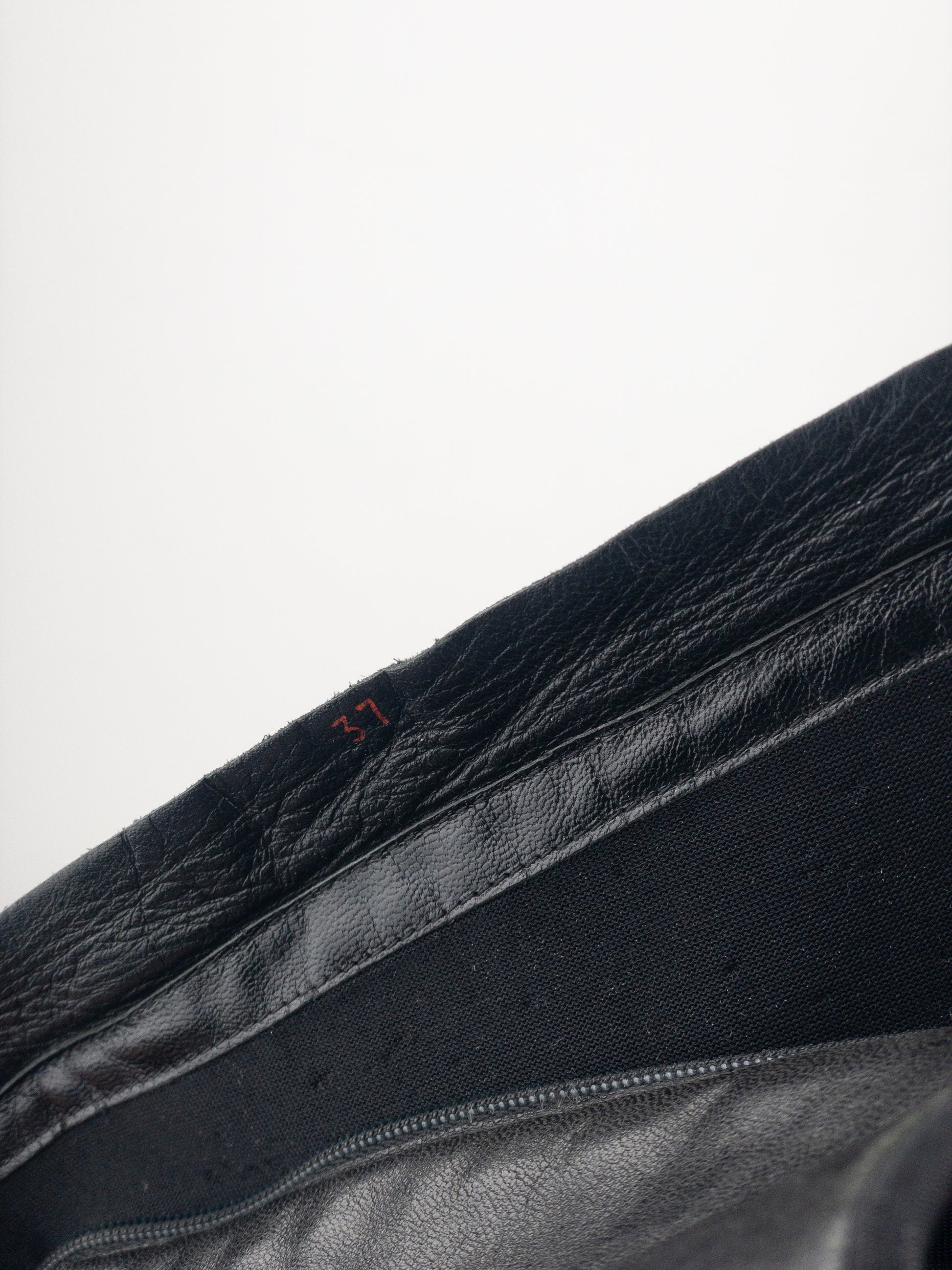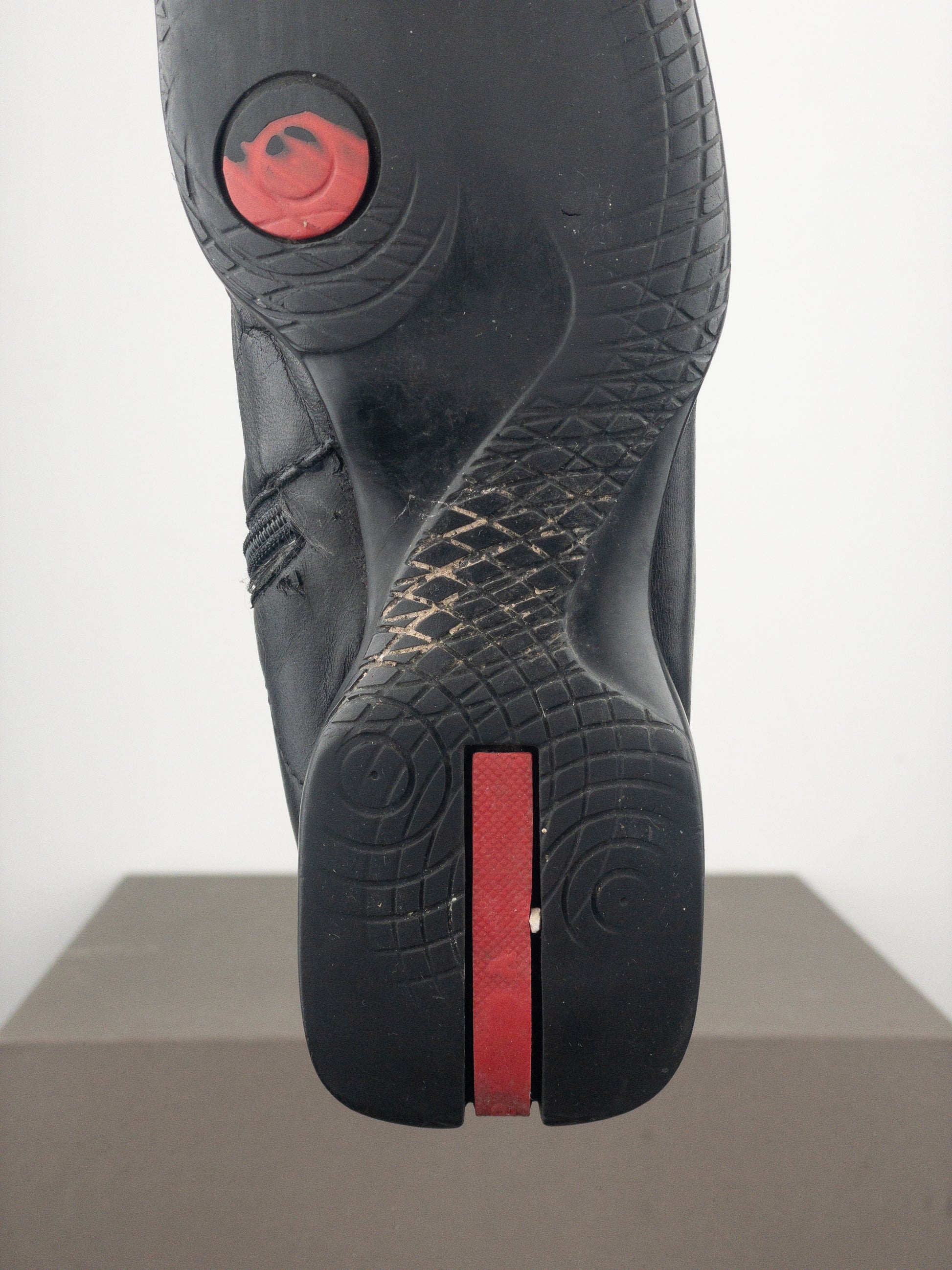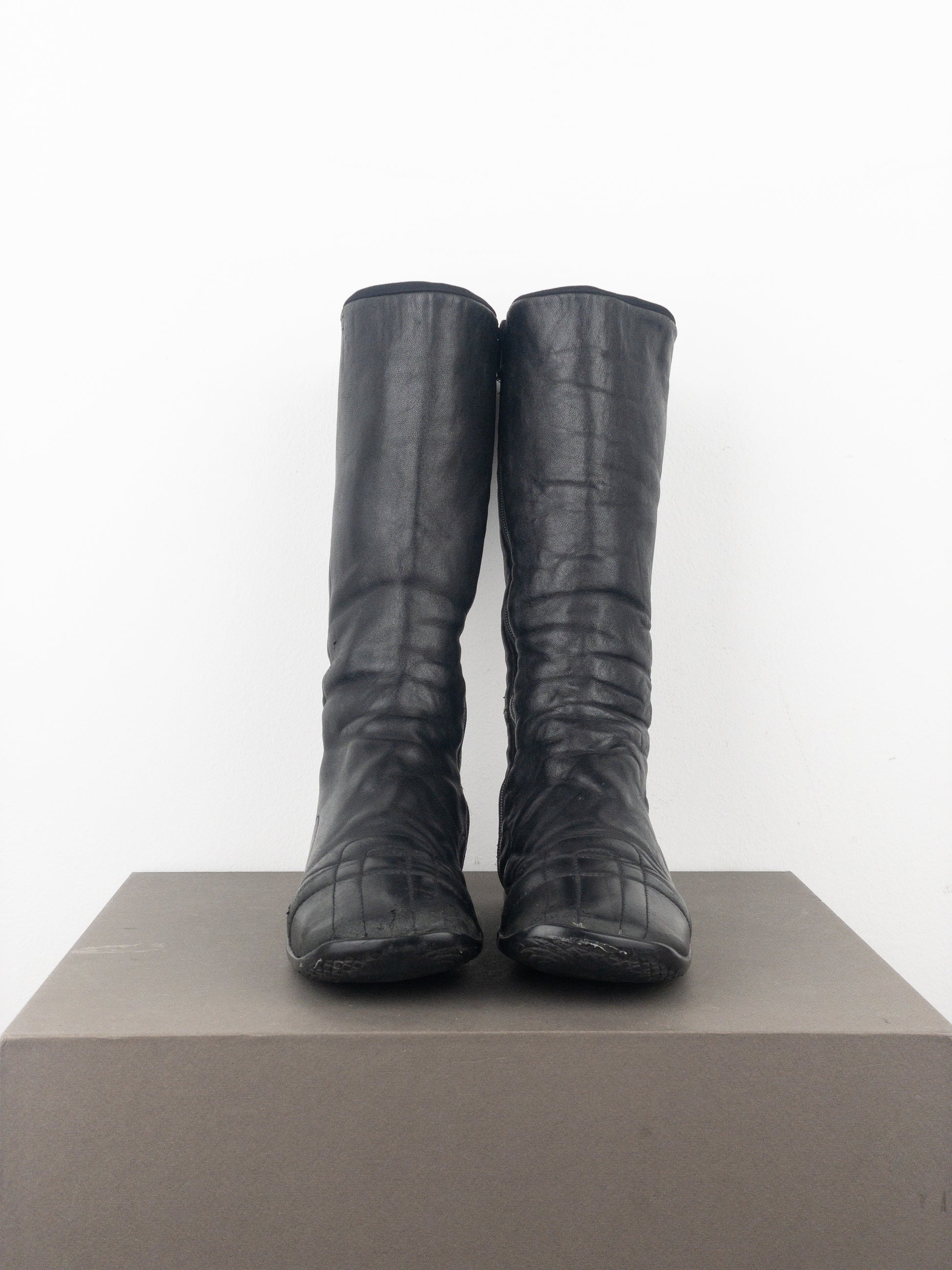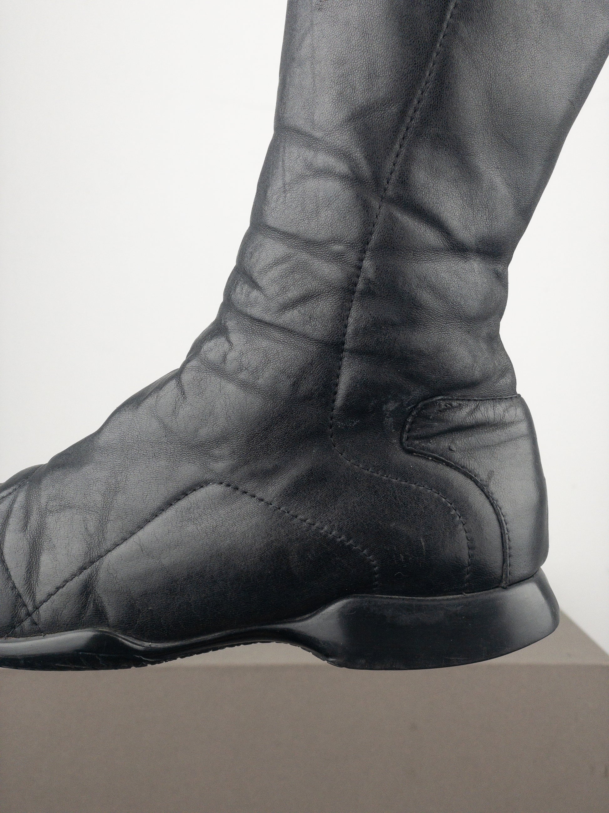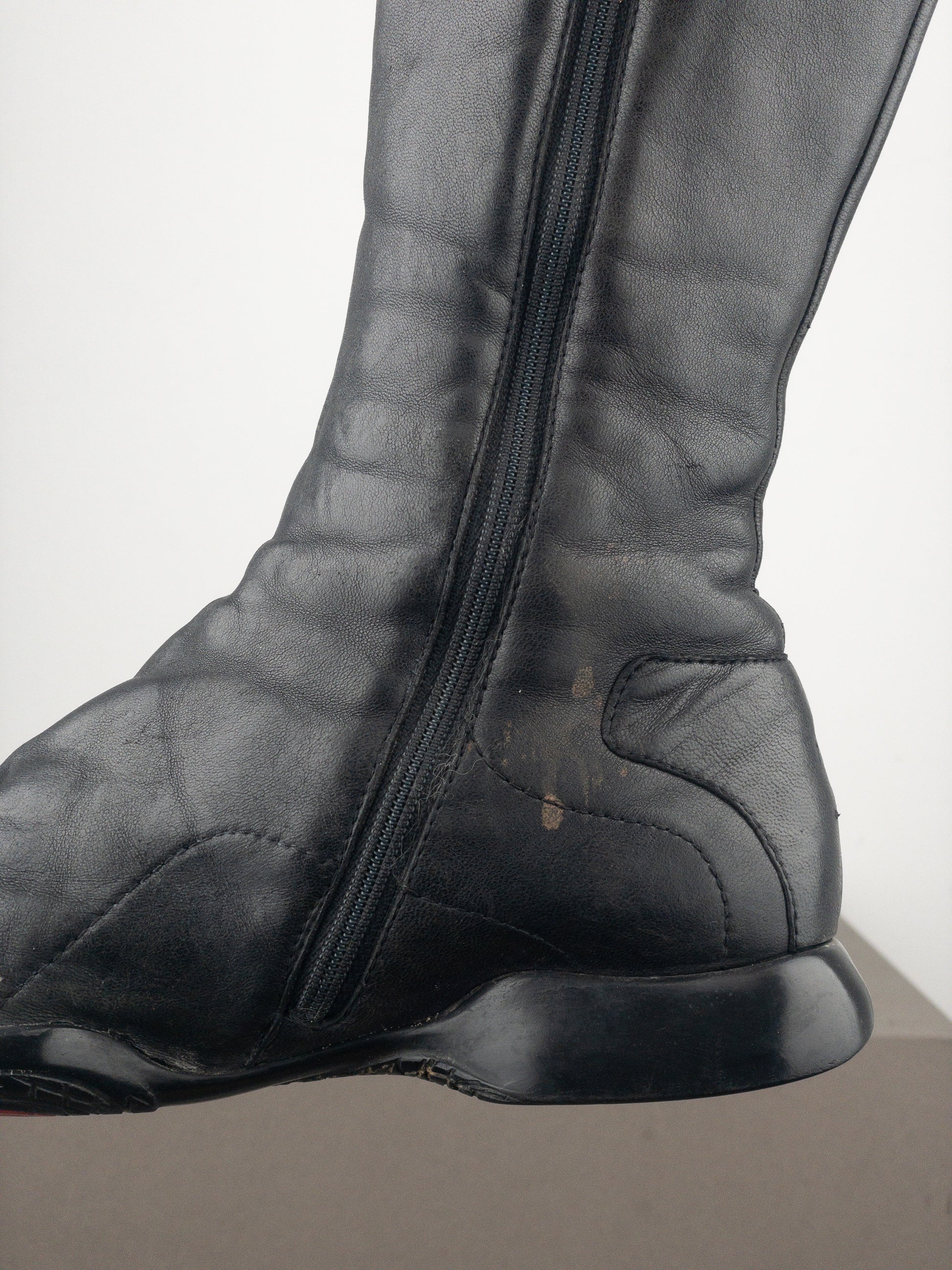 Knee high black leather boots with a prominent square toe, a chunky ‘Sport’ rubber sole, decorative seams throughout, and a zipper on the inside of the shaft, from the autumn-winter 1999 collection.