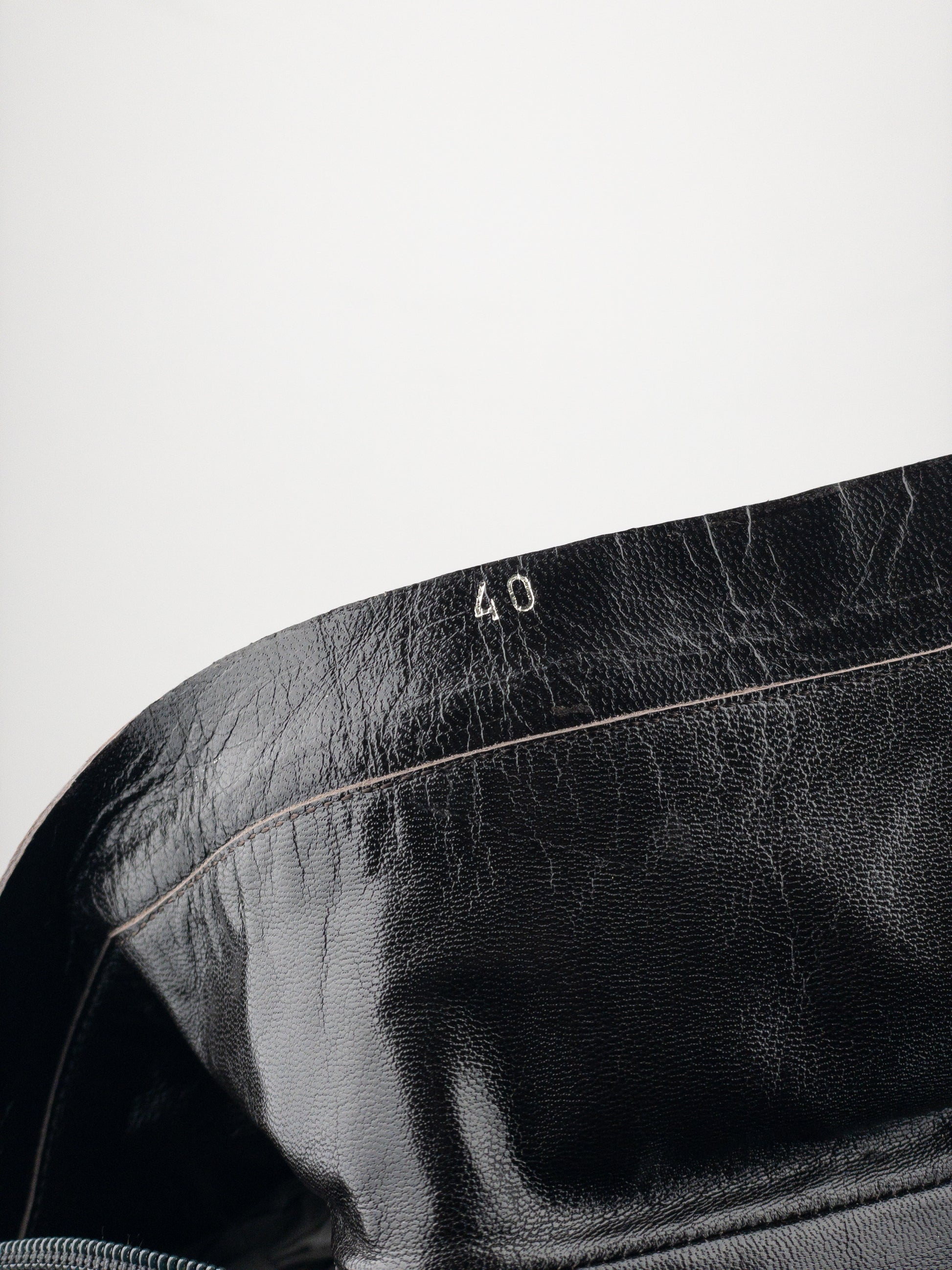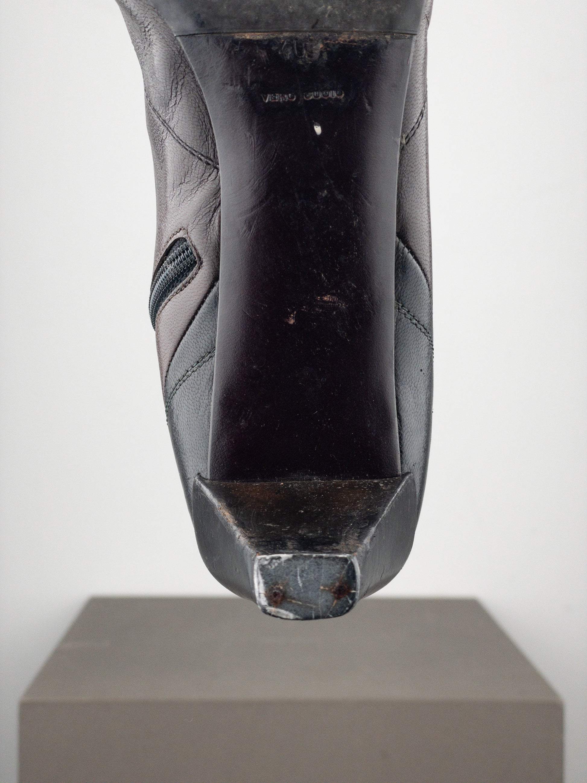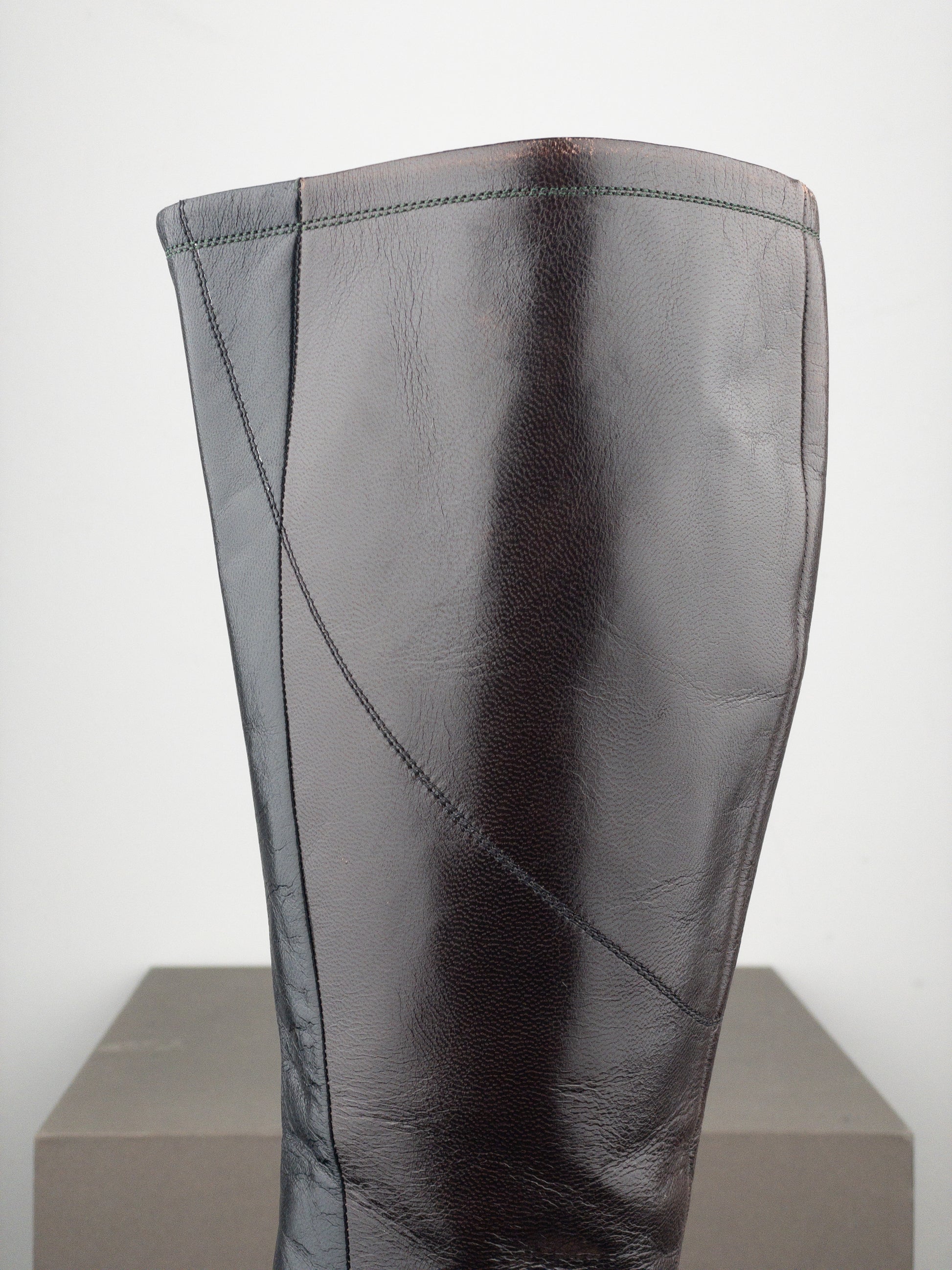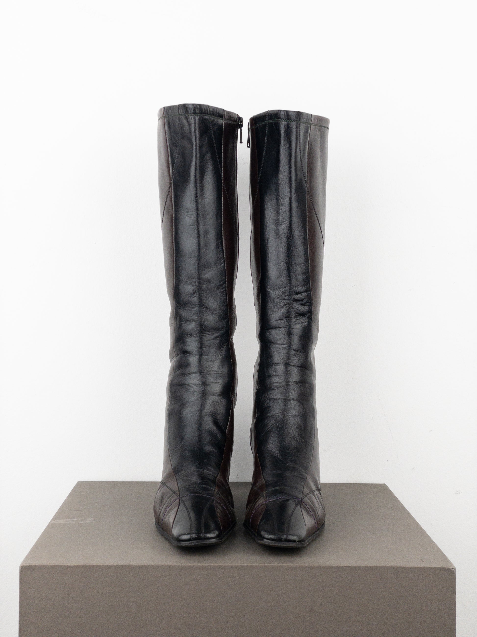 Knee-high leather boots made up of black and dark-brown panels, featuring a square toe, an angular kitten heel, decorative seams throughout, and a zipper on the inside of the shaft, from the autumn-winter 1999 collection.