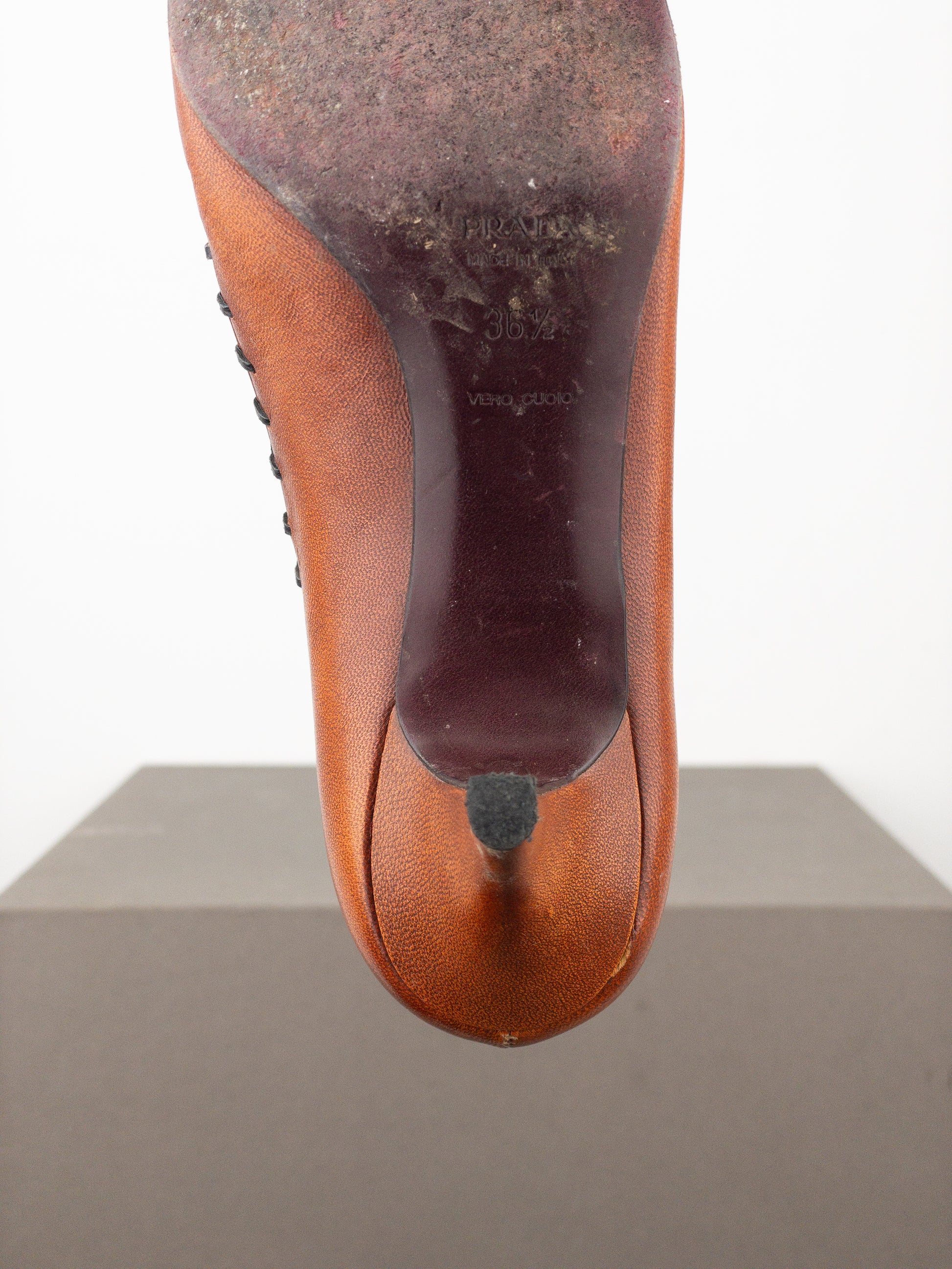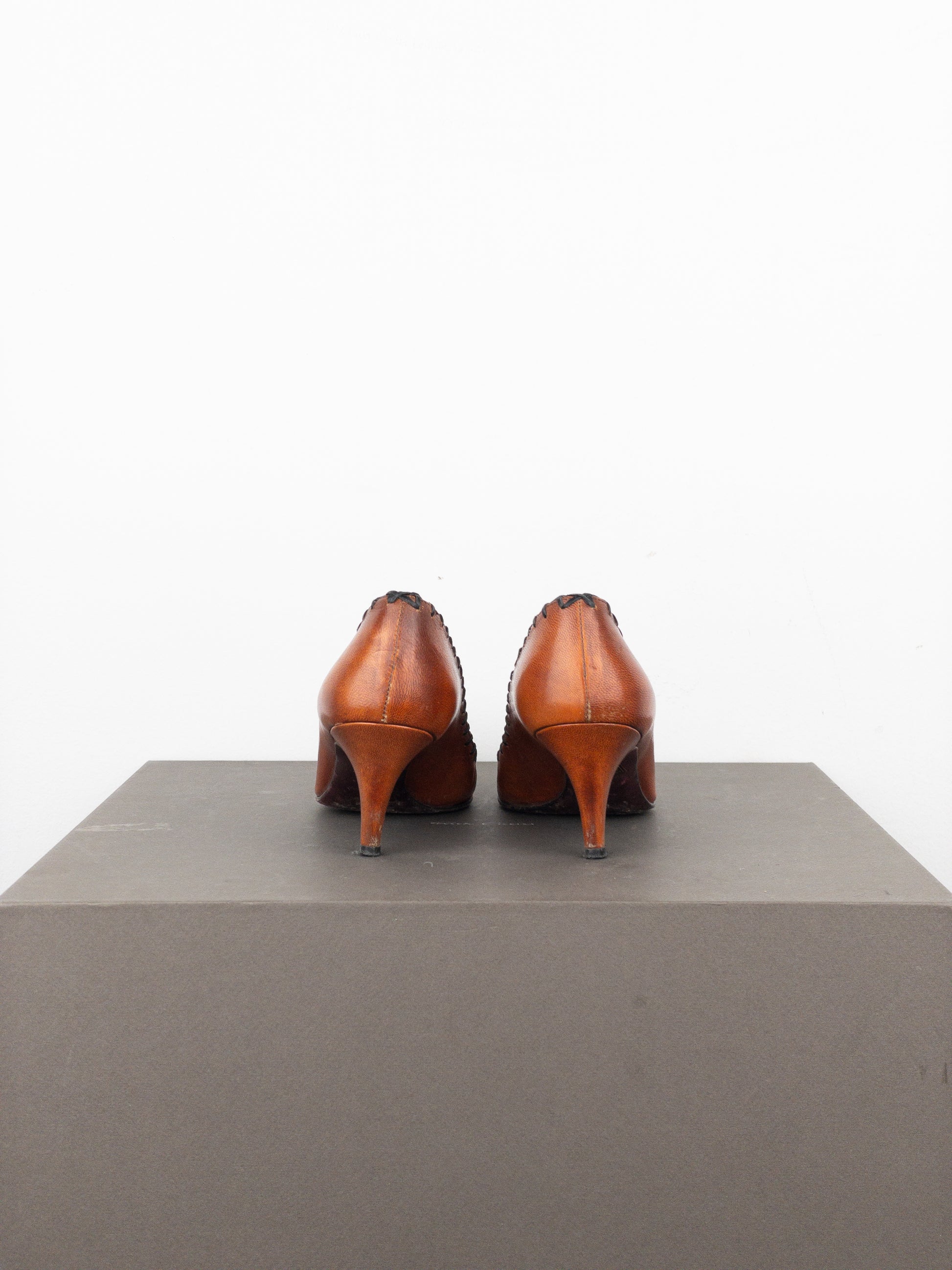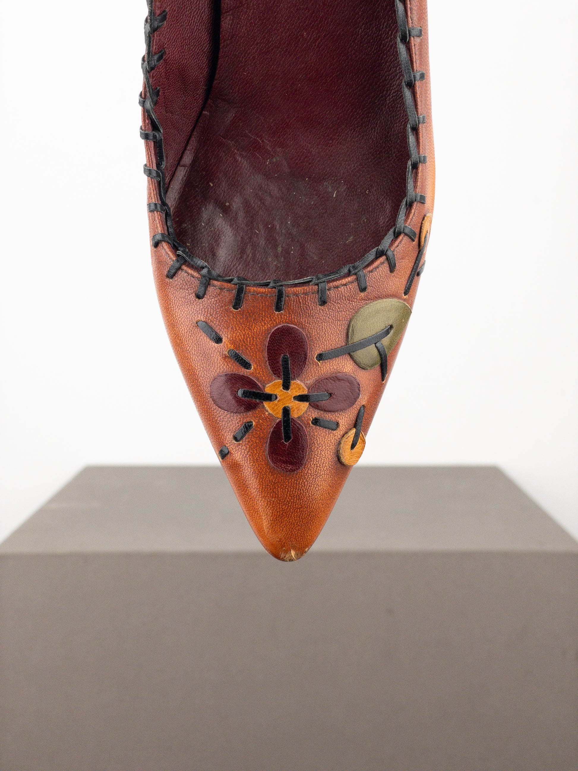 Dark brown leather pumps with a pointed toe and a kitten heel, featuring a stitched edge and leather leaves and flowers on the toebox, from the autumn-winter 1999 collection.