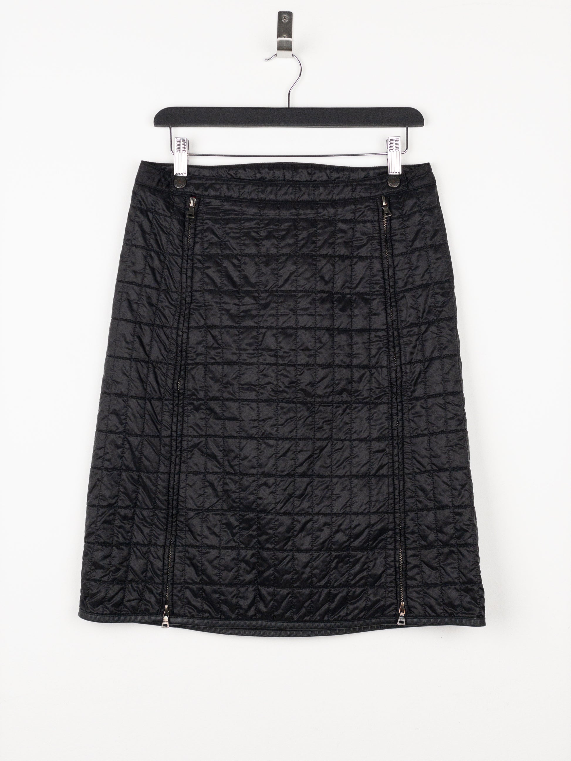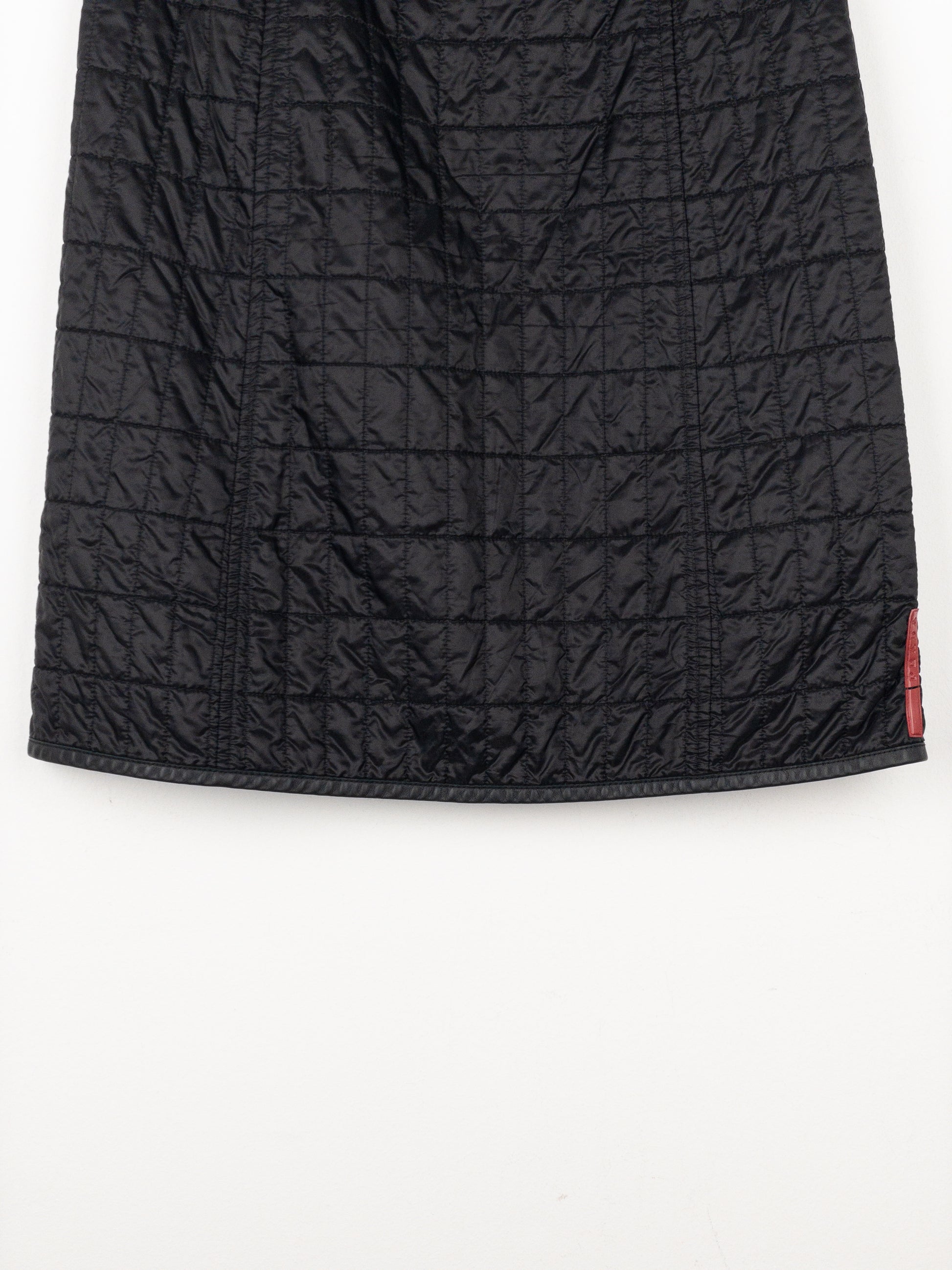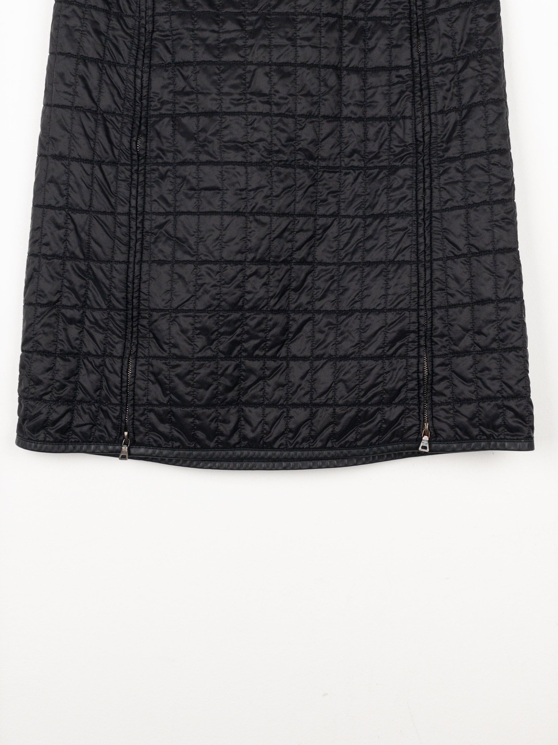 Quilted black midi-skirt with slight padding and two zippers down the front, featuring the signature red “Linea Rossa” tab at the bottom, from the autumn-winter 1999 collection.