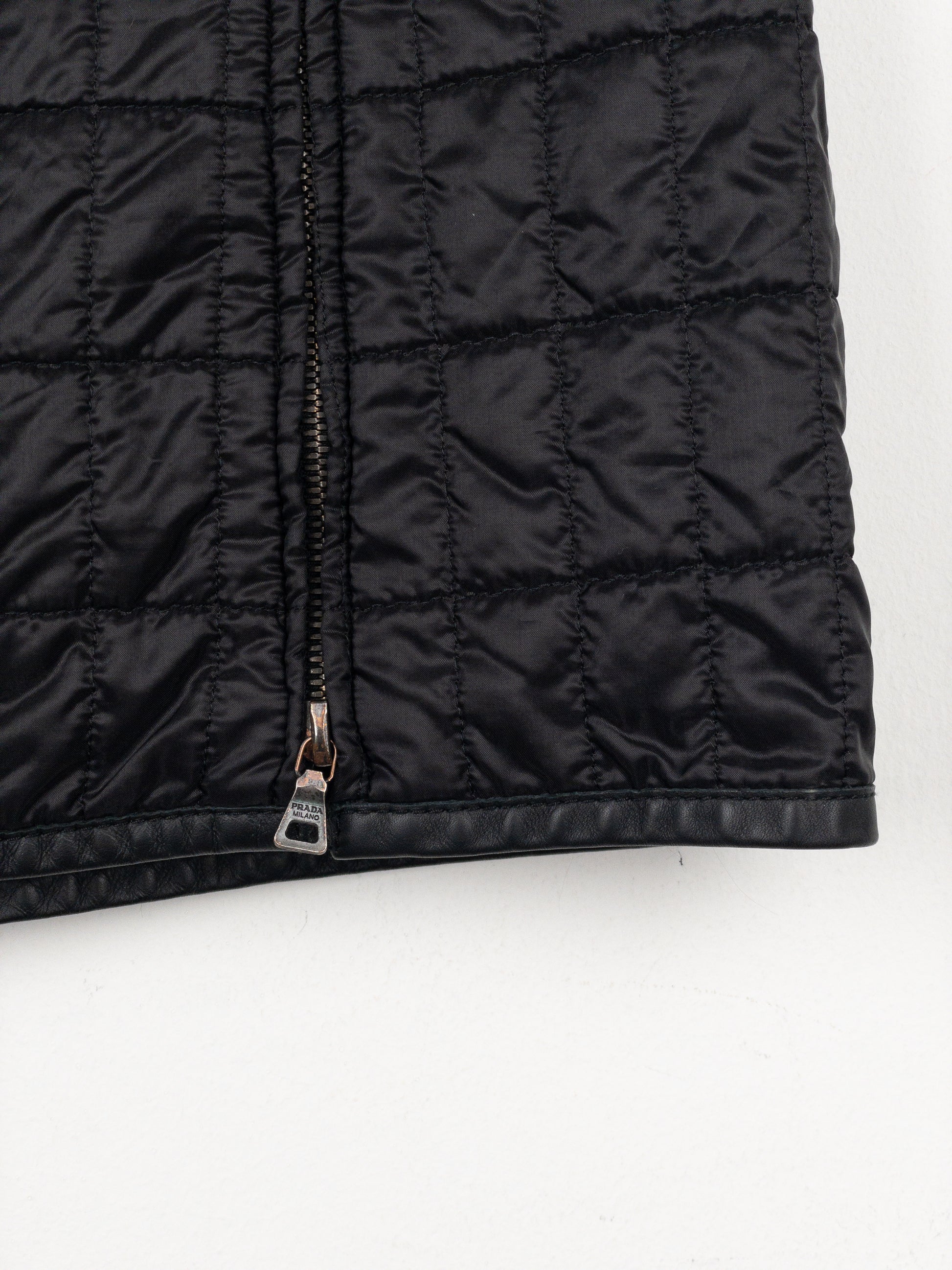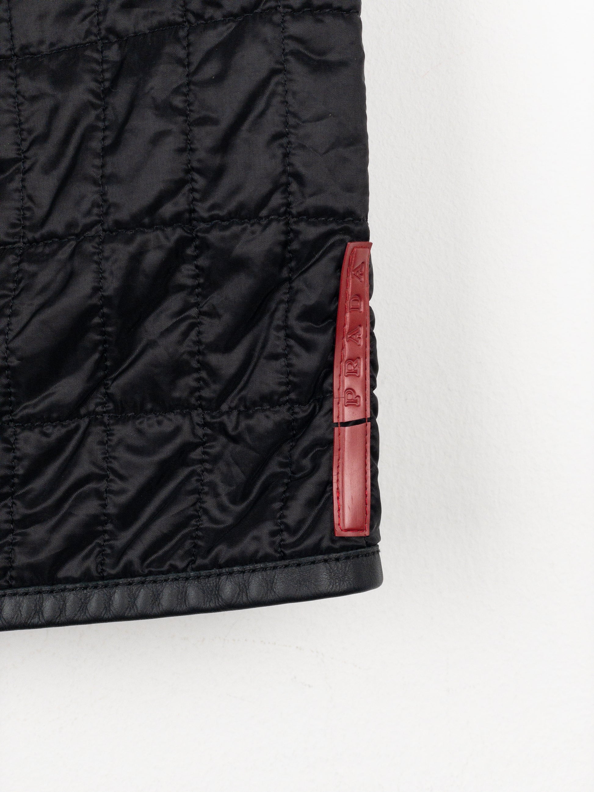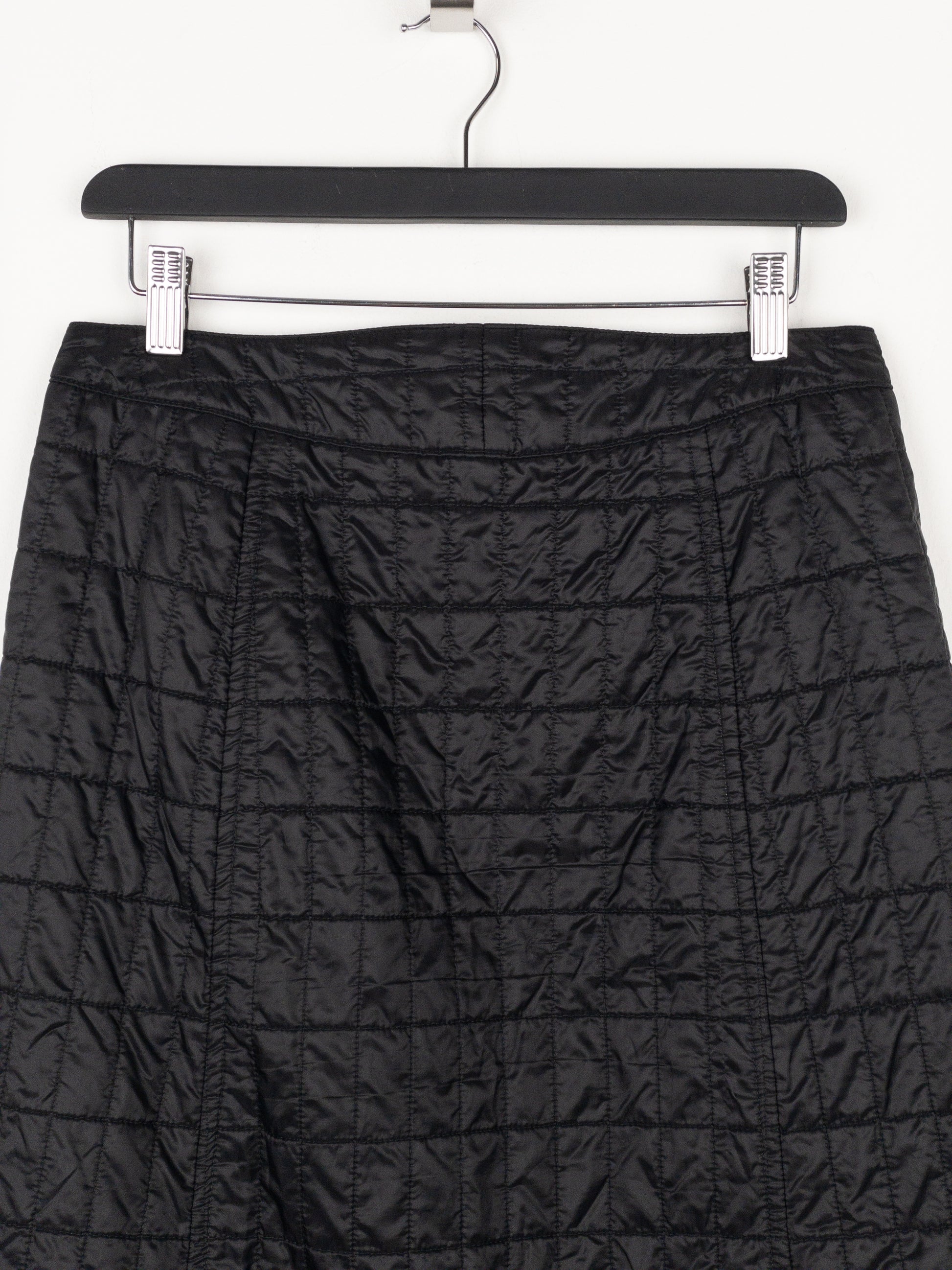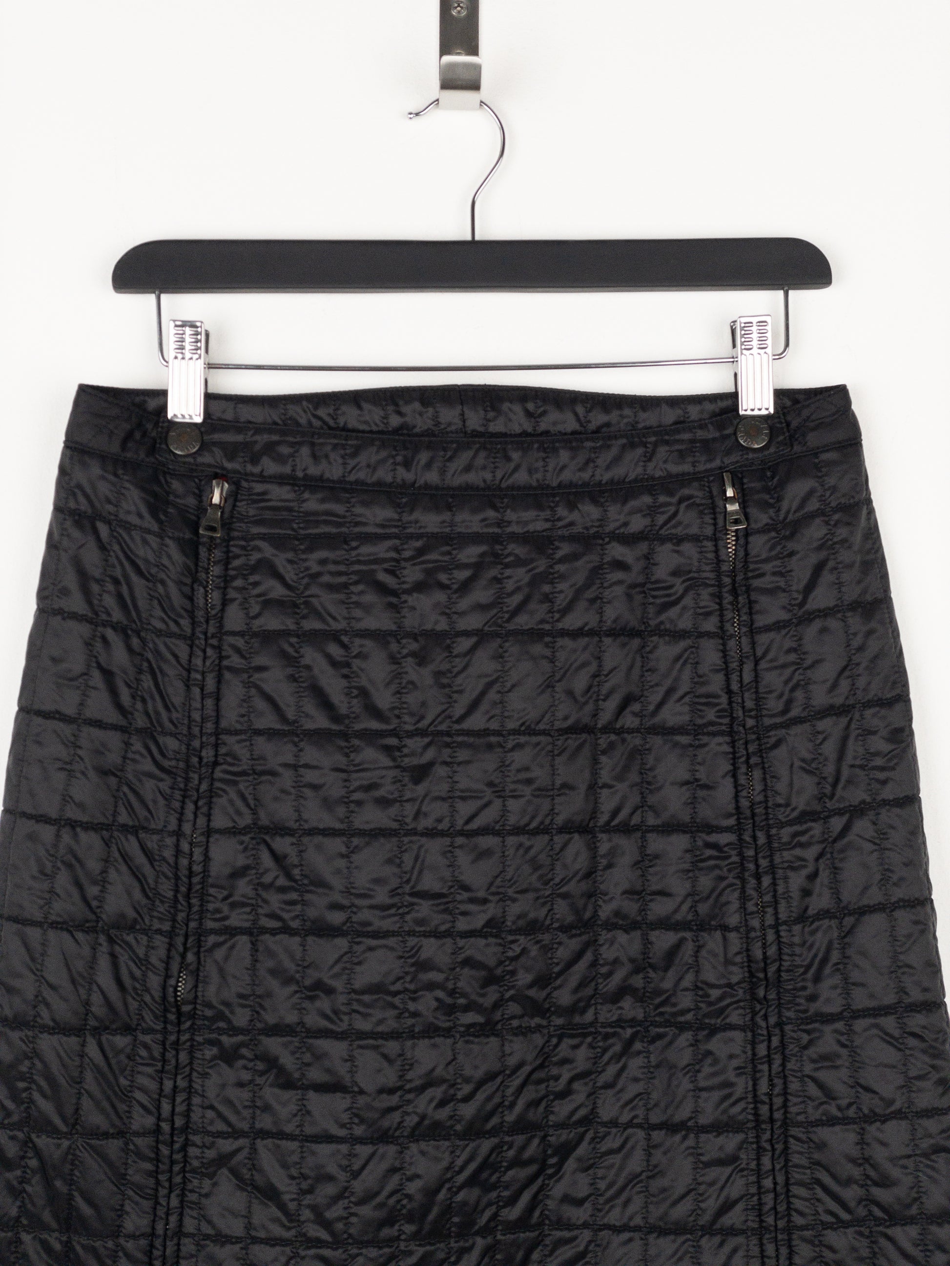 Quilted black midi-skirt with slight padding and two zippers down the front, featuring the signature red “Linea Rossa” tab at the bottom, from the autumn-winter 1999 collection.