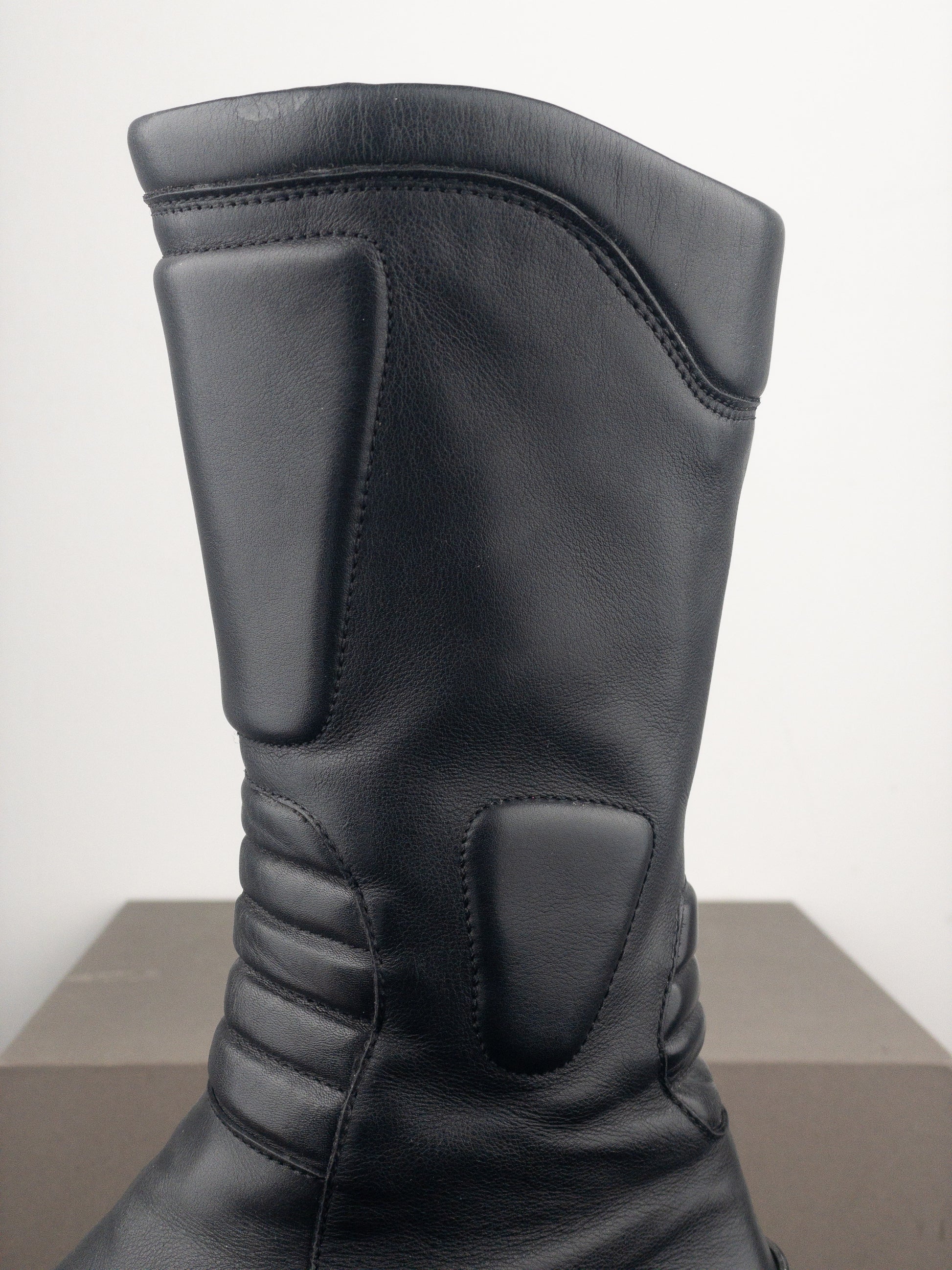 Black leather mid-calf boots with a prominent sqare toe and an angular sculptural sole, featuring padded and ribbed biker details throughout the shaft, from the autumn-winter 1999 collection.