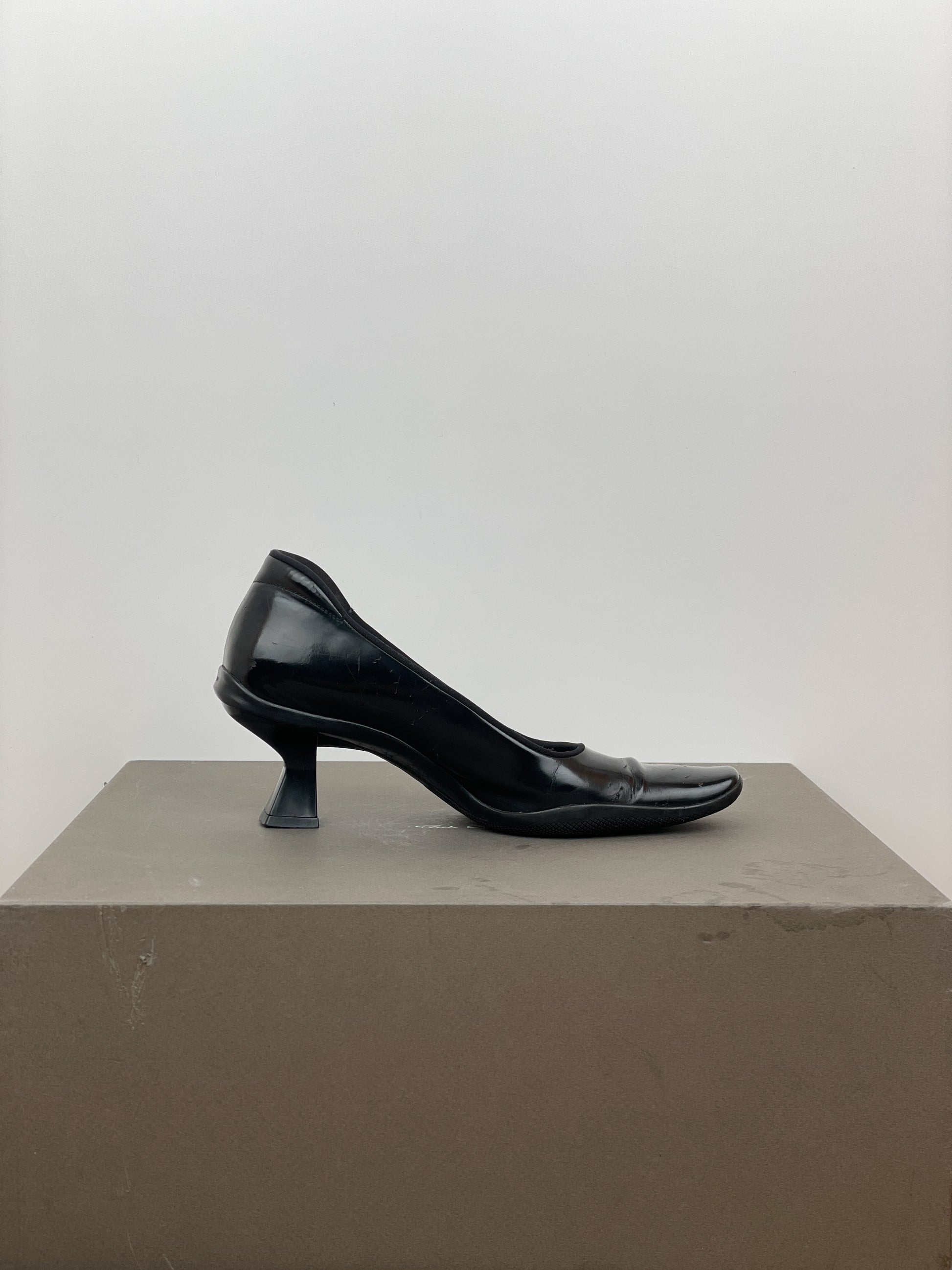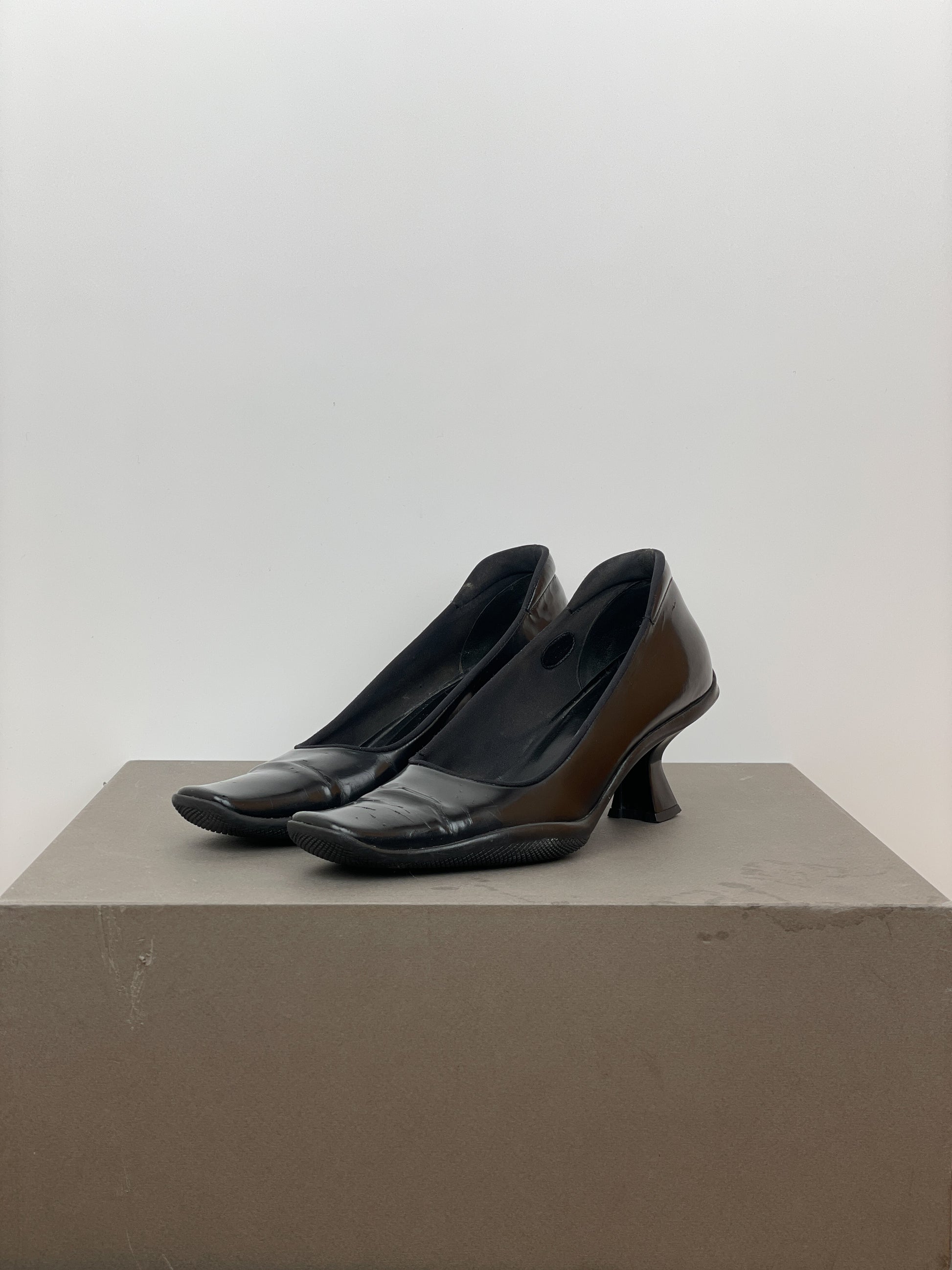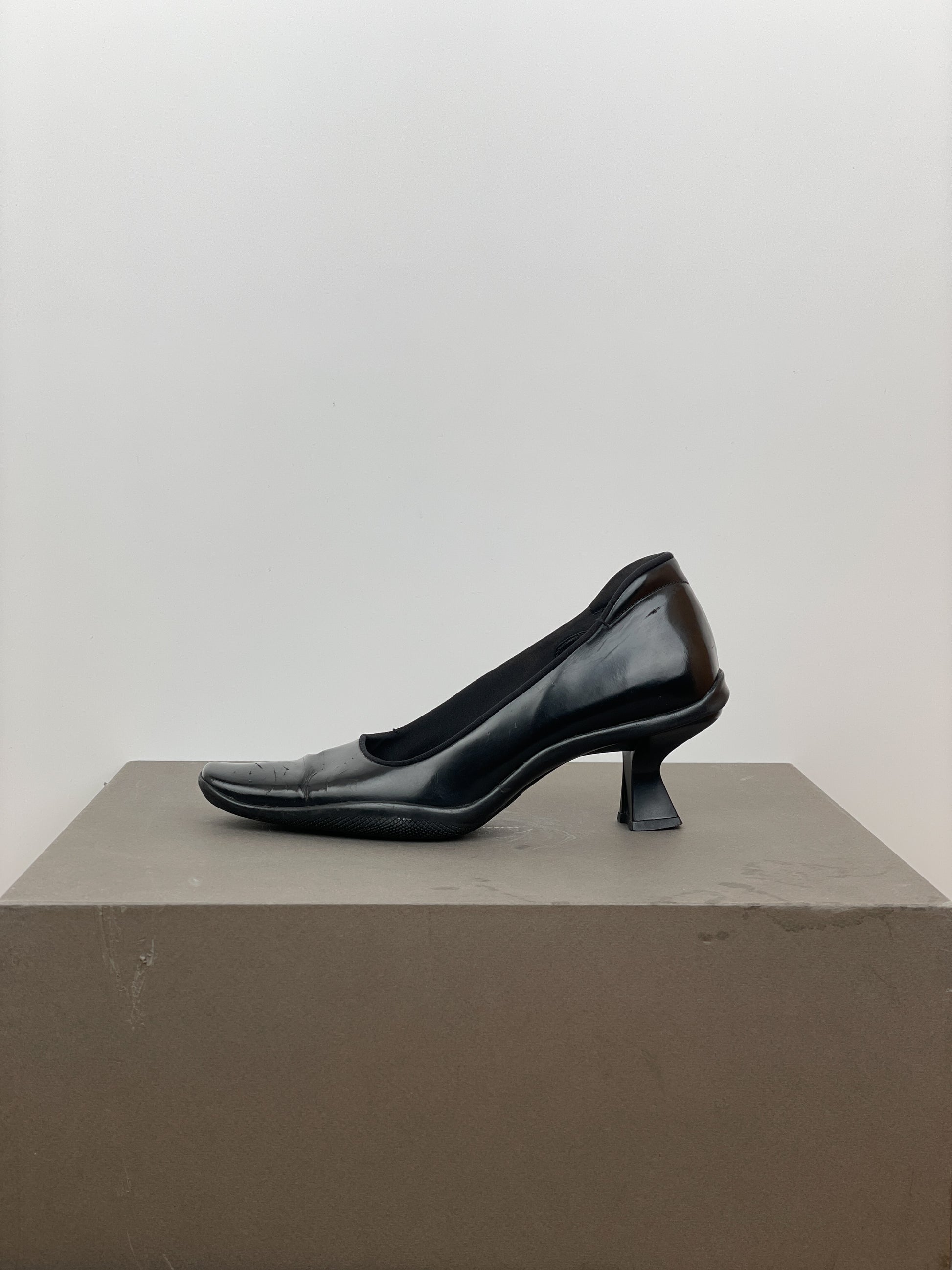 Pump Heels in black leather with a square toe, featuring a flared kitten heel and the signature sports sole, from the autumn-winter 1999 collection.