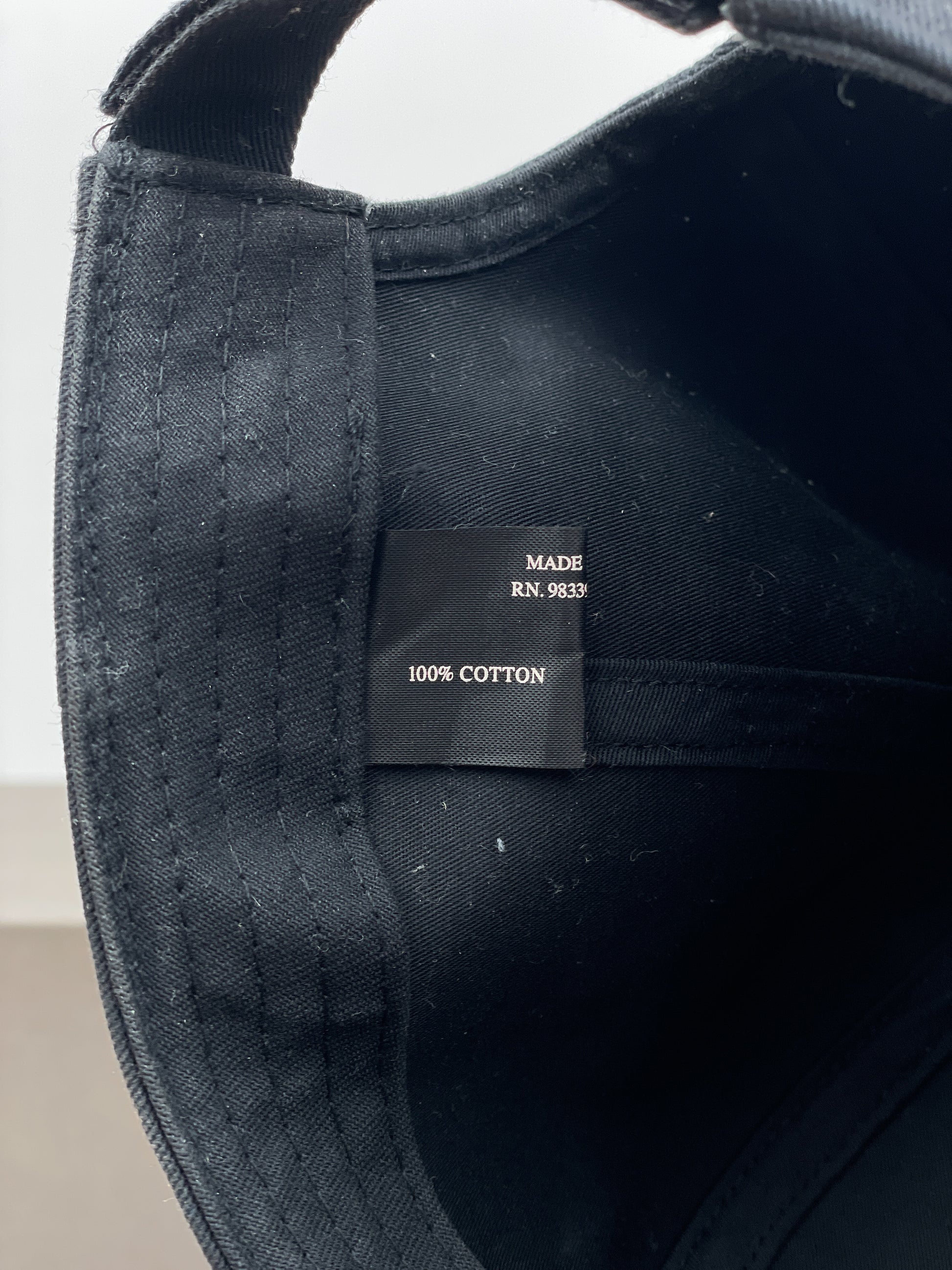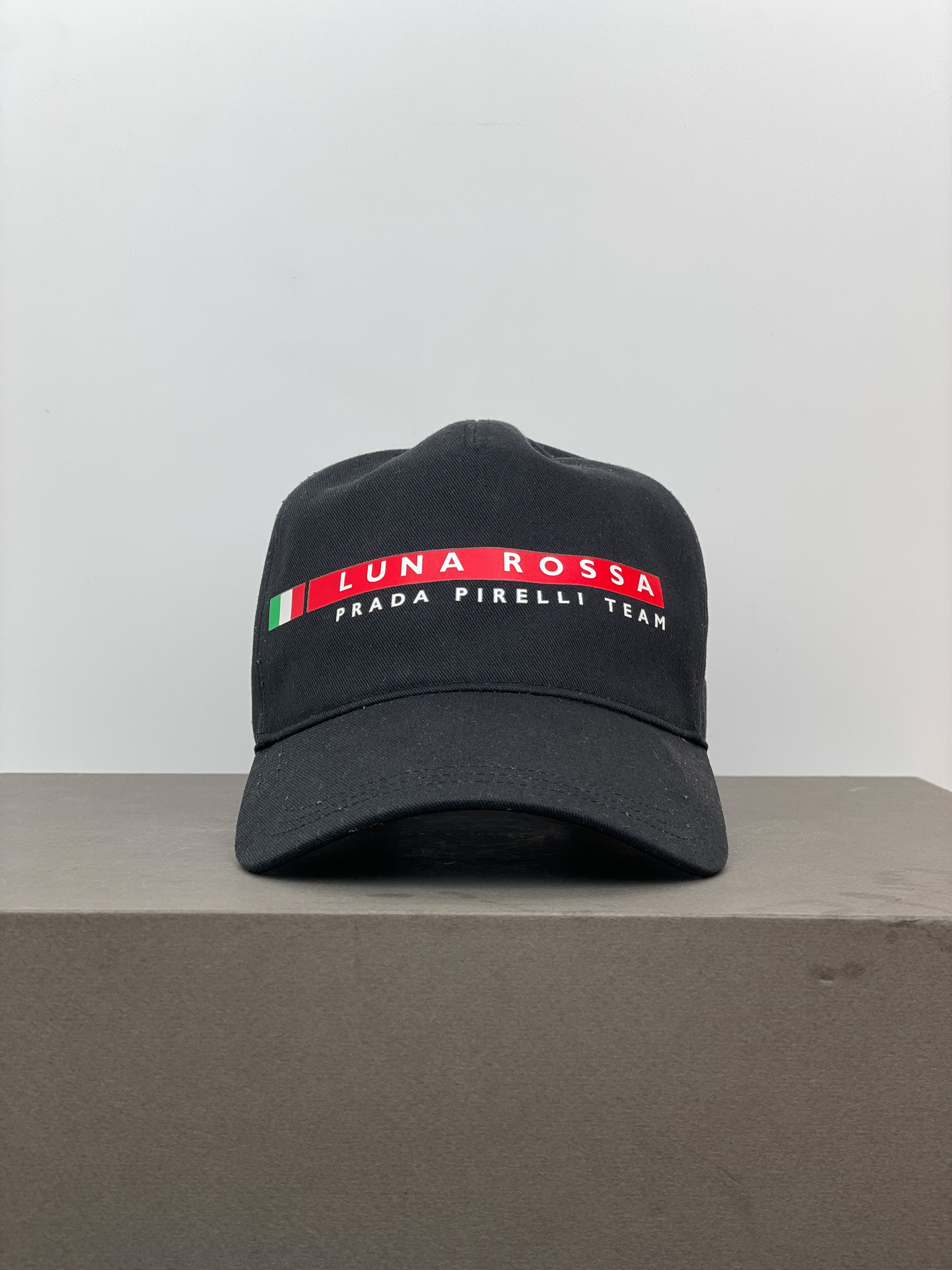 Black baseball cap with the signature “Luna Rossa” and sponsor prints throughout, from the 2023 American Cup sailing race.