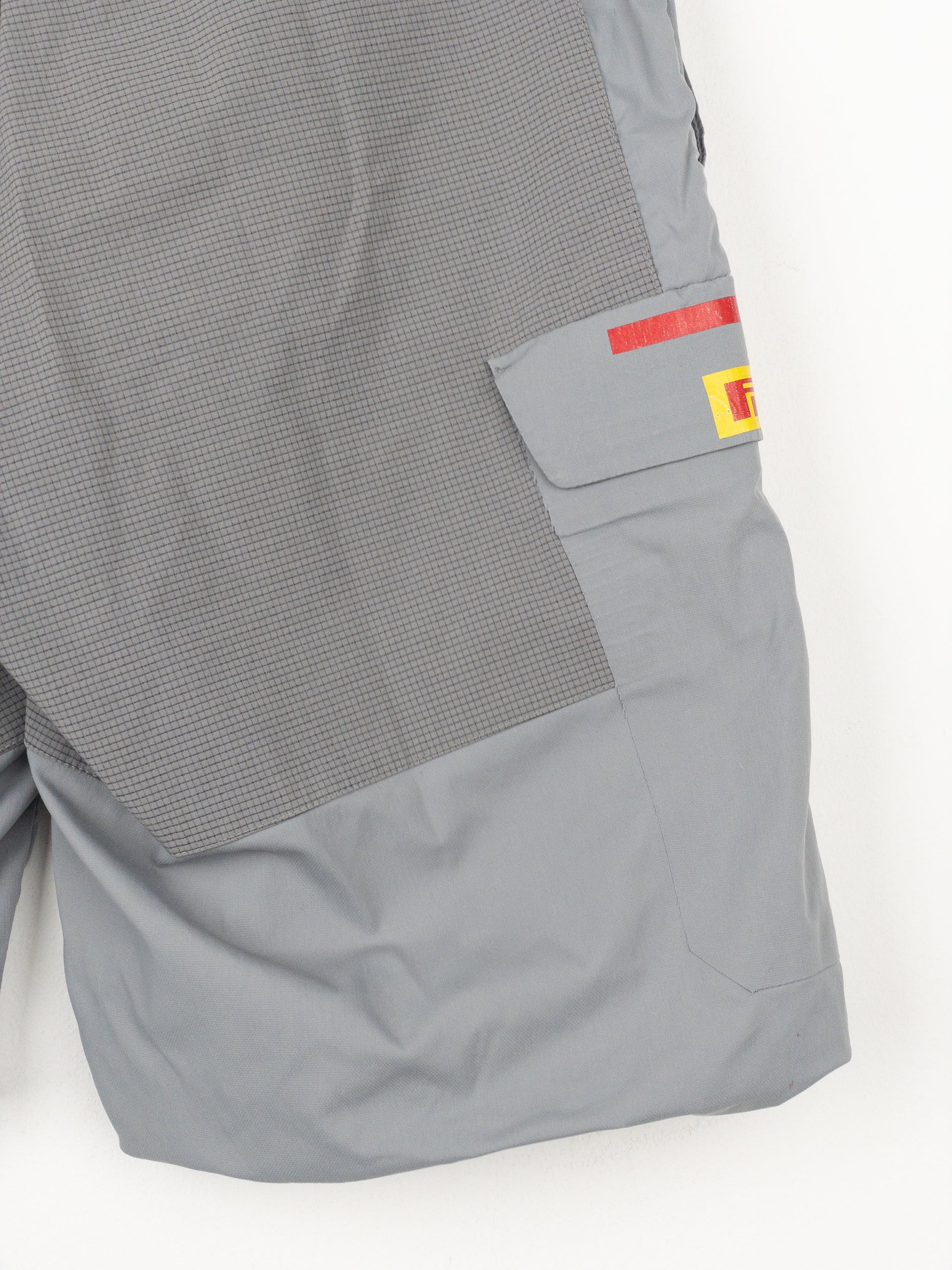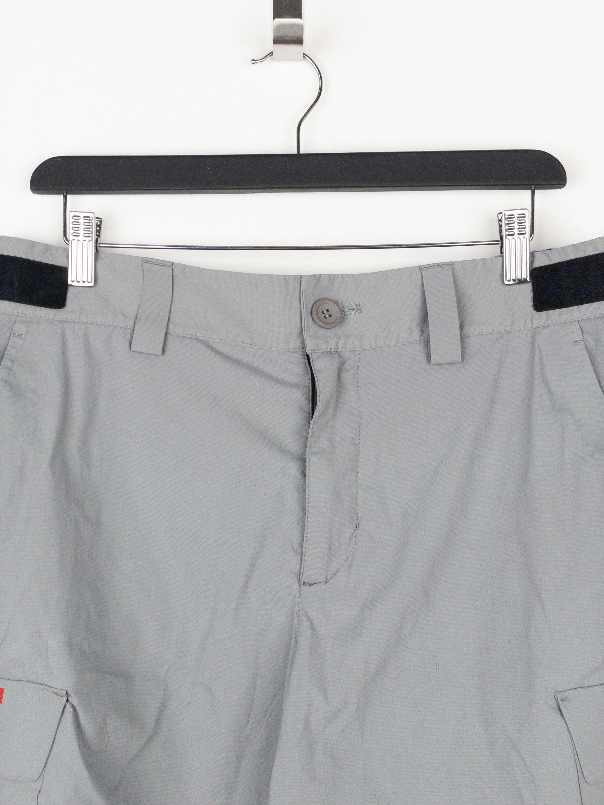 Light grey cargo shorts in water repellent fabric, featuring velcro straps at the waist to adjust the fit, an enforced ripstop panel in the back, and the signature “Luna Rossa” prints on the pockets, from the 2023 American Cup sailing race.