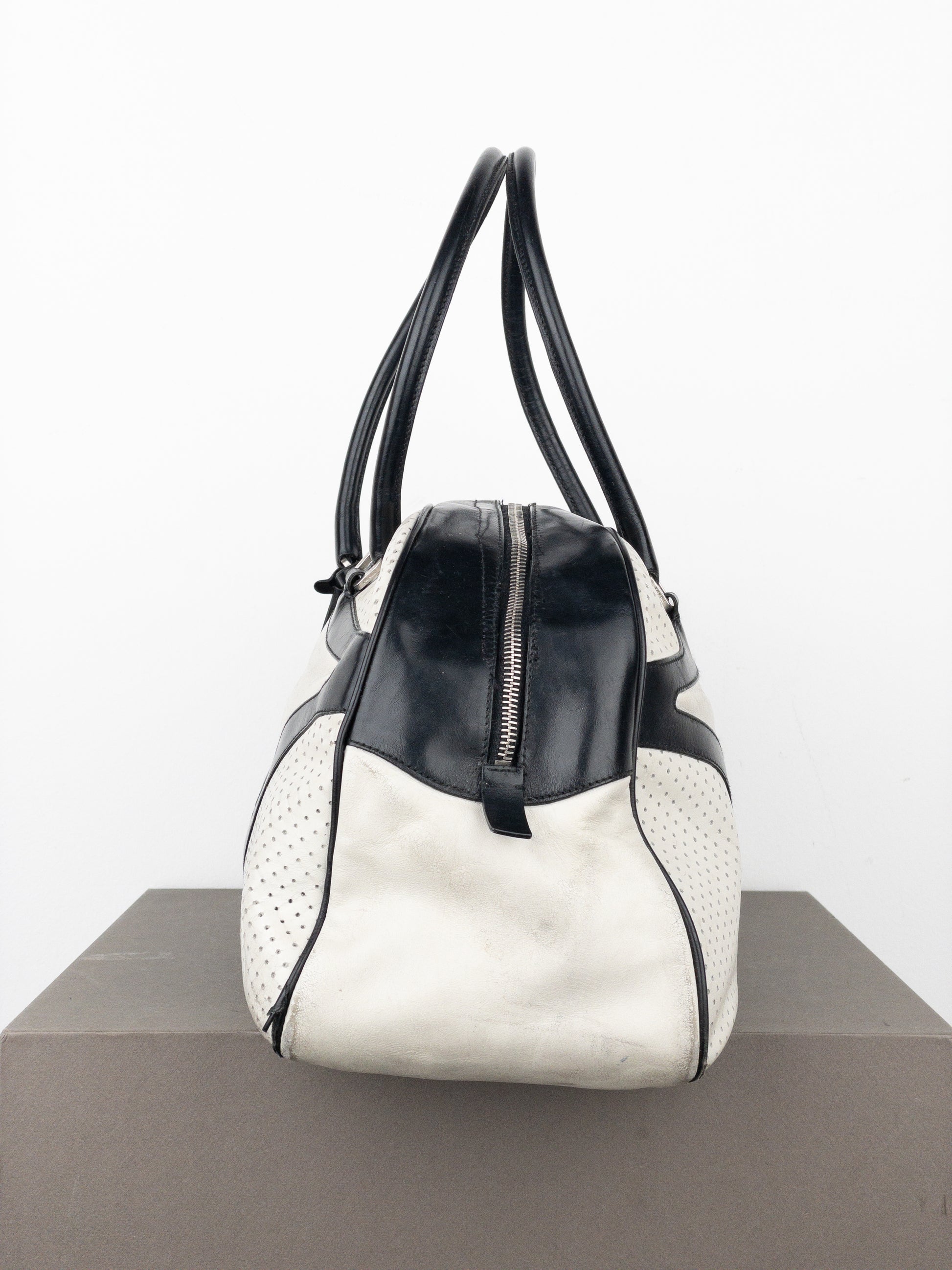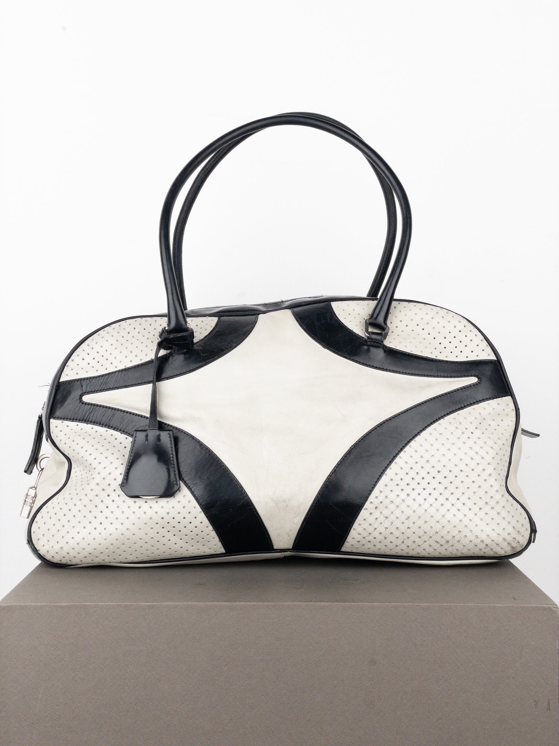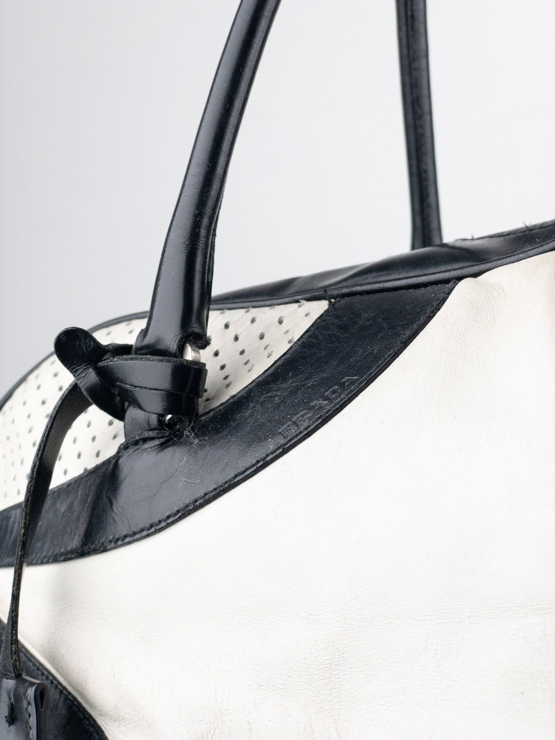 Black and white bowling shoulder bag in patent leather with decorative panelling and black piping, featuring perforated segments in the corners and a silver-colored metal padlock in the front, from the spring-summer 2000 collection.