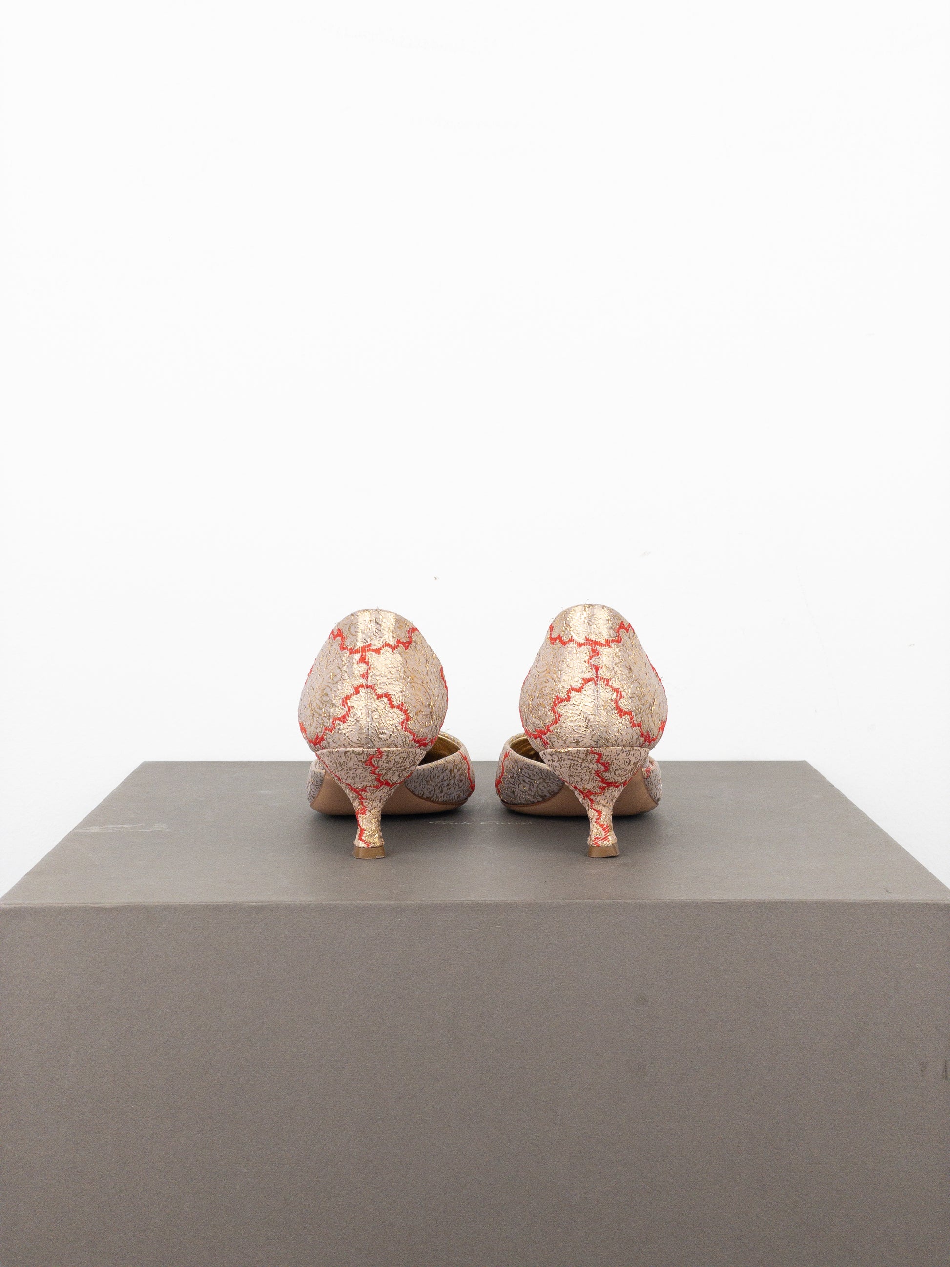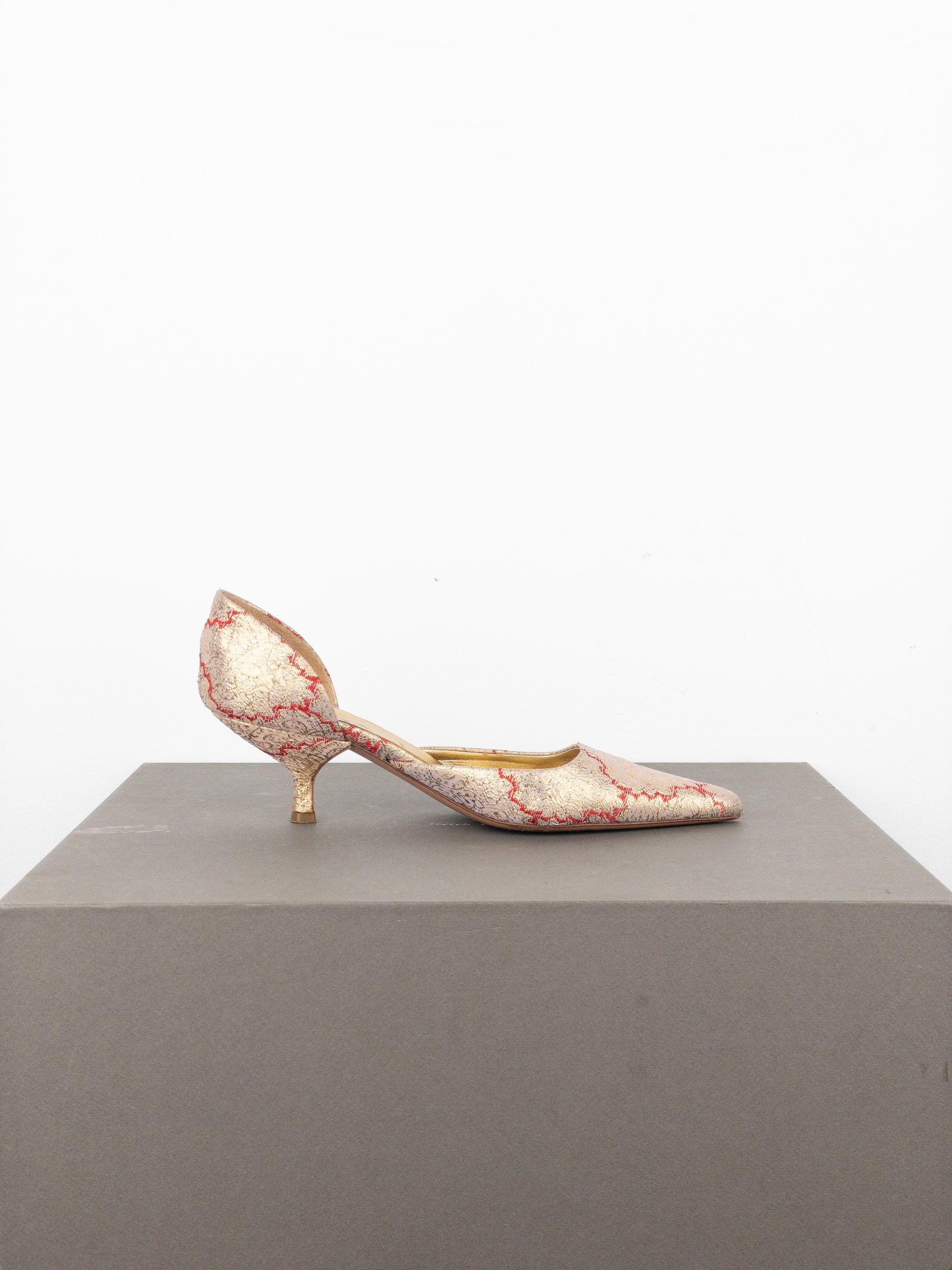 Pumps in gold-colored silk brocade with red details, featuring a pointed toe and a kitten heel, from the spring-summer 2002 collection. Seen on Carrie Bradshaw in Sex and the City Season 5 Episode 1.