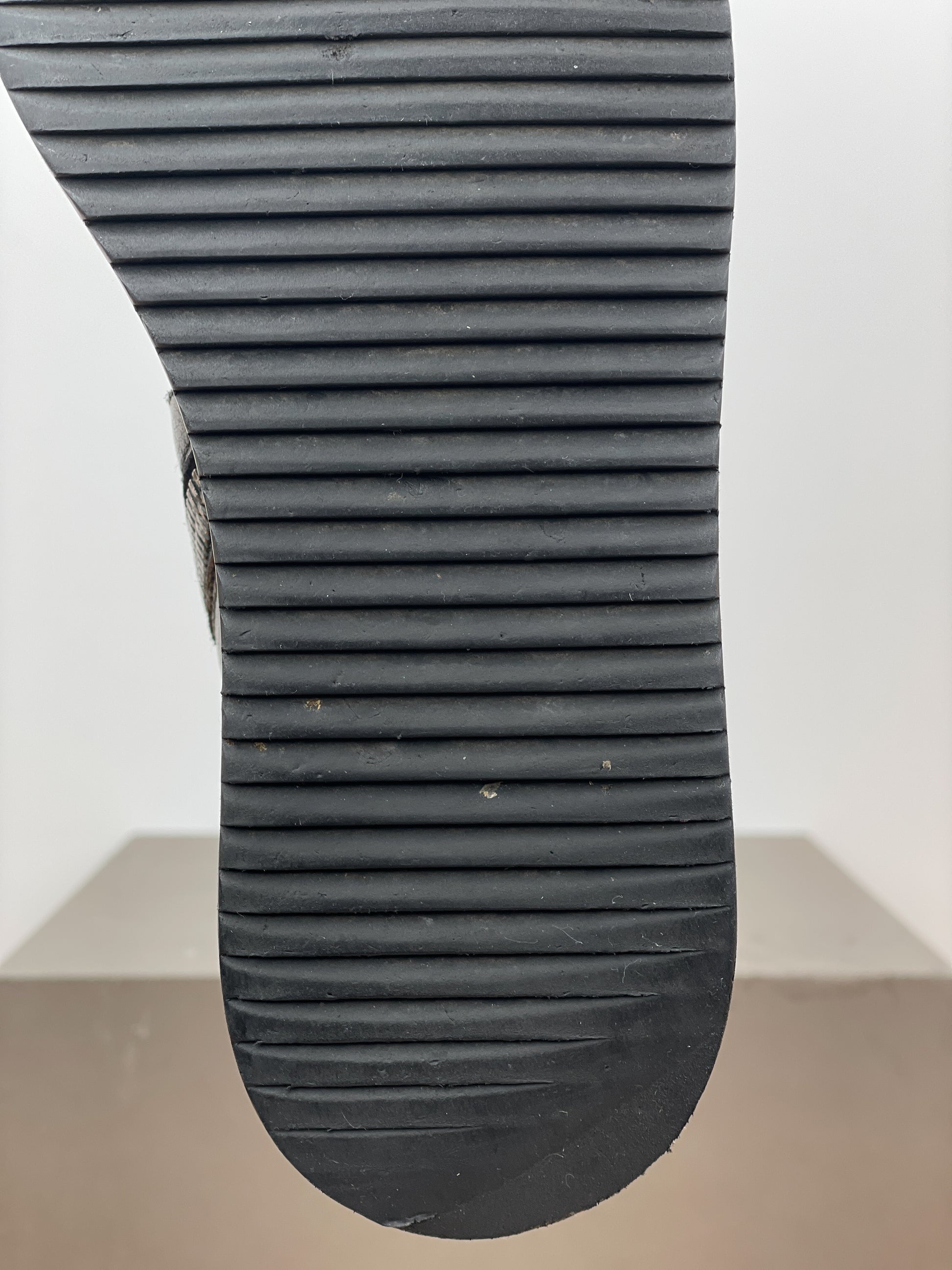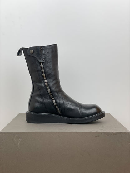 Black leather combat boots with a rounded toe, featuring a creeper sole and a zipper along the inside of the shaft, from the autumn-winter 2014 collection.