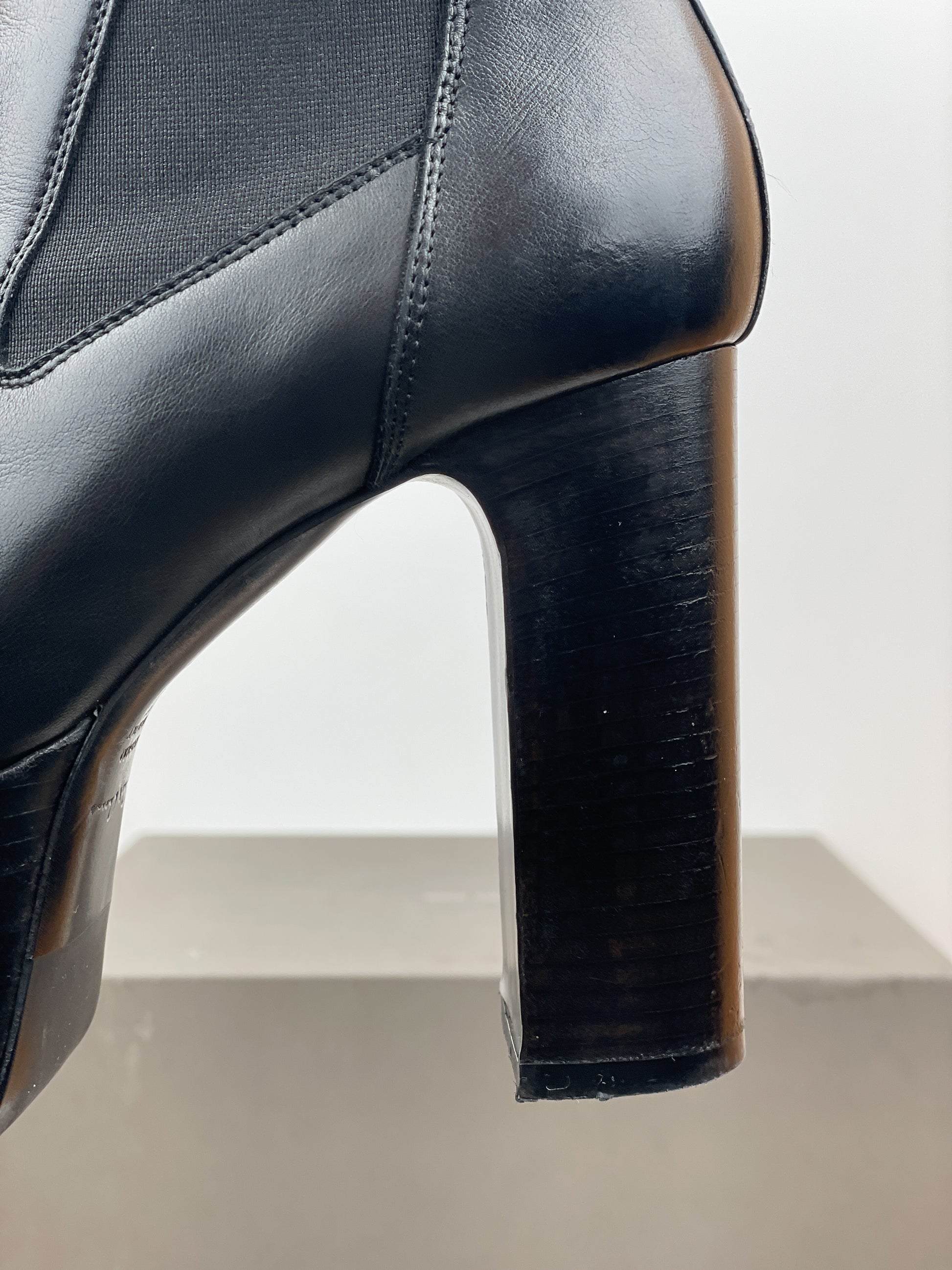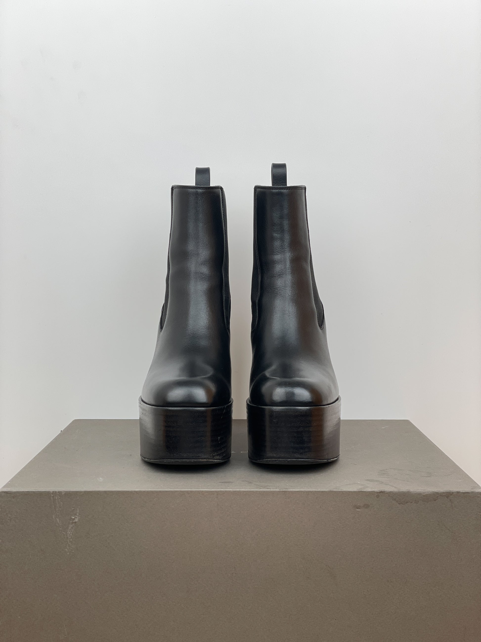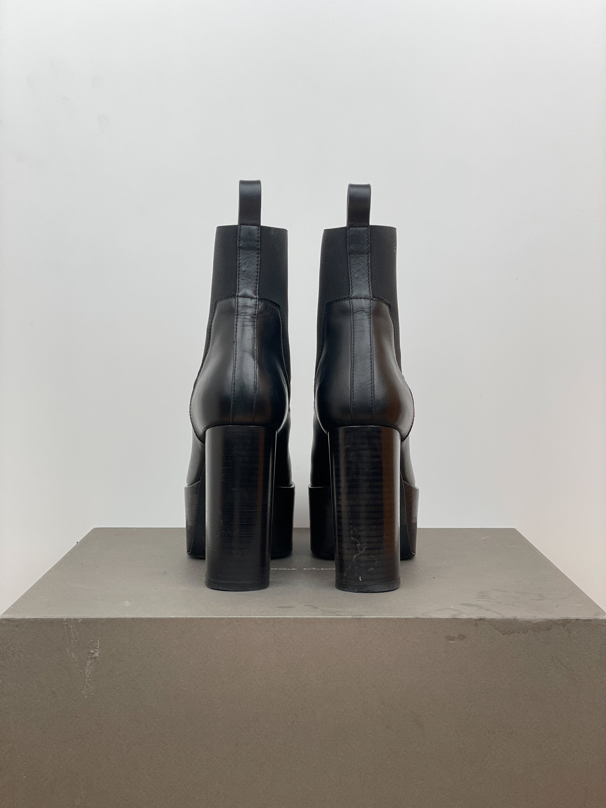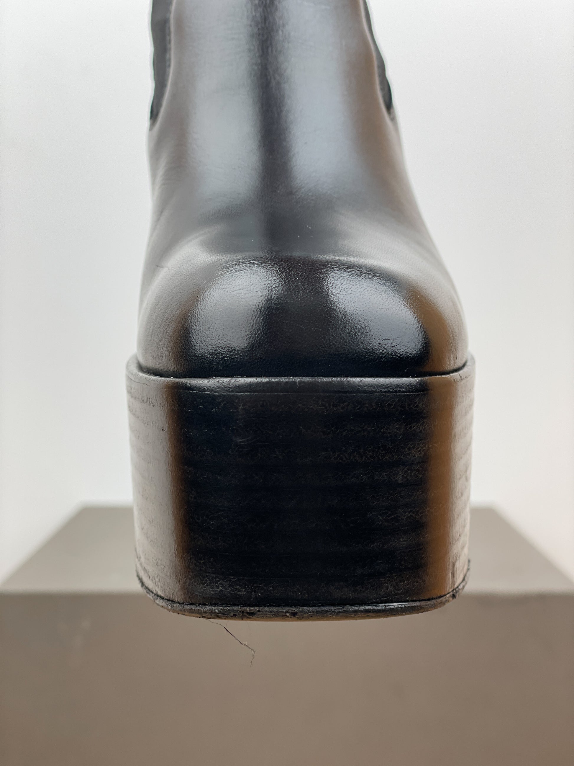 Black leather chelsea boots, featuring the signature chunky „Kiss“ heel and a platform sole, from the autumn-winter 2019 collection.