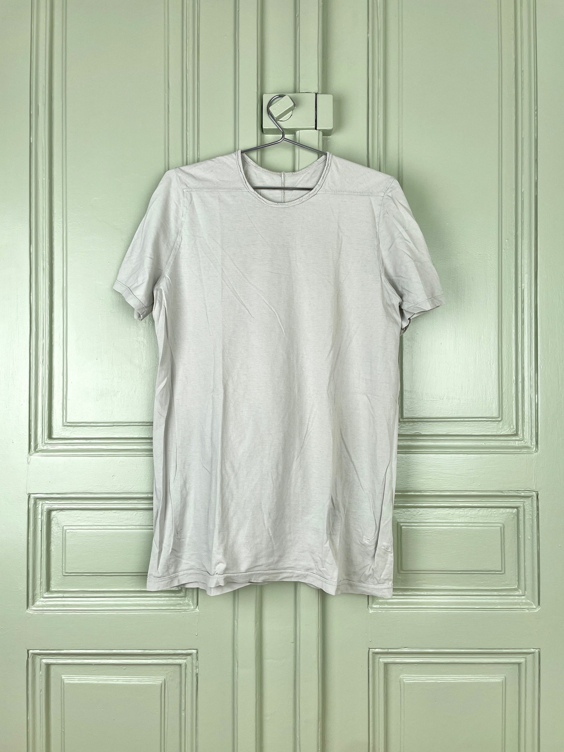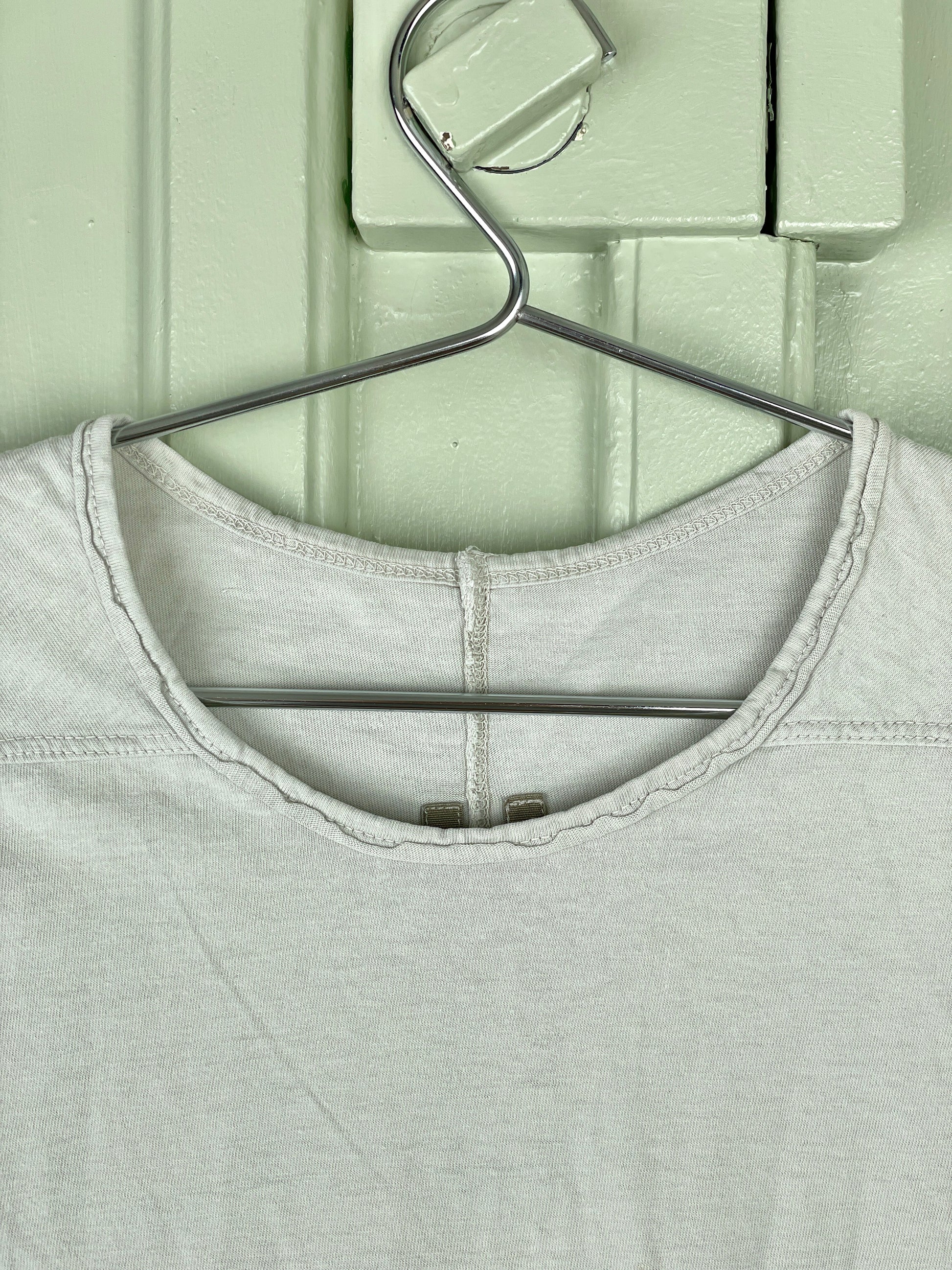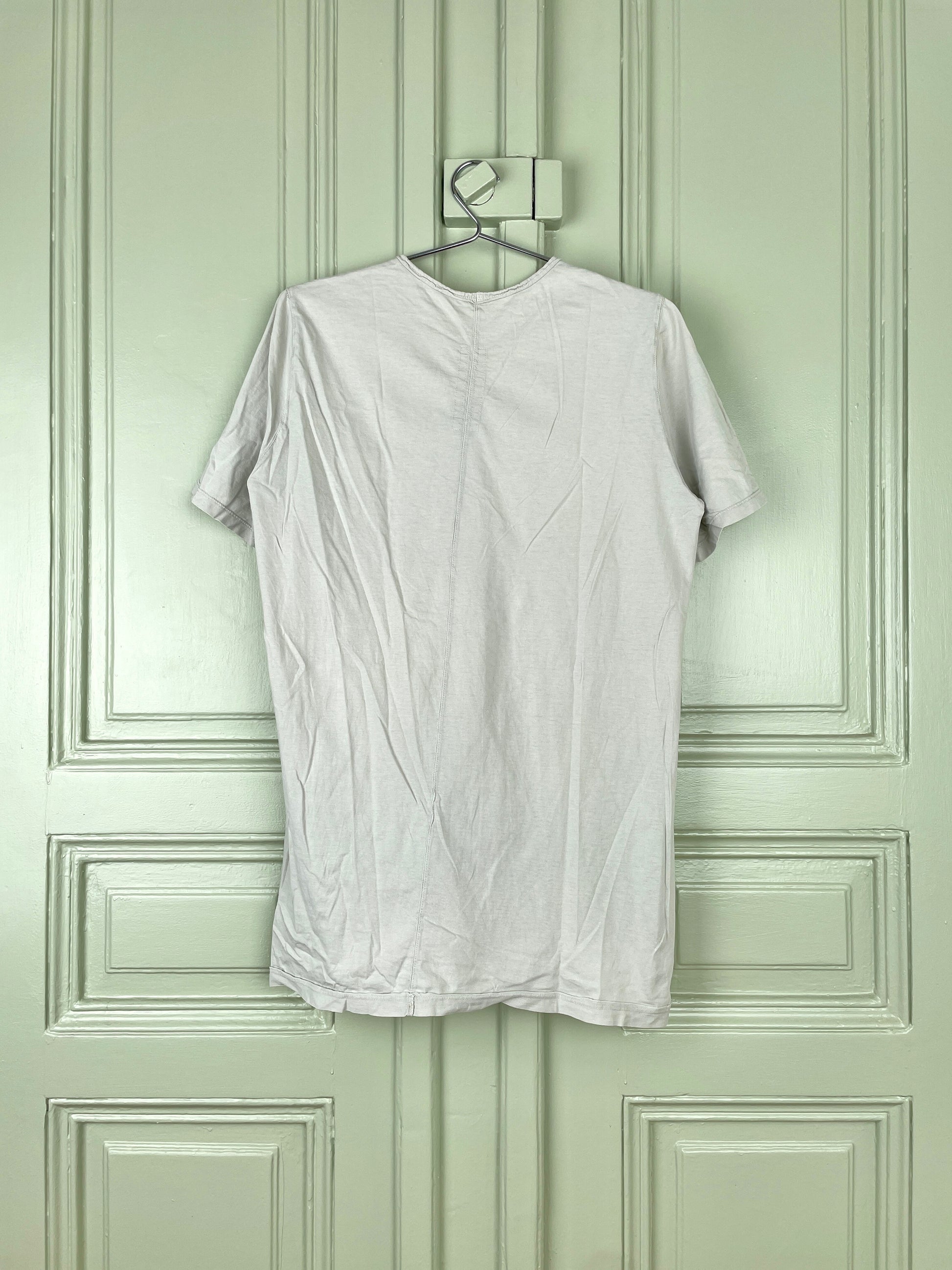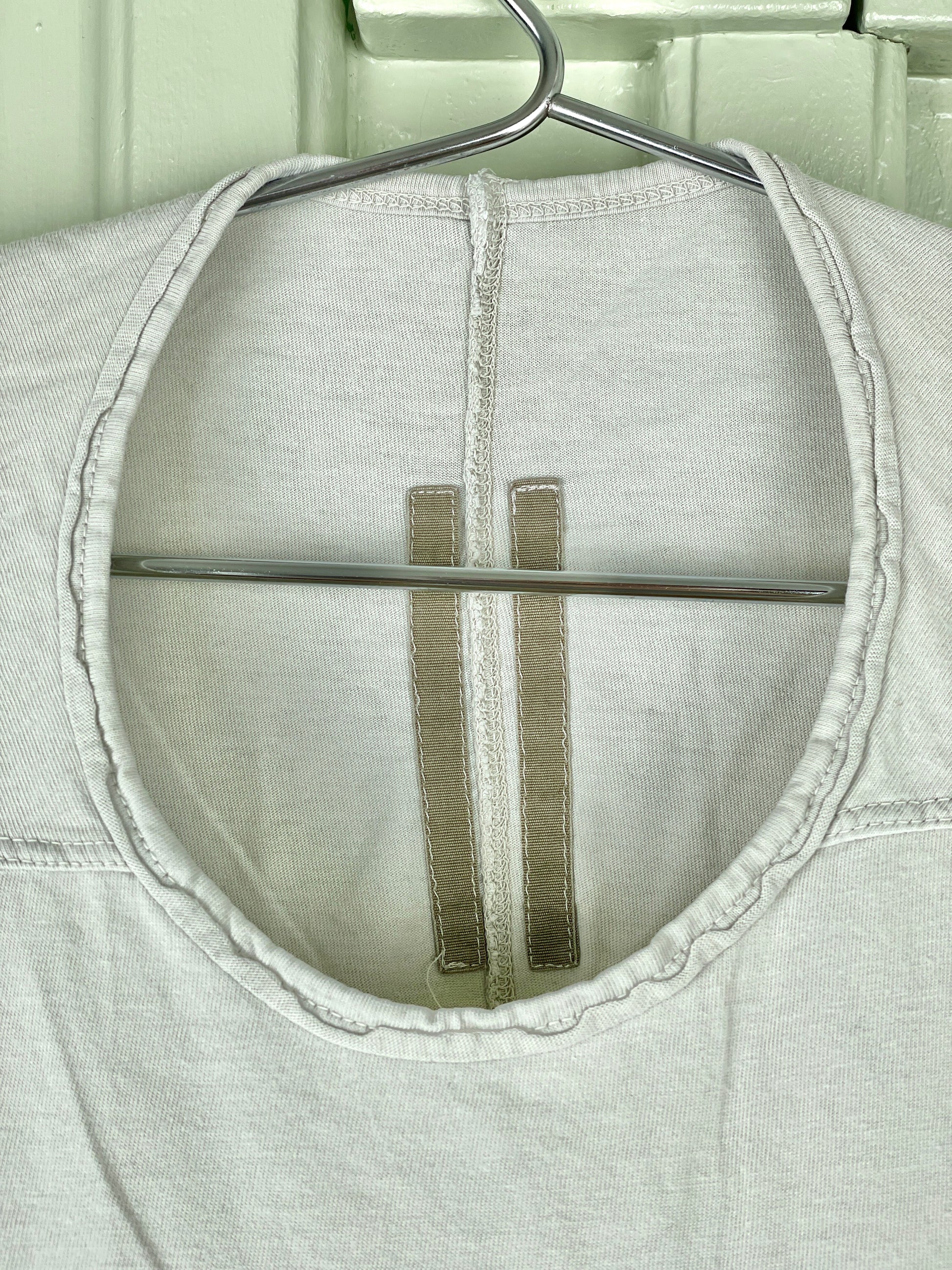 White oyster t-shirt with decorative seams from the collar to the shoulders.