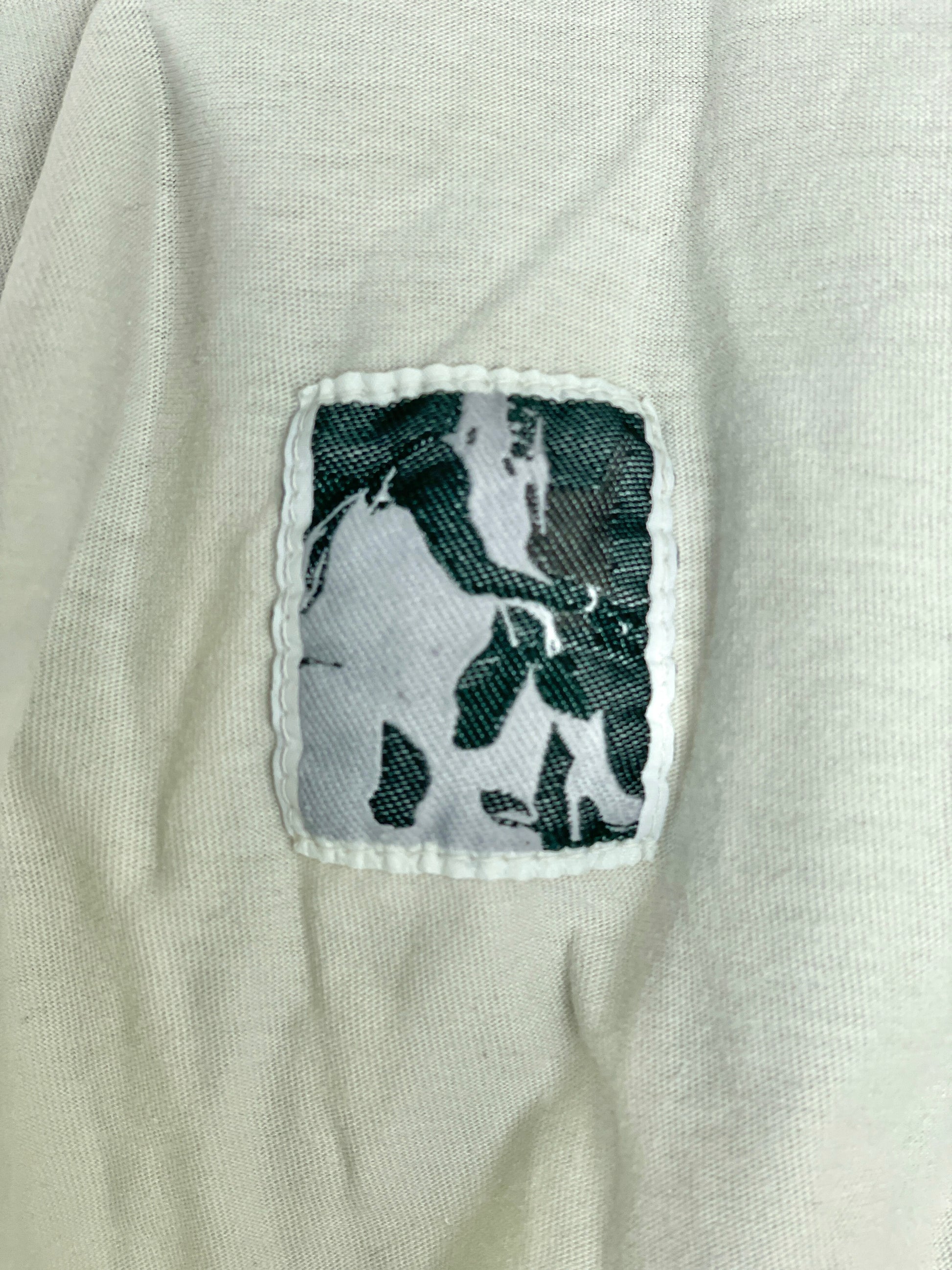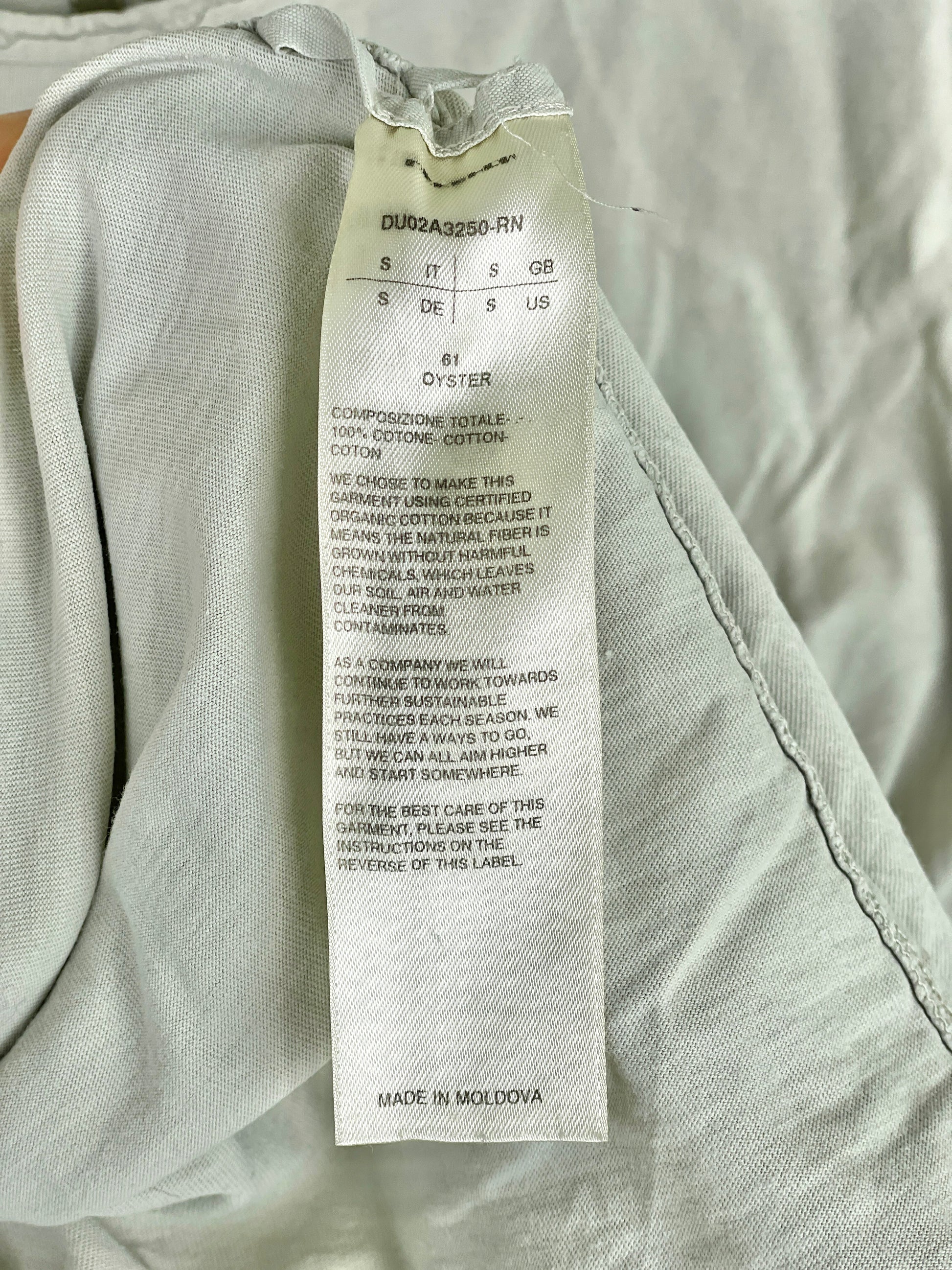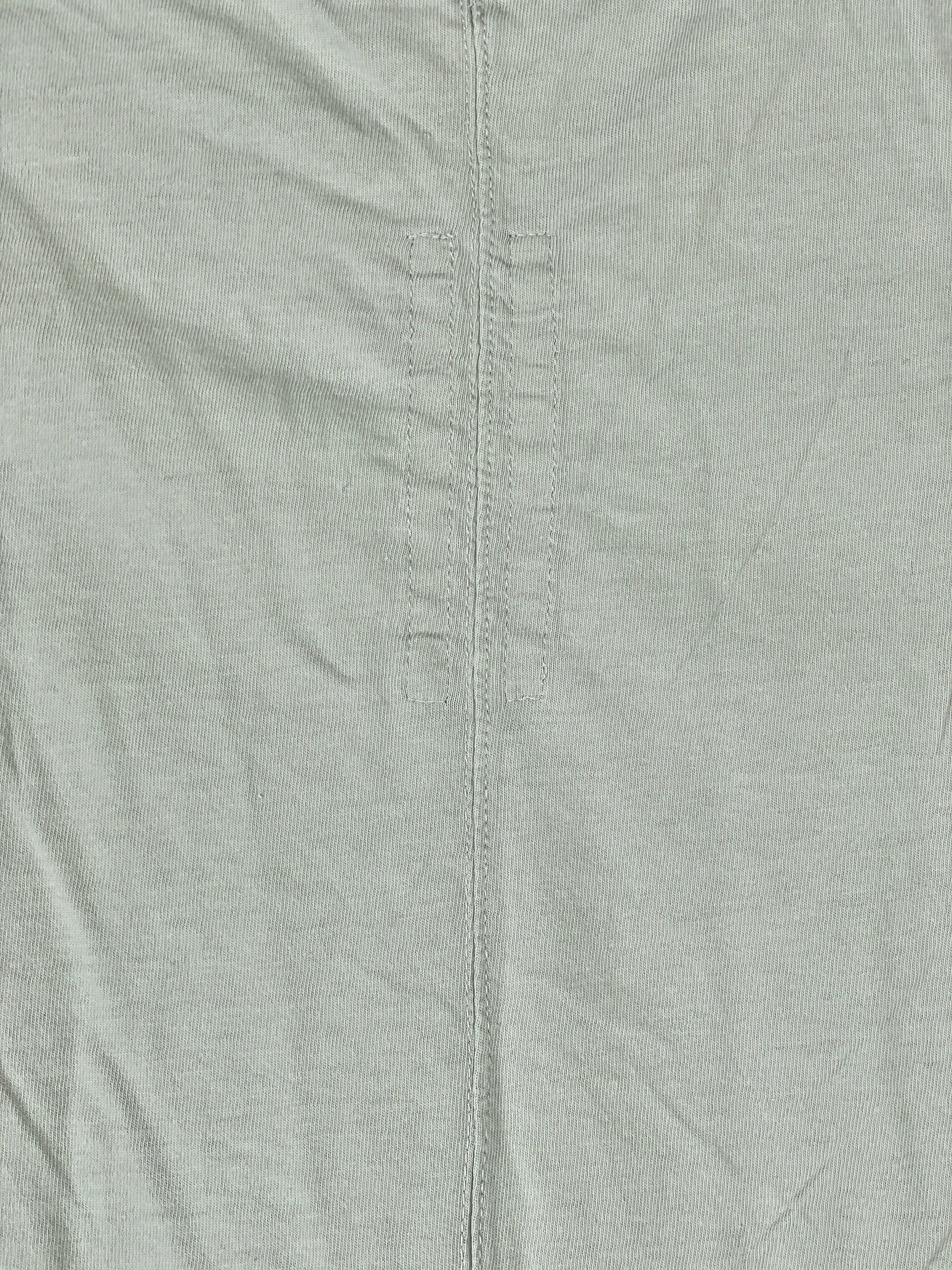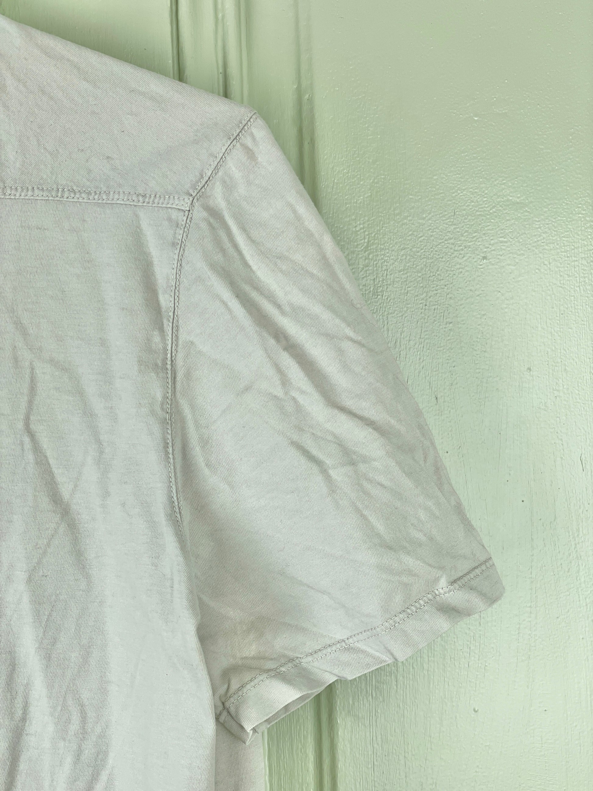 White oyster t-shirt with decorative seams from the collar to the shoulders.