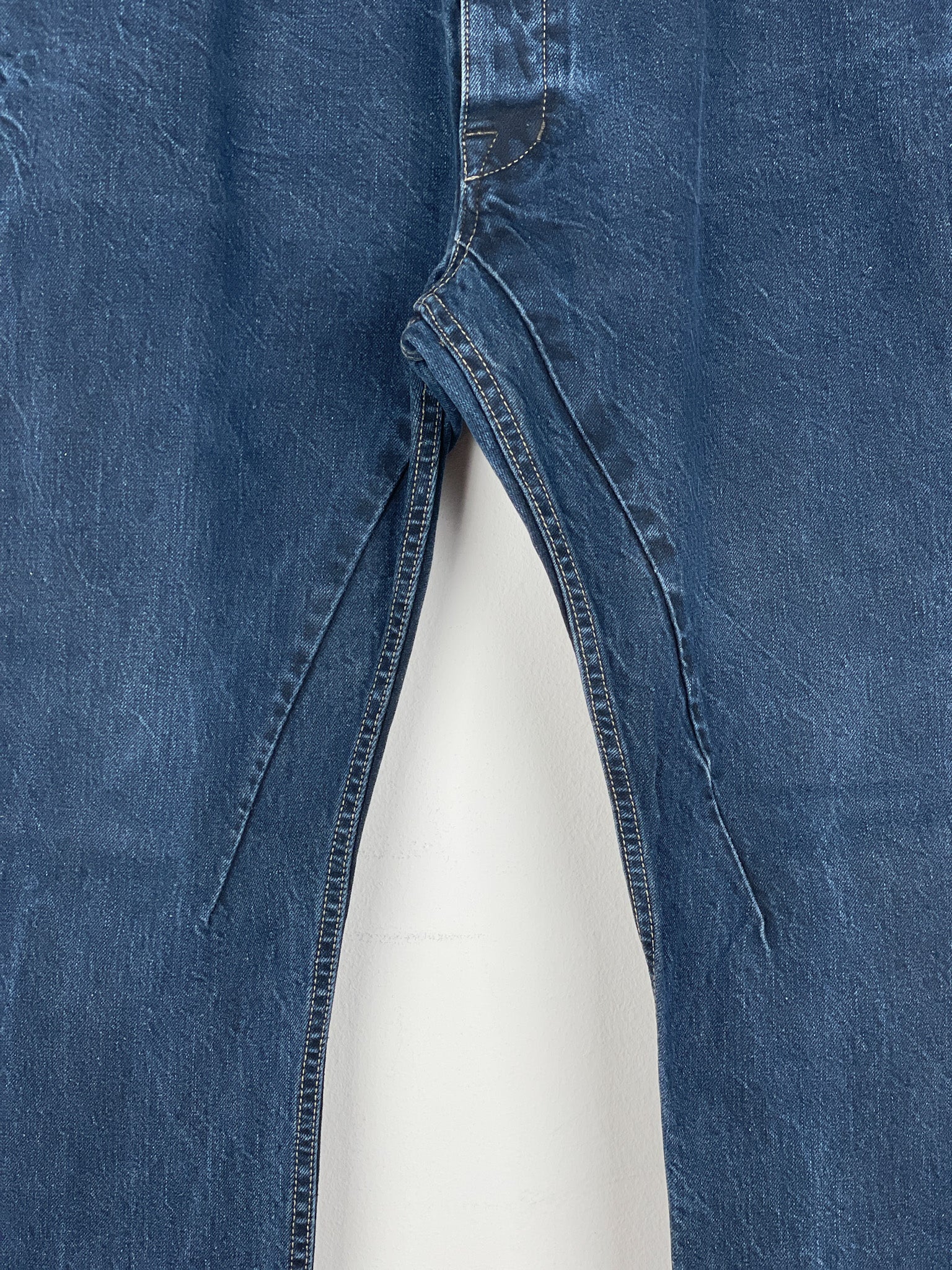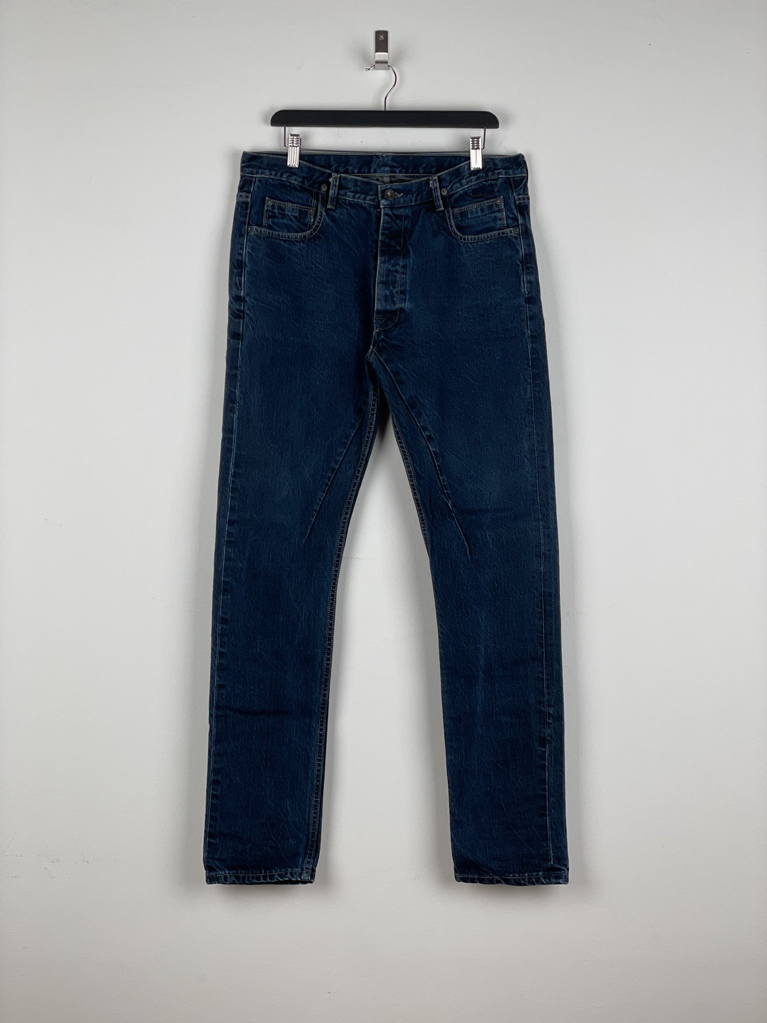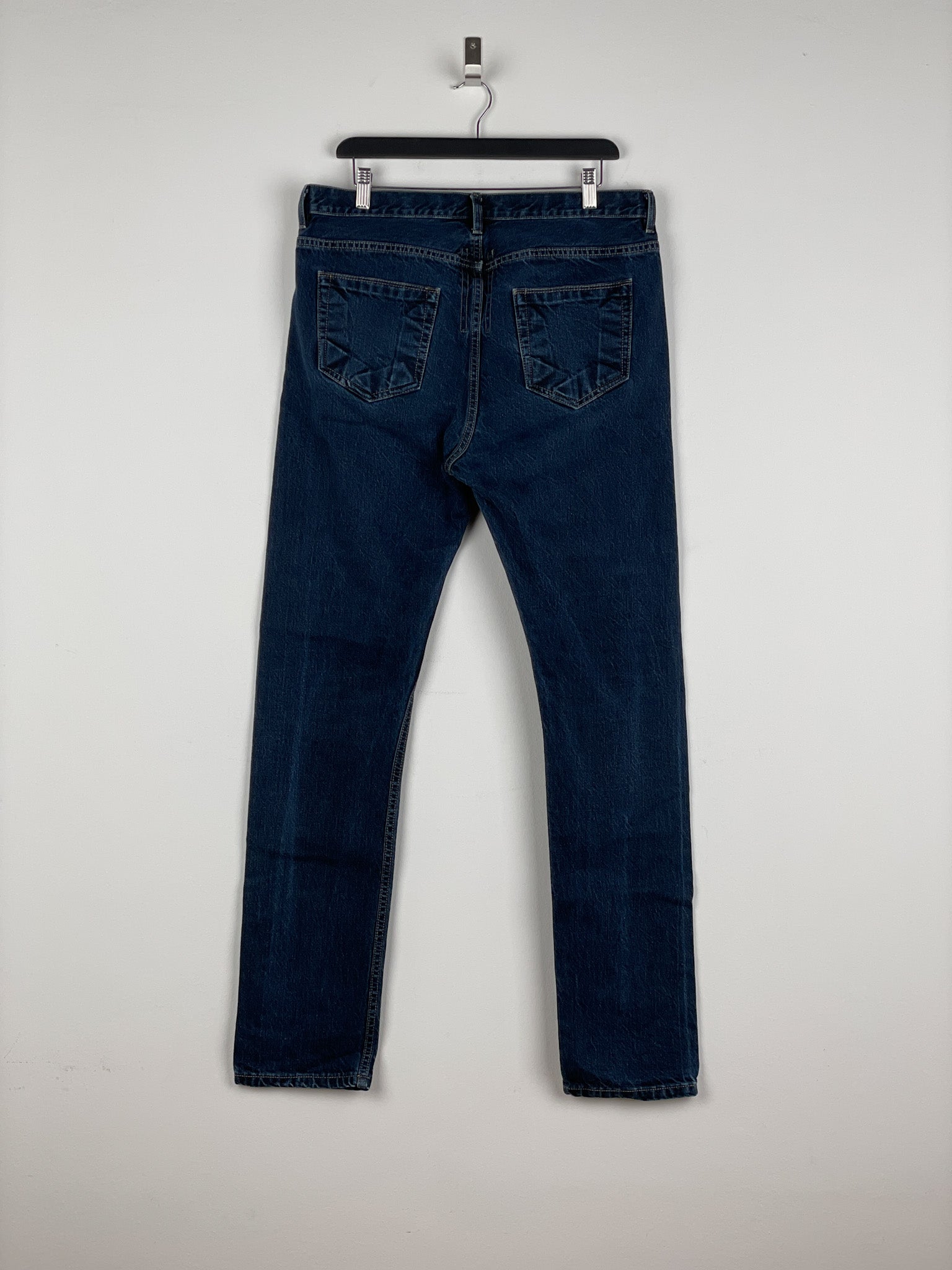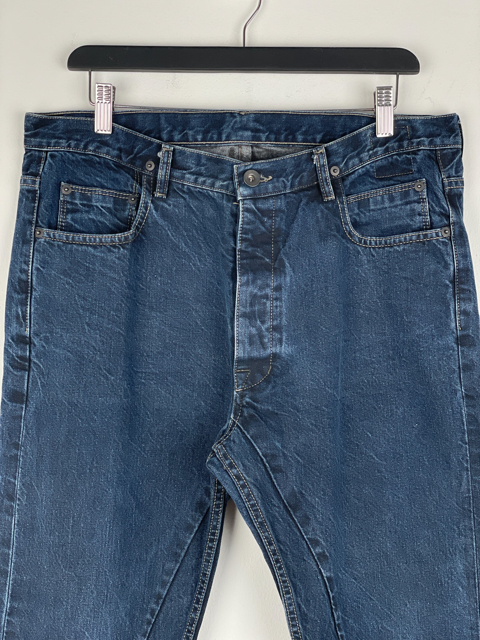 Washed dark blue denim jeans with a slight drop crotch and the signature inner thigh decorative seams, fromt the spring-summer 2016 collection.