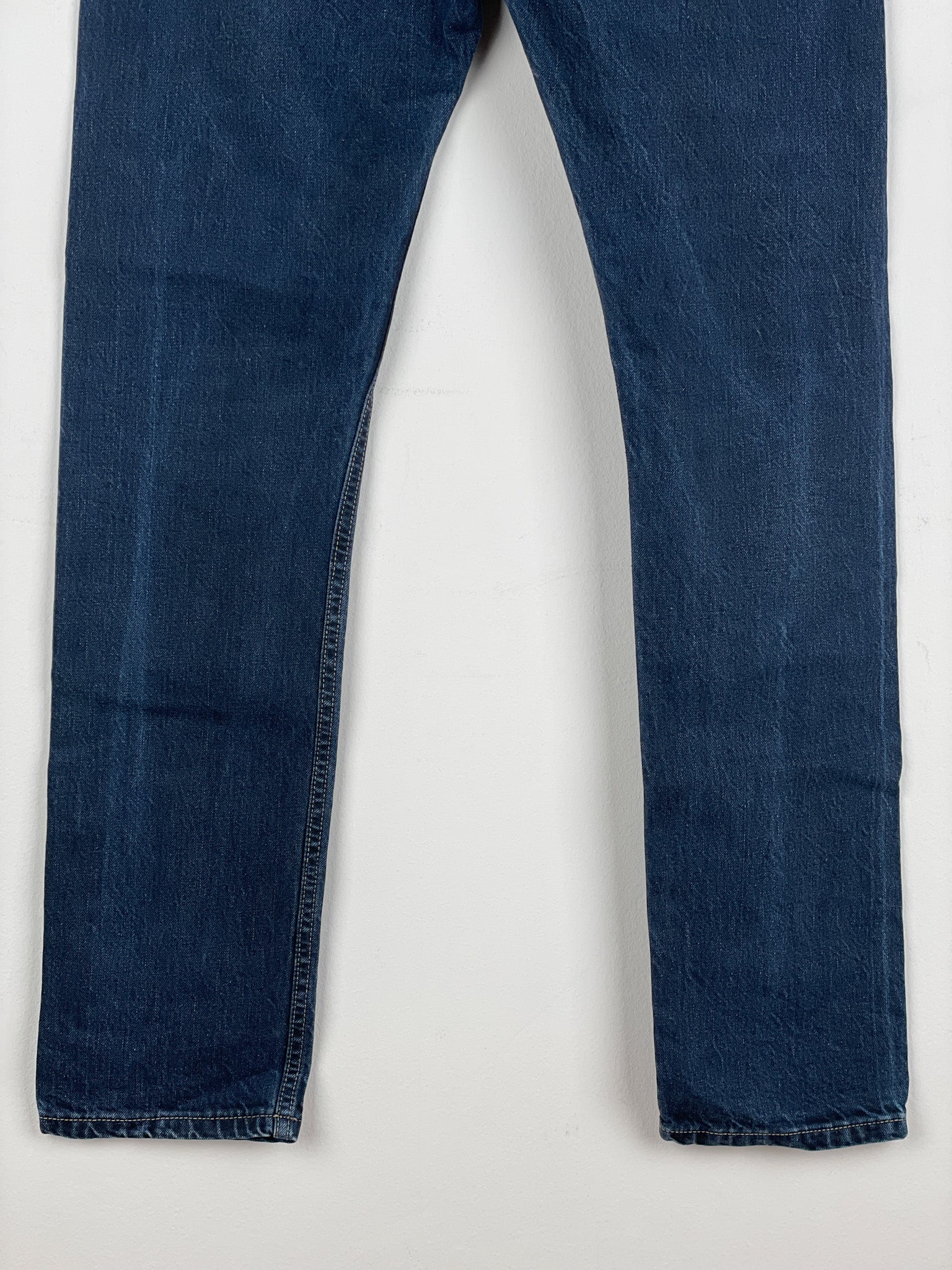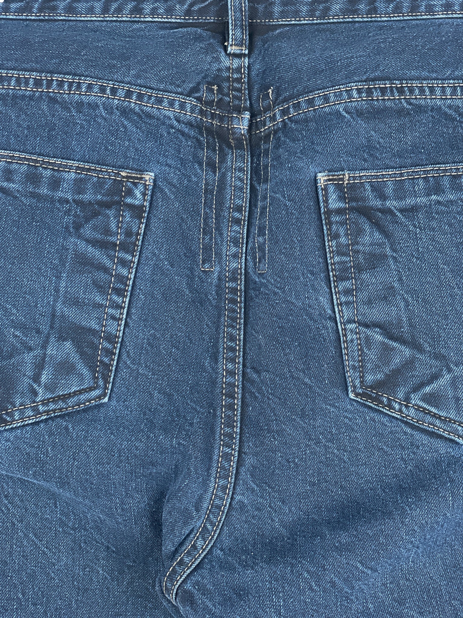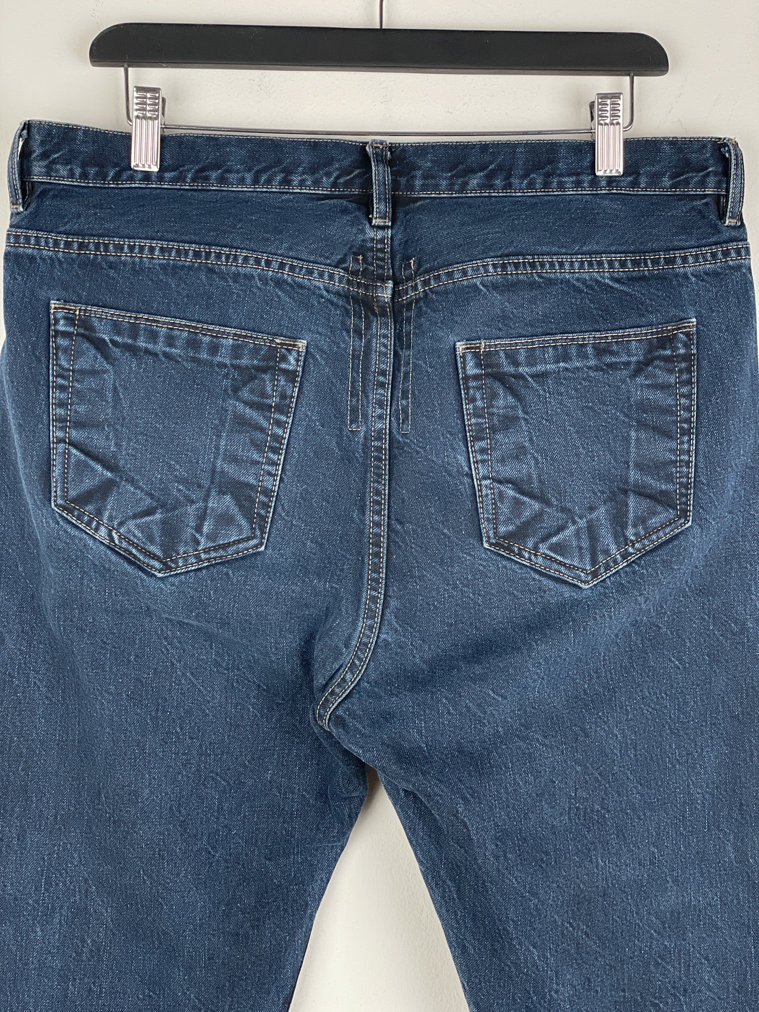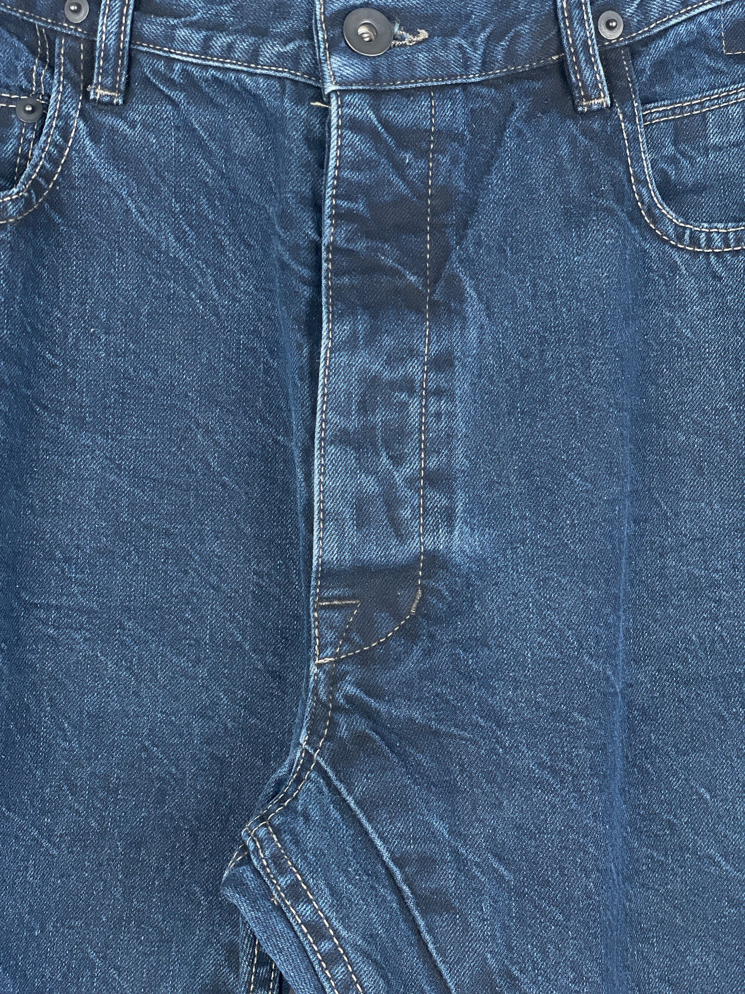 Washed dark blue denim jeans with a slight drop crotch and the signature inner thigh decorative seams, fromt the spring-summer 2016 collection.