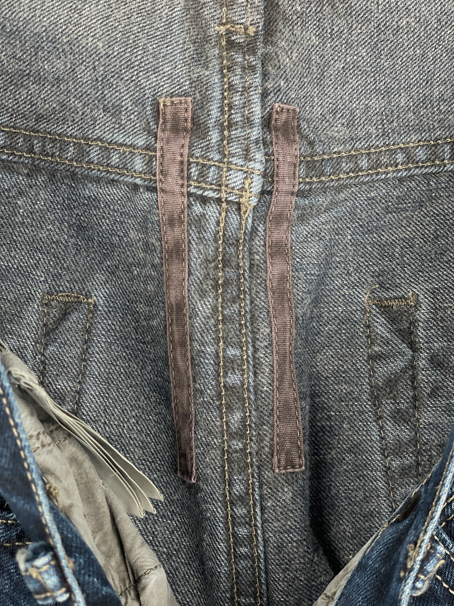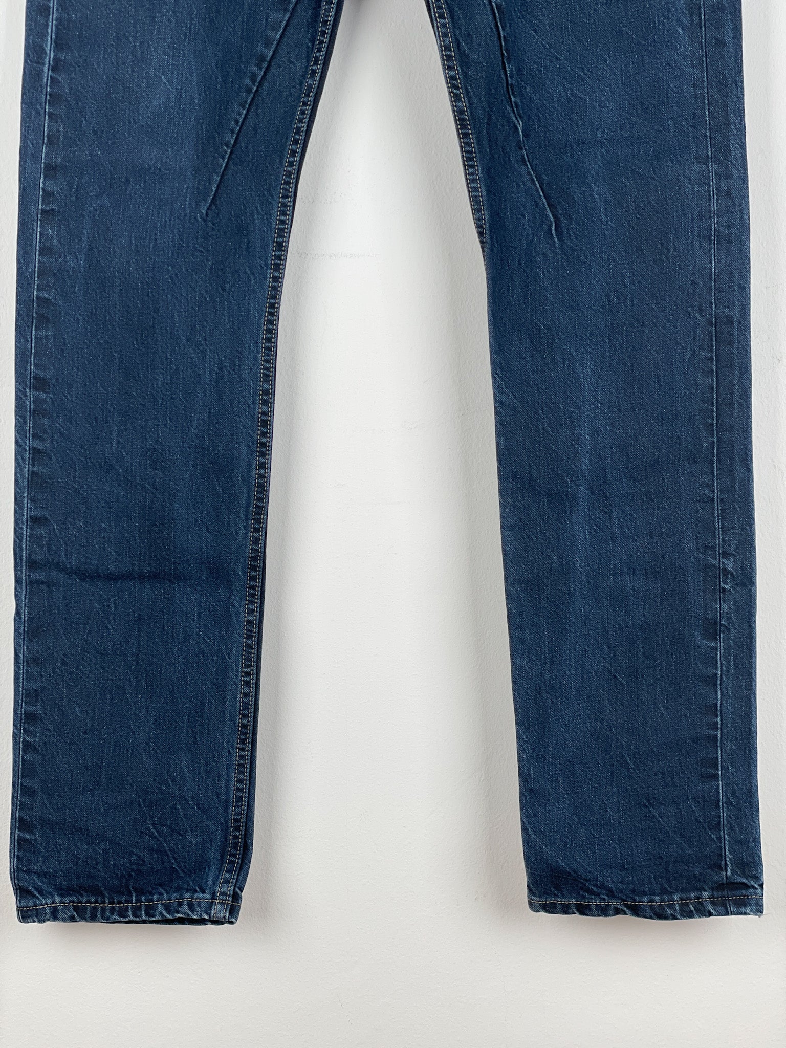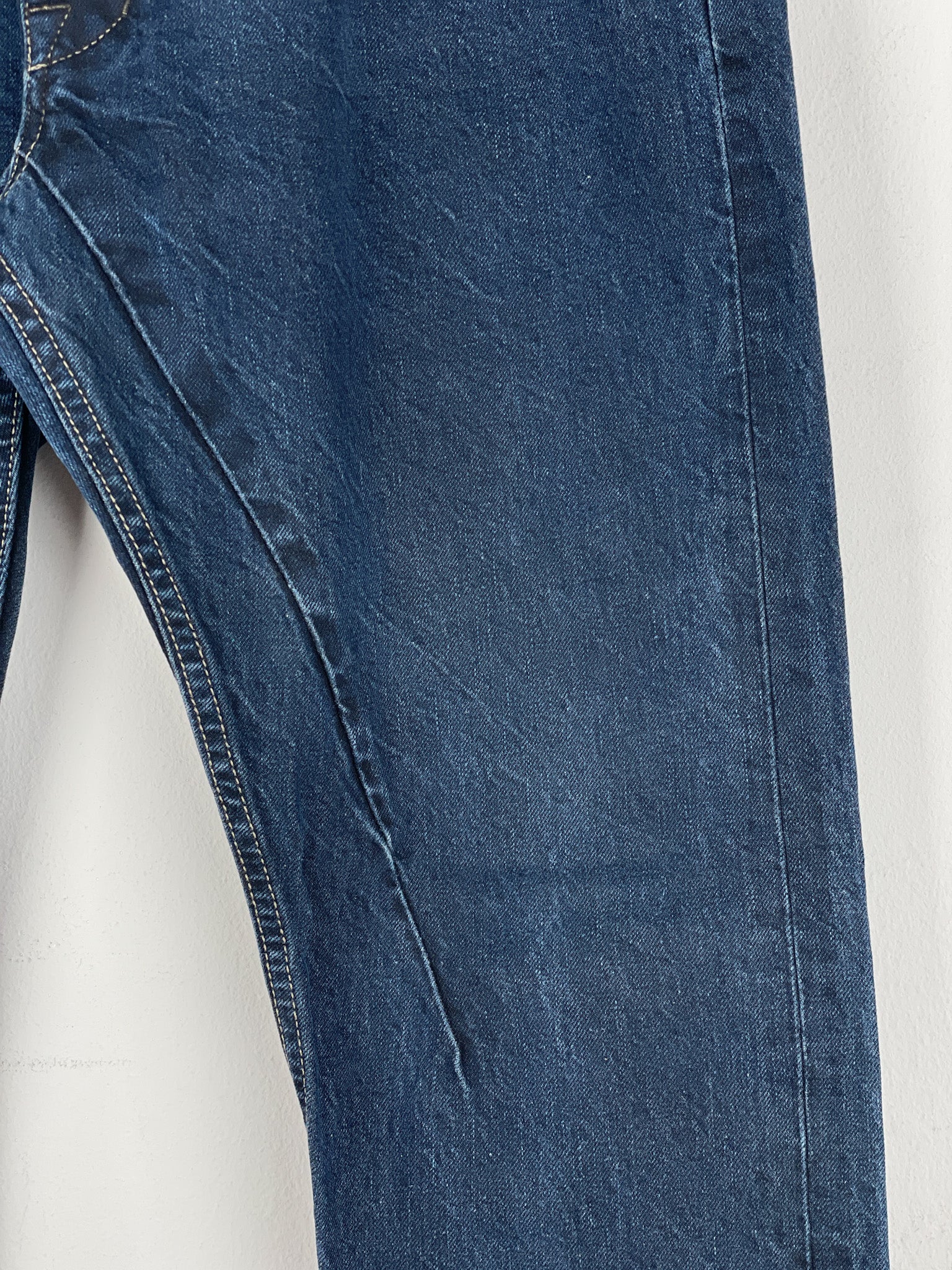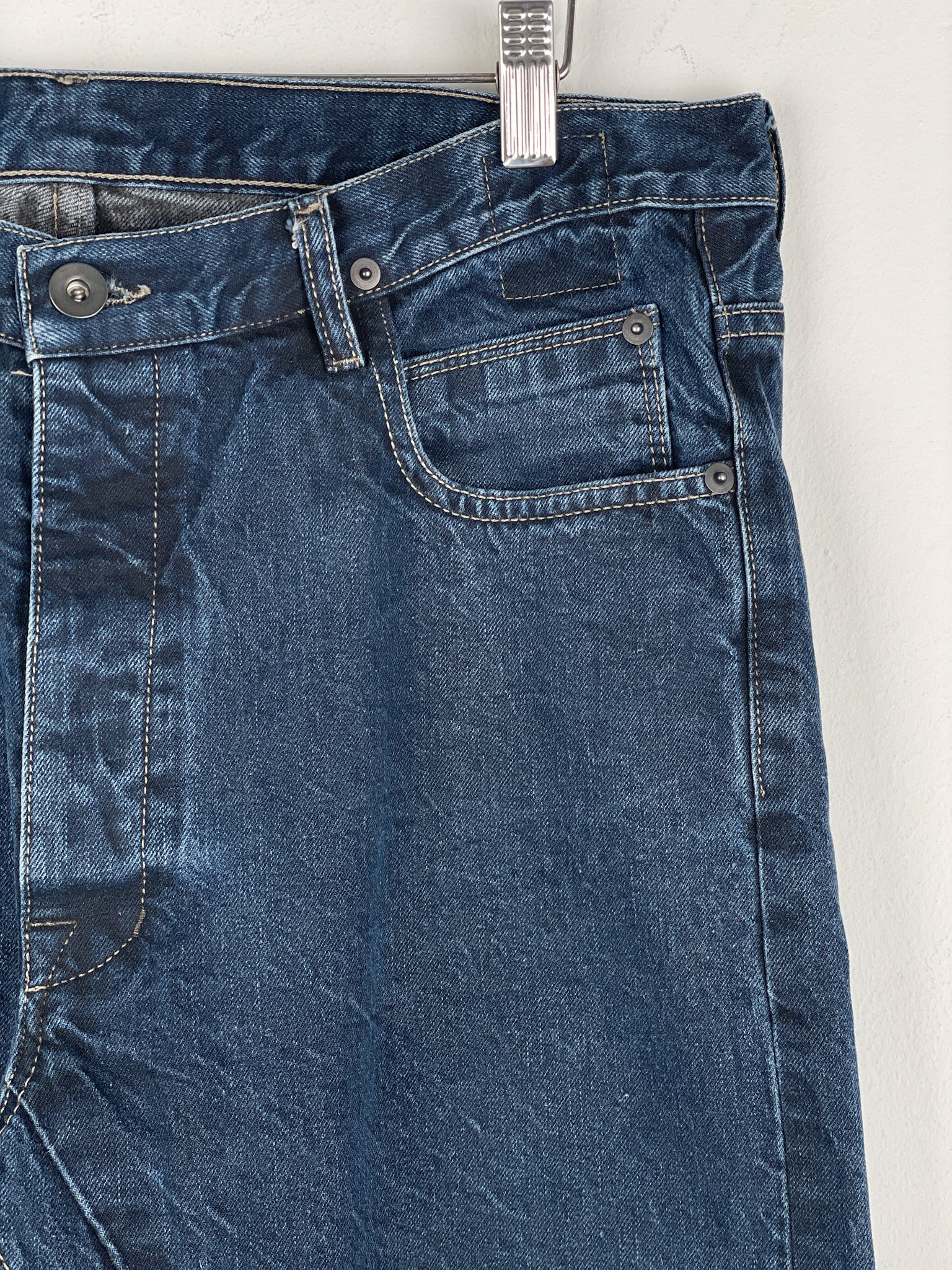 Washed dark blue denim jeans with a slight drop crotch and the signature inner thigh decorative seams, fromt the spring-summer 2016 collection.