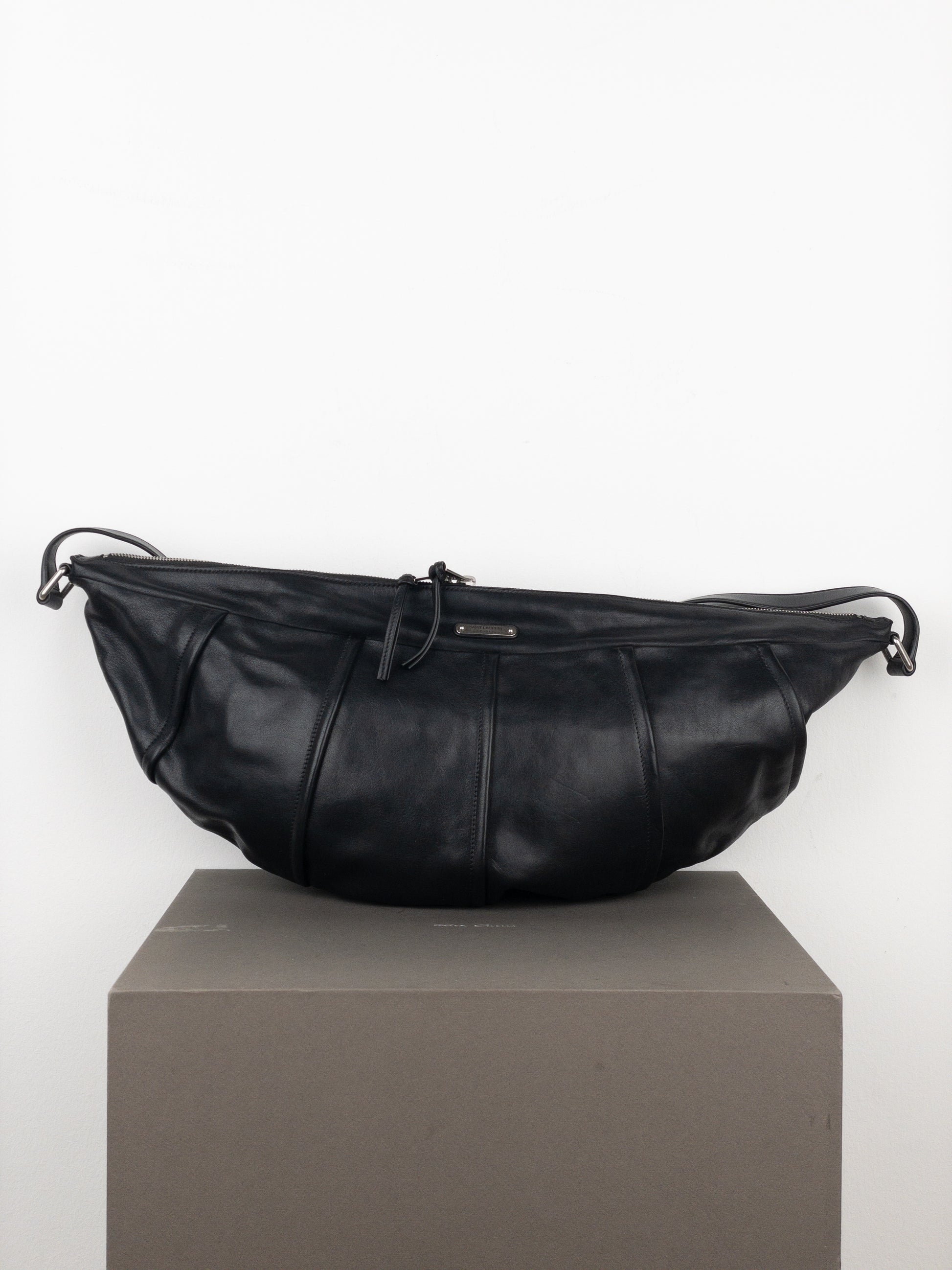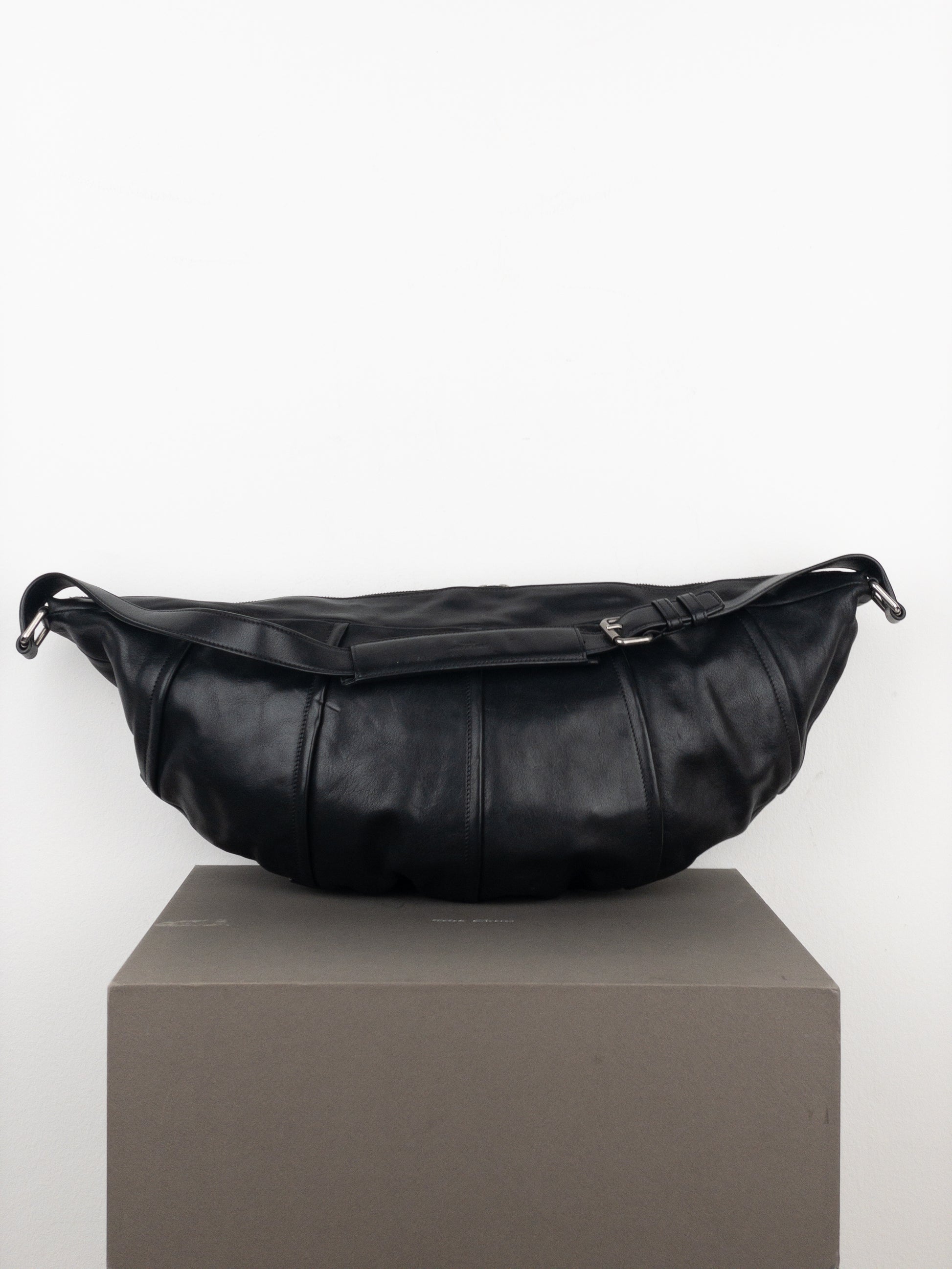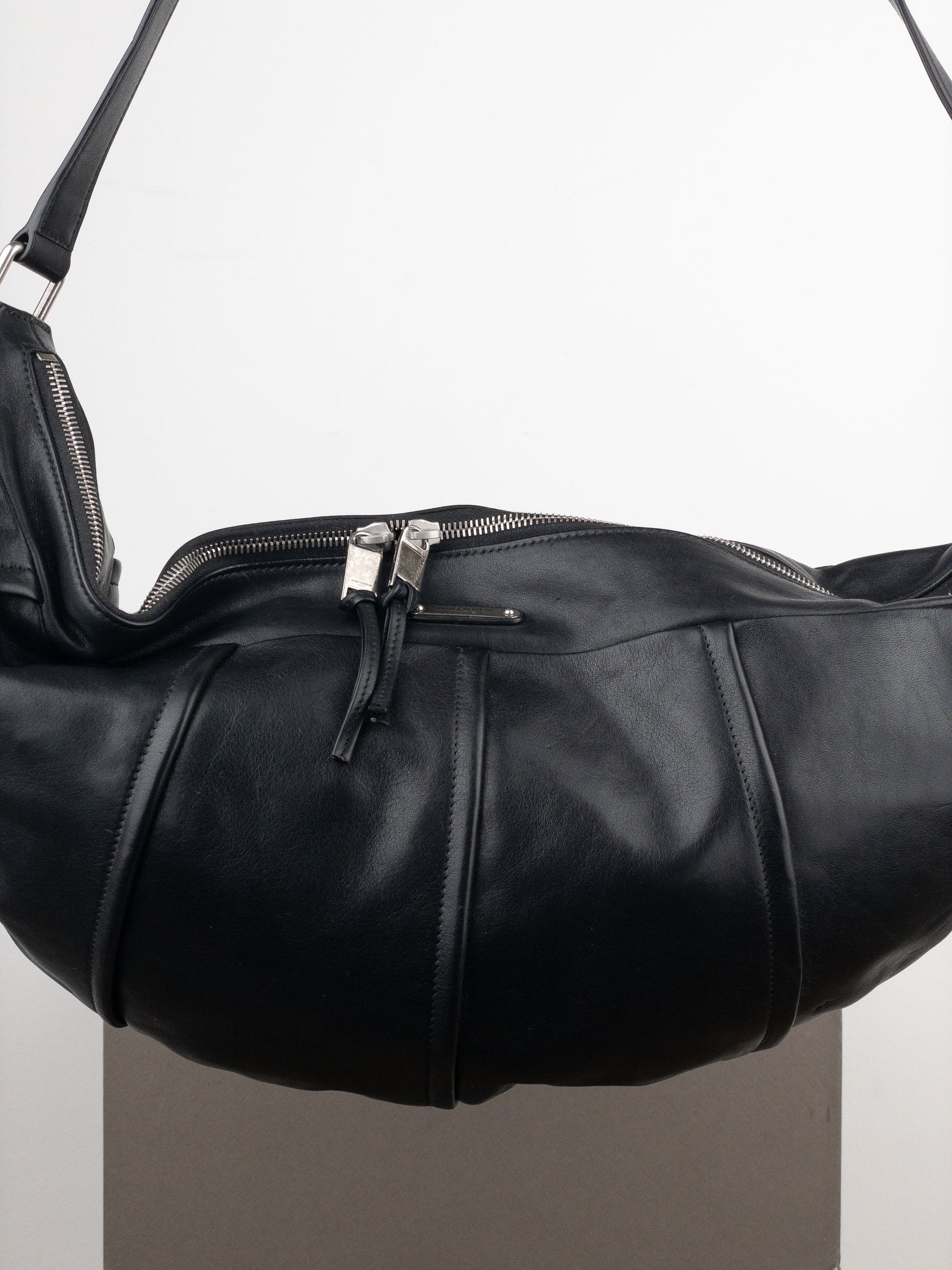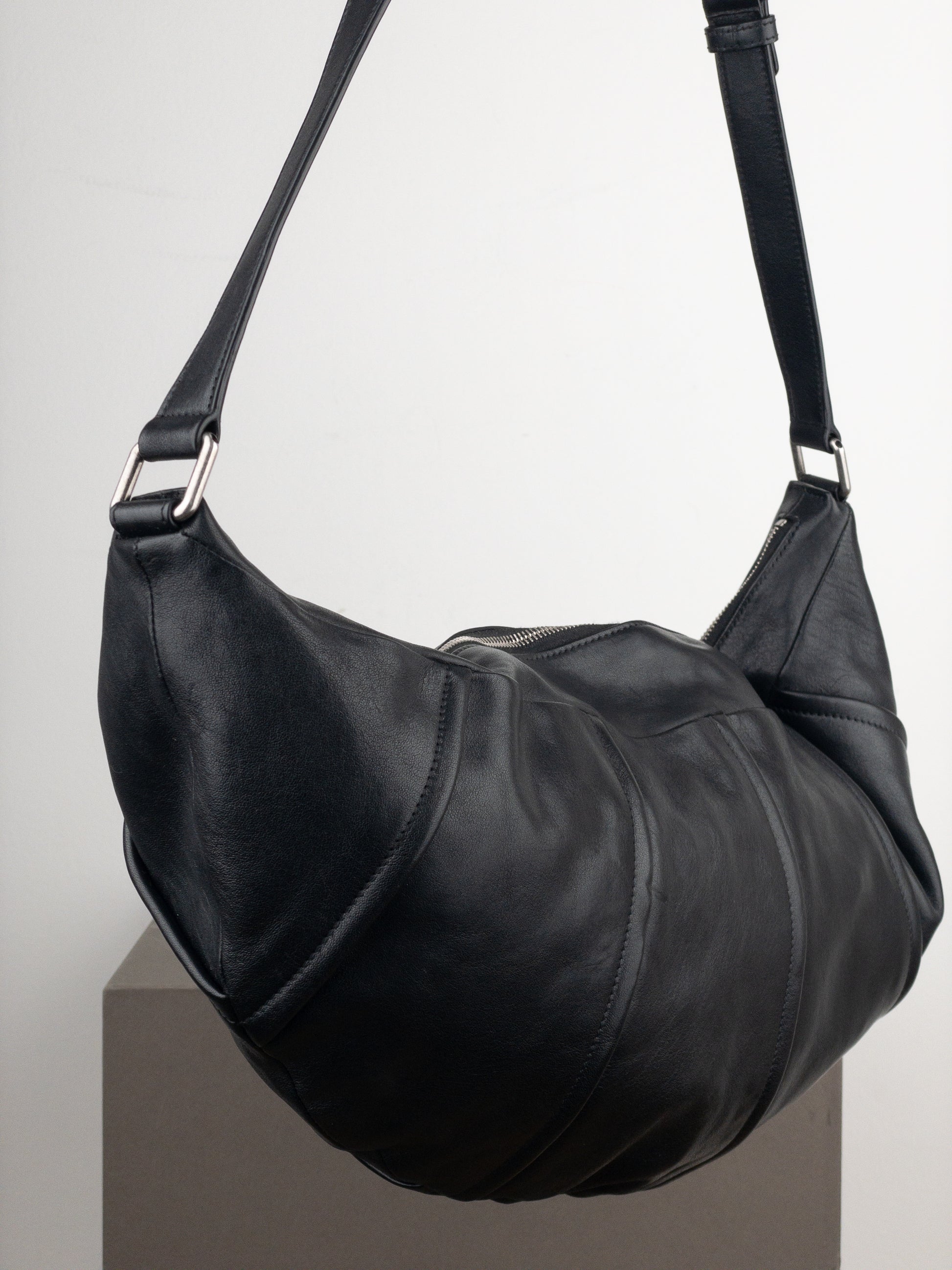 Black leather sling bag with solid silver-colored hardware and decorative panelling in the body.