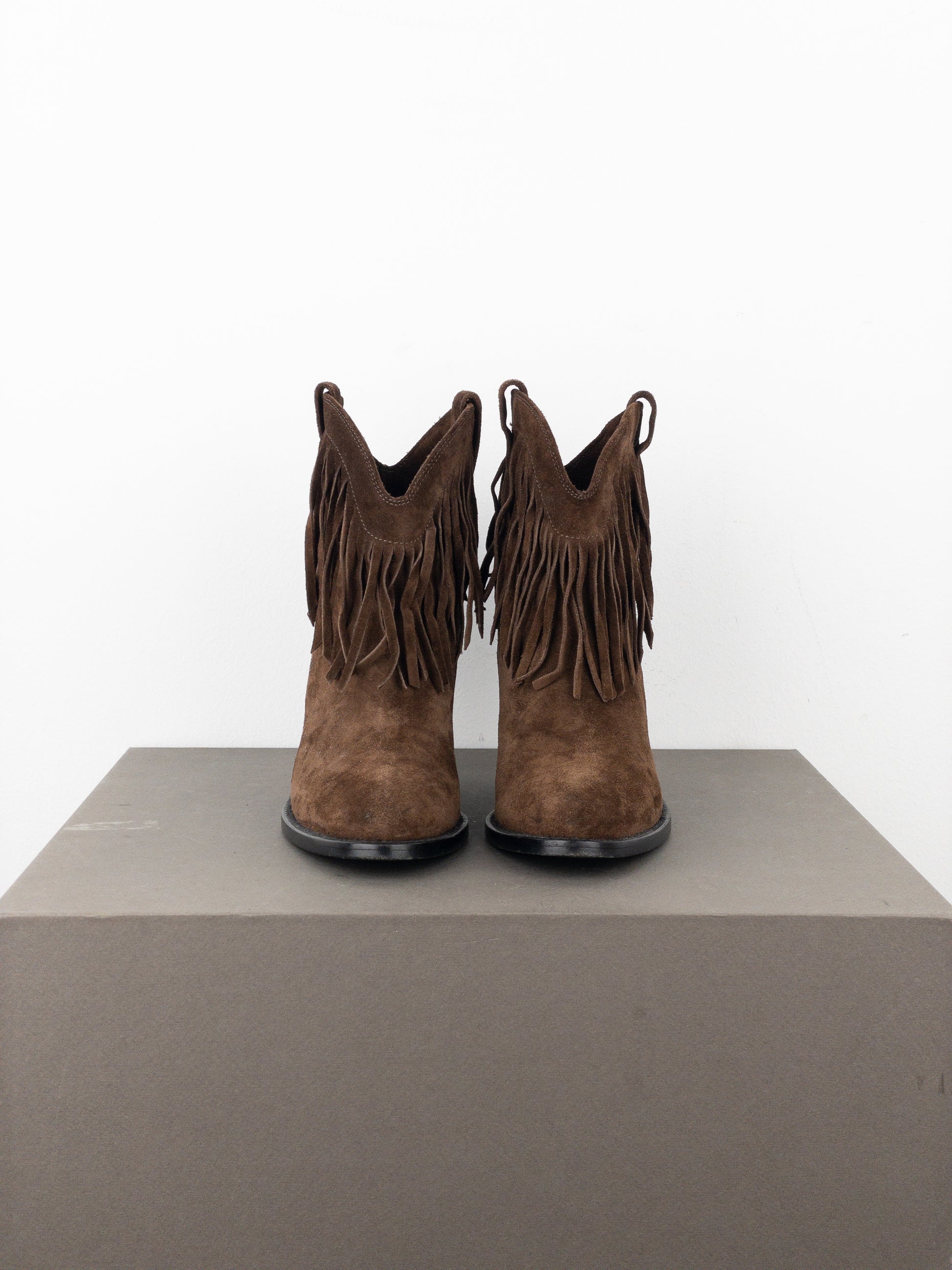 Dark brown suede western ankle boots with cuban heel and long fringes around the top of the shaft.
