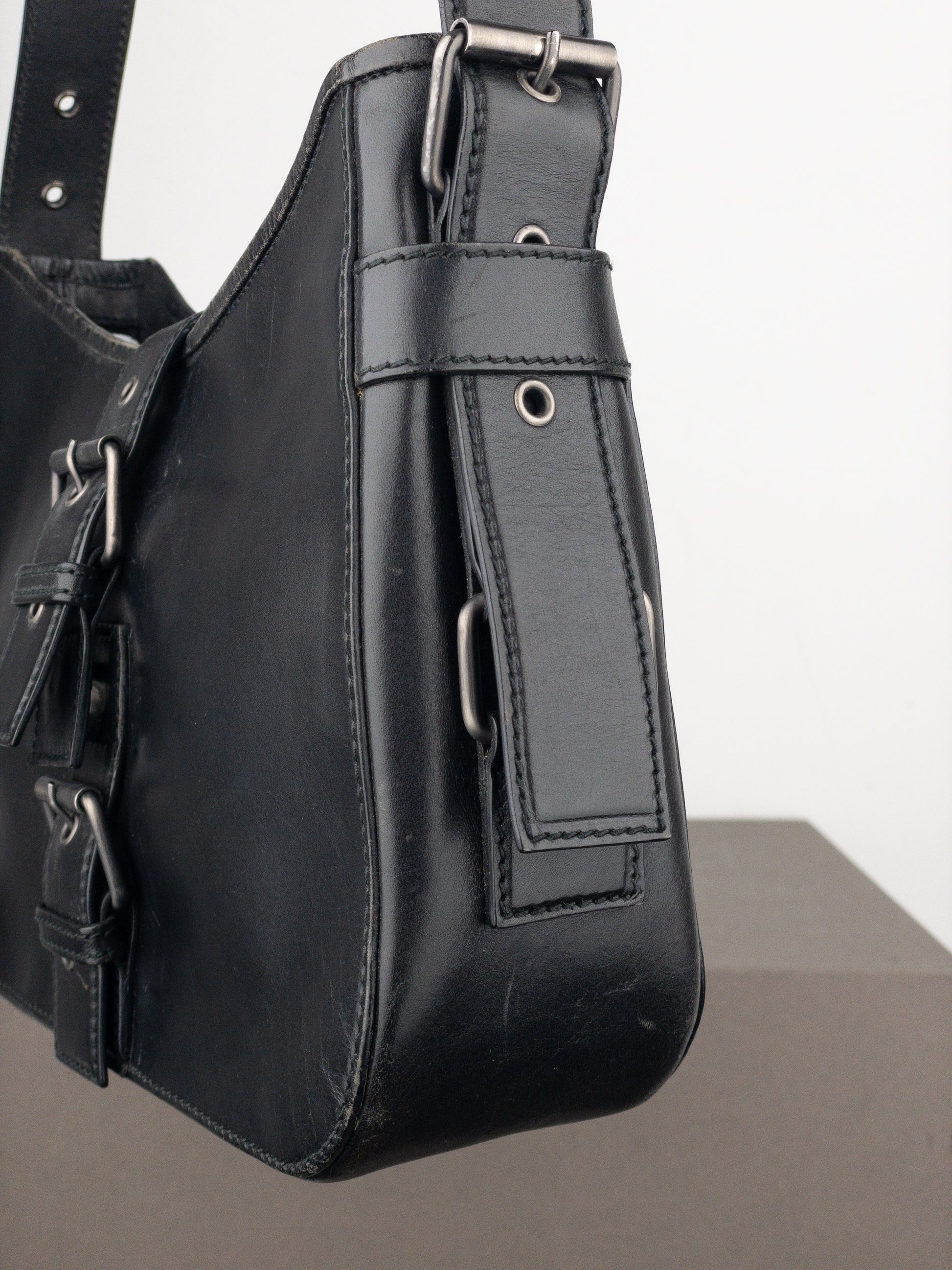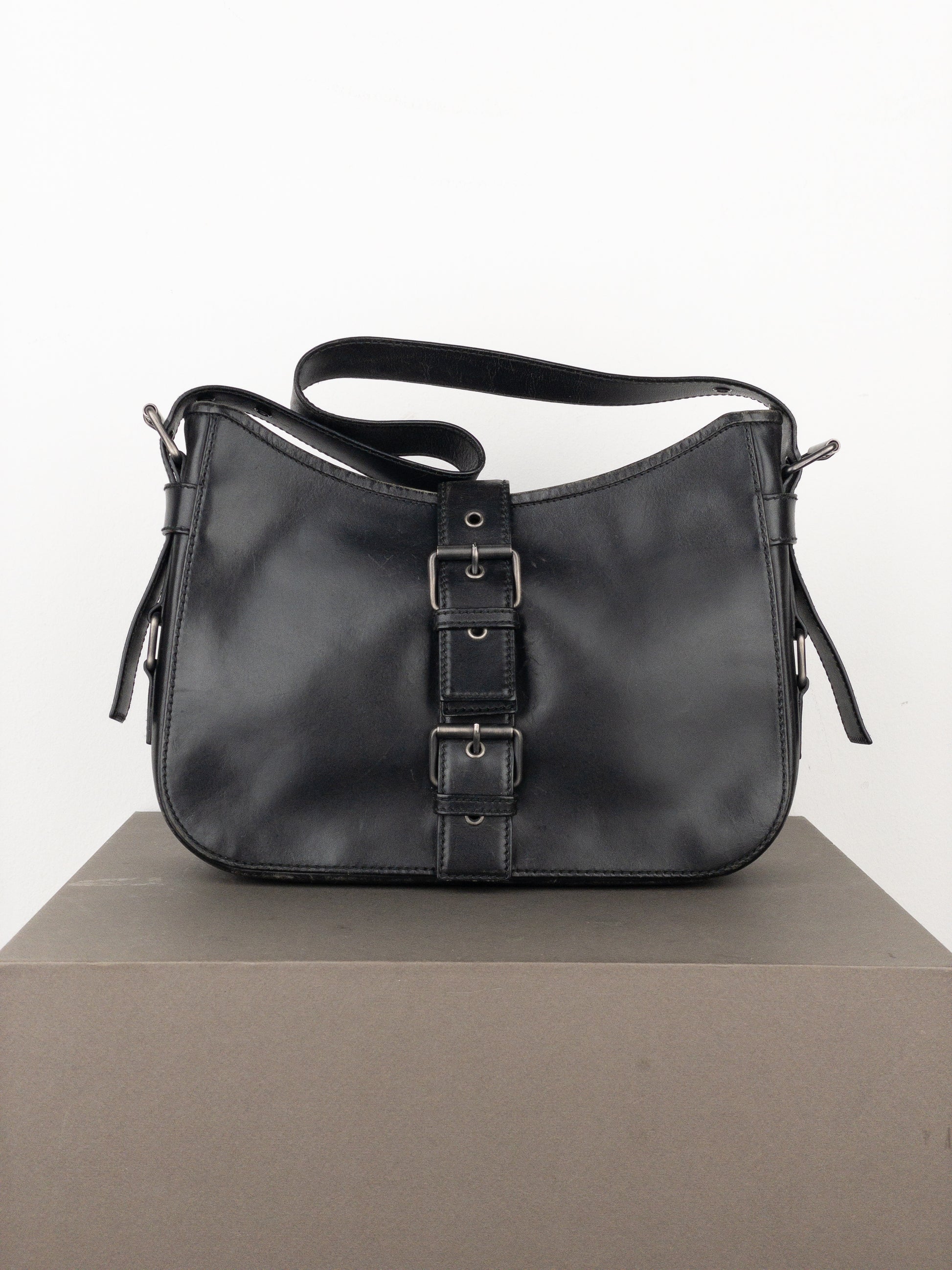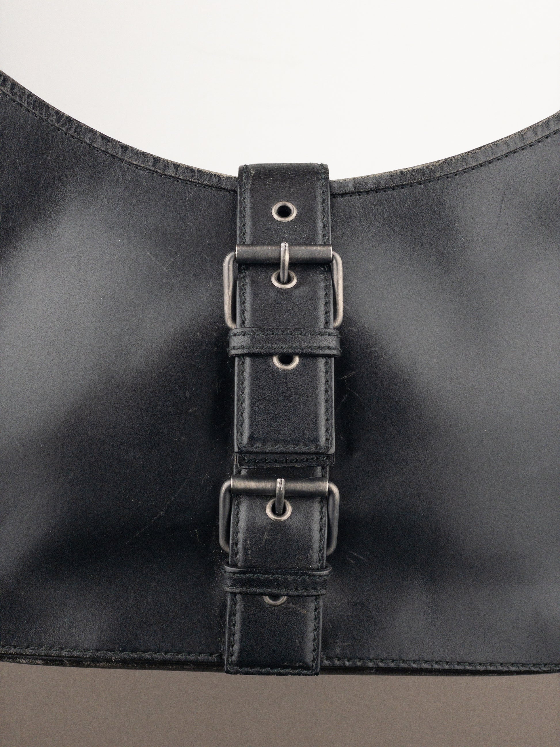 Black leather shoulder bag with double-buckled closure strap across the front, from the 2000s.