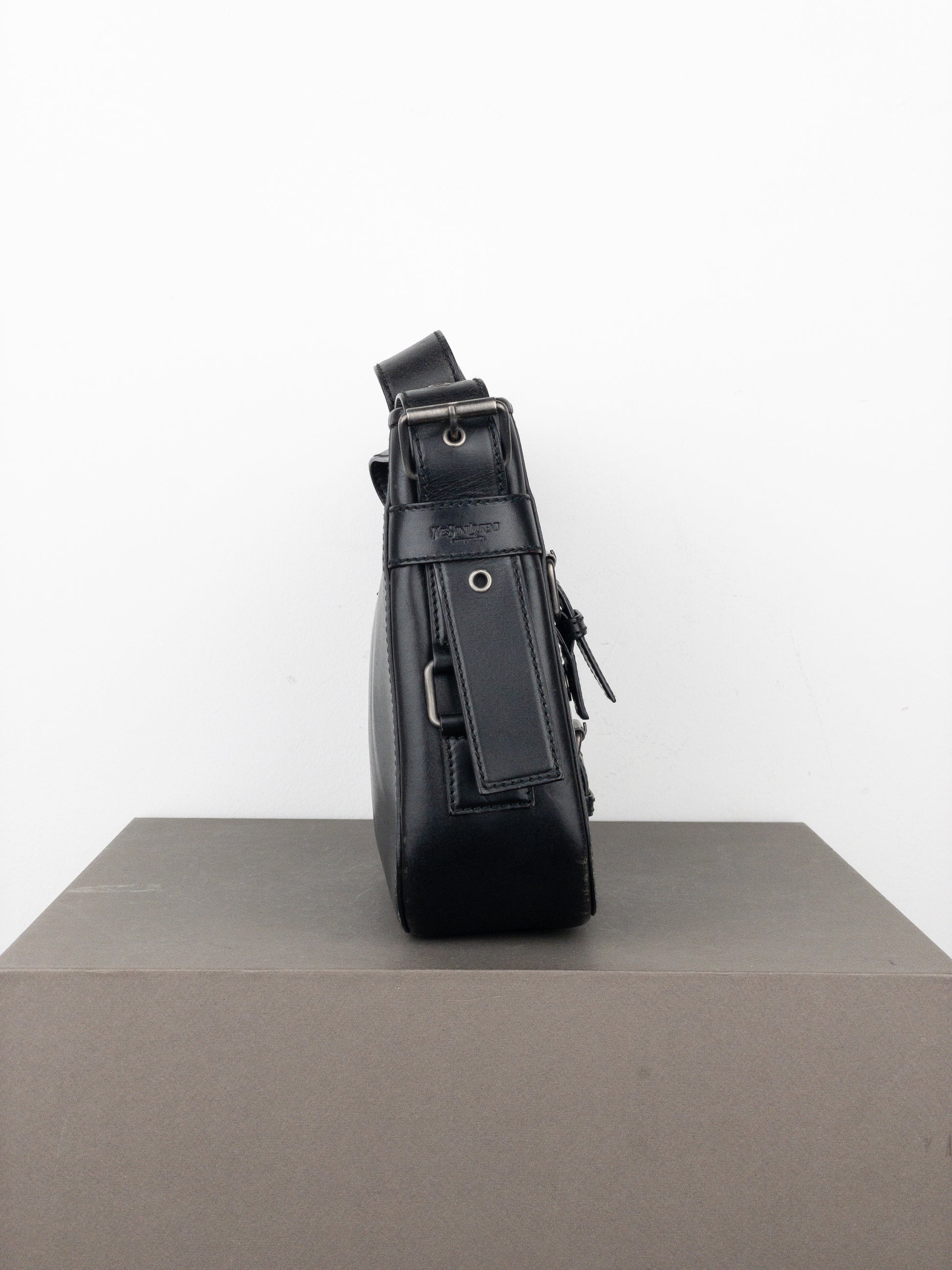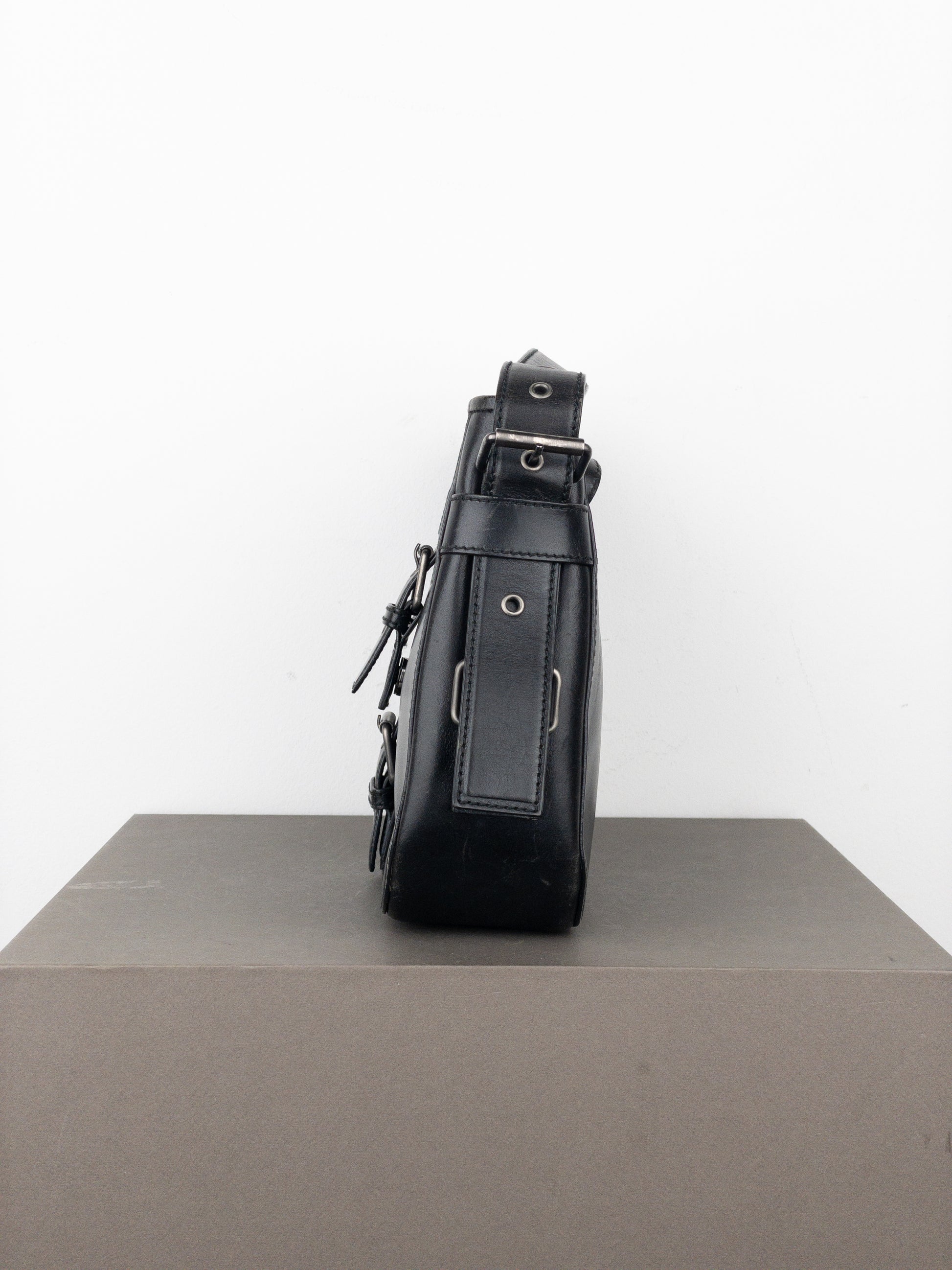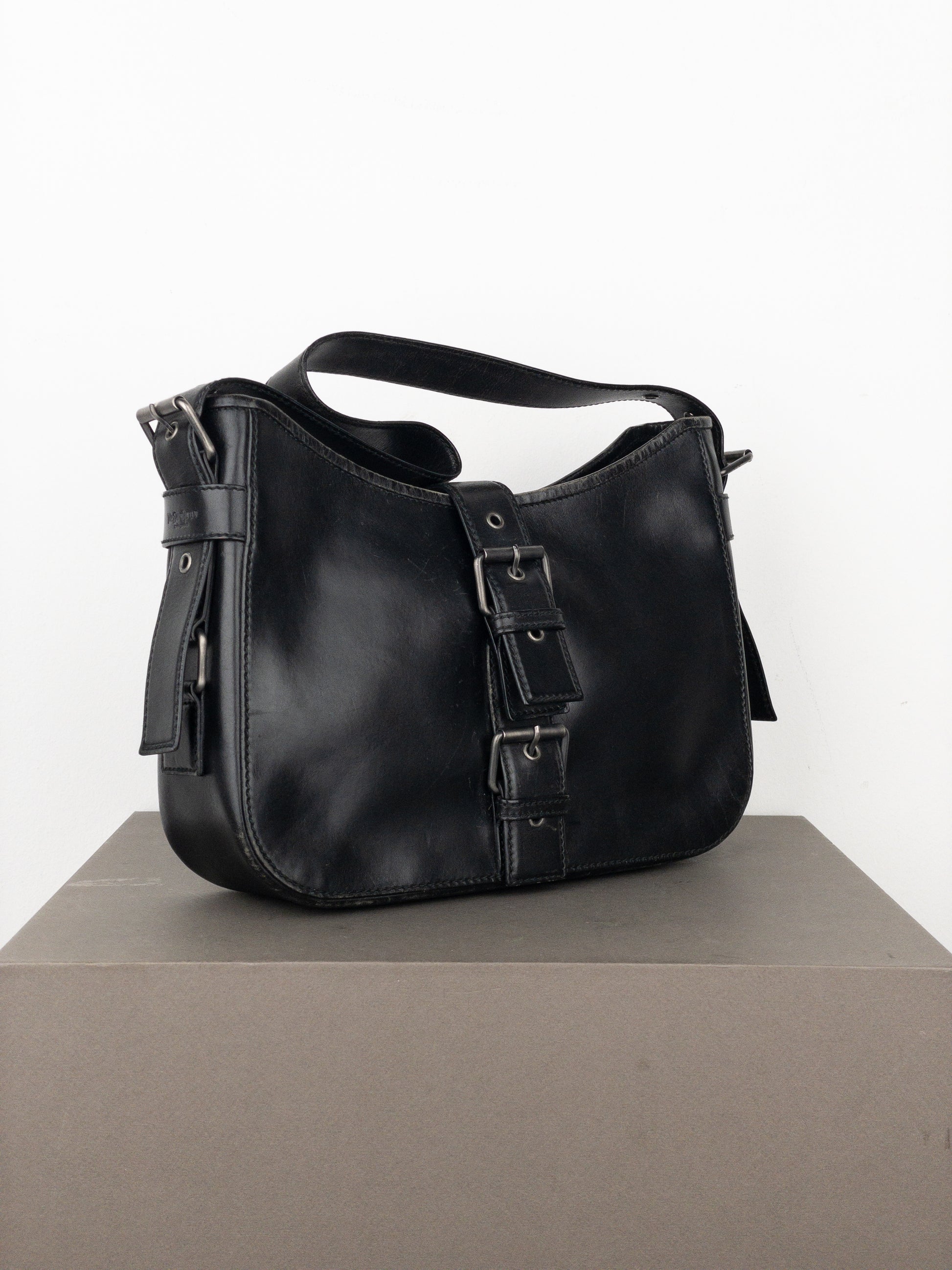Black leather shoulder bag with double-buckled closure strap across the front, from the 2000s.