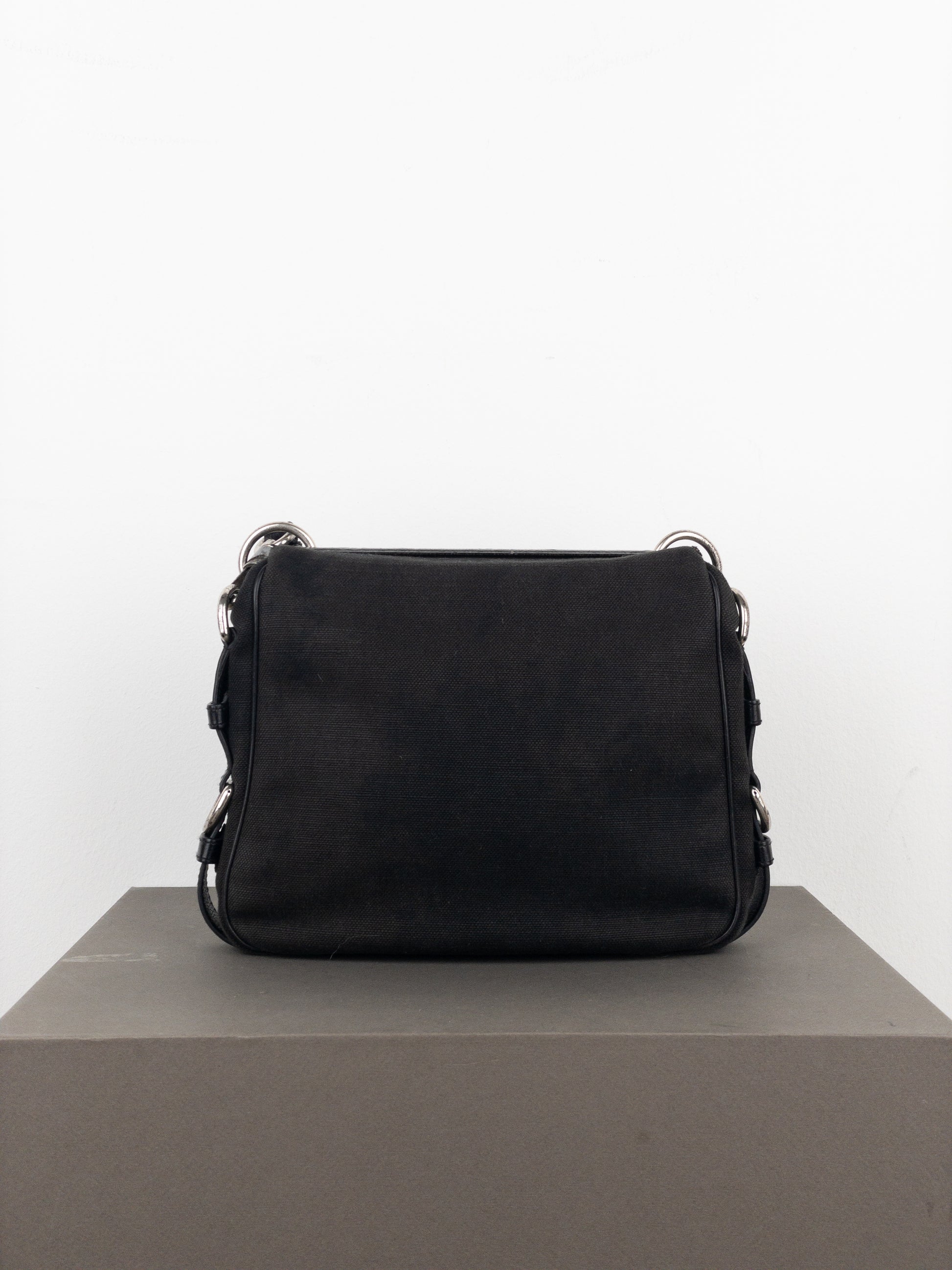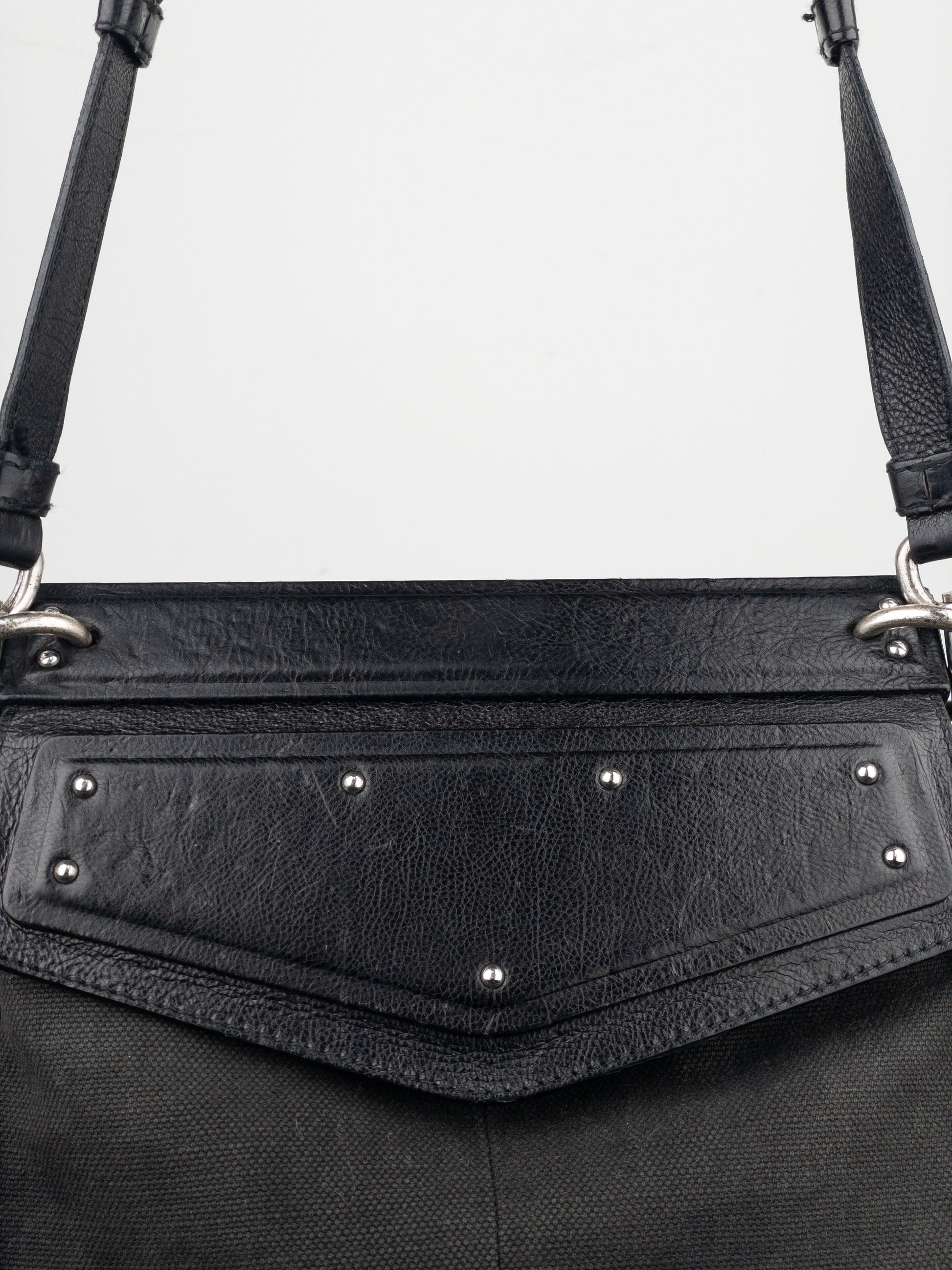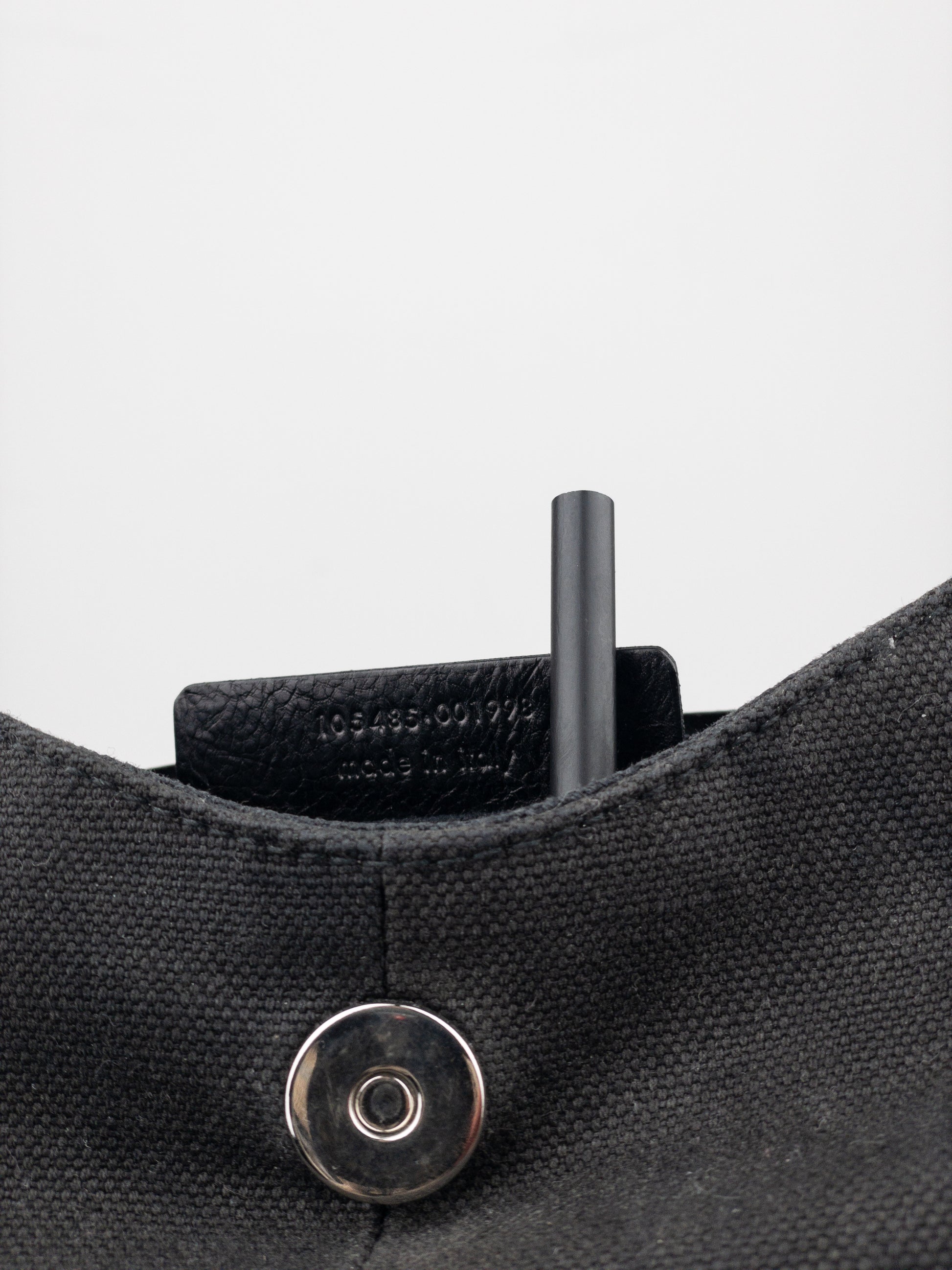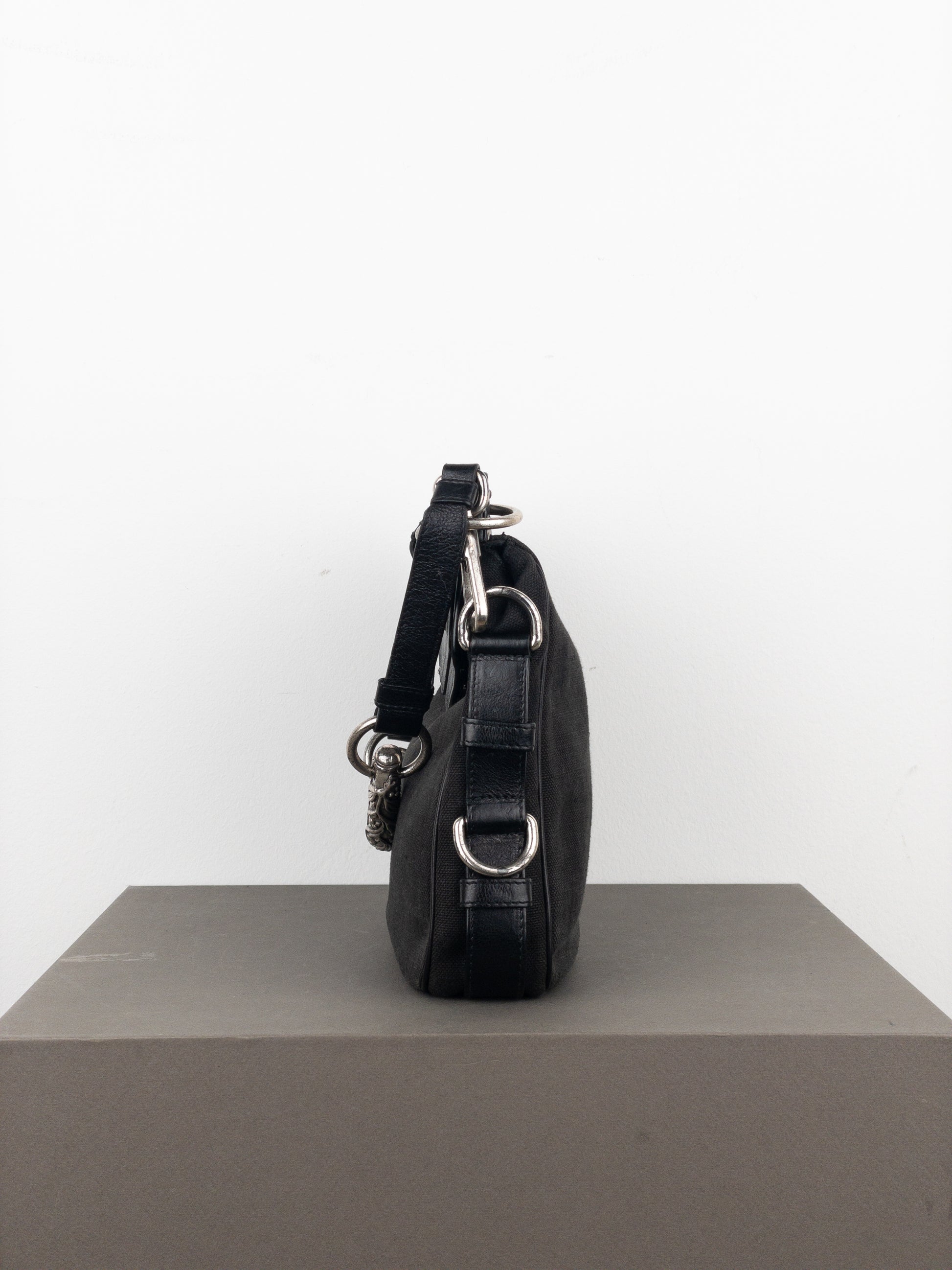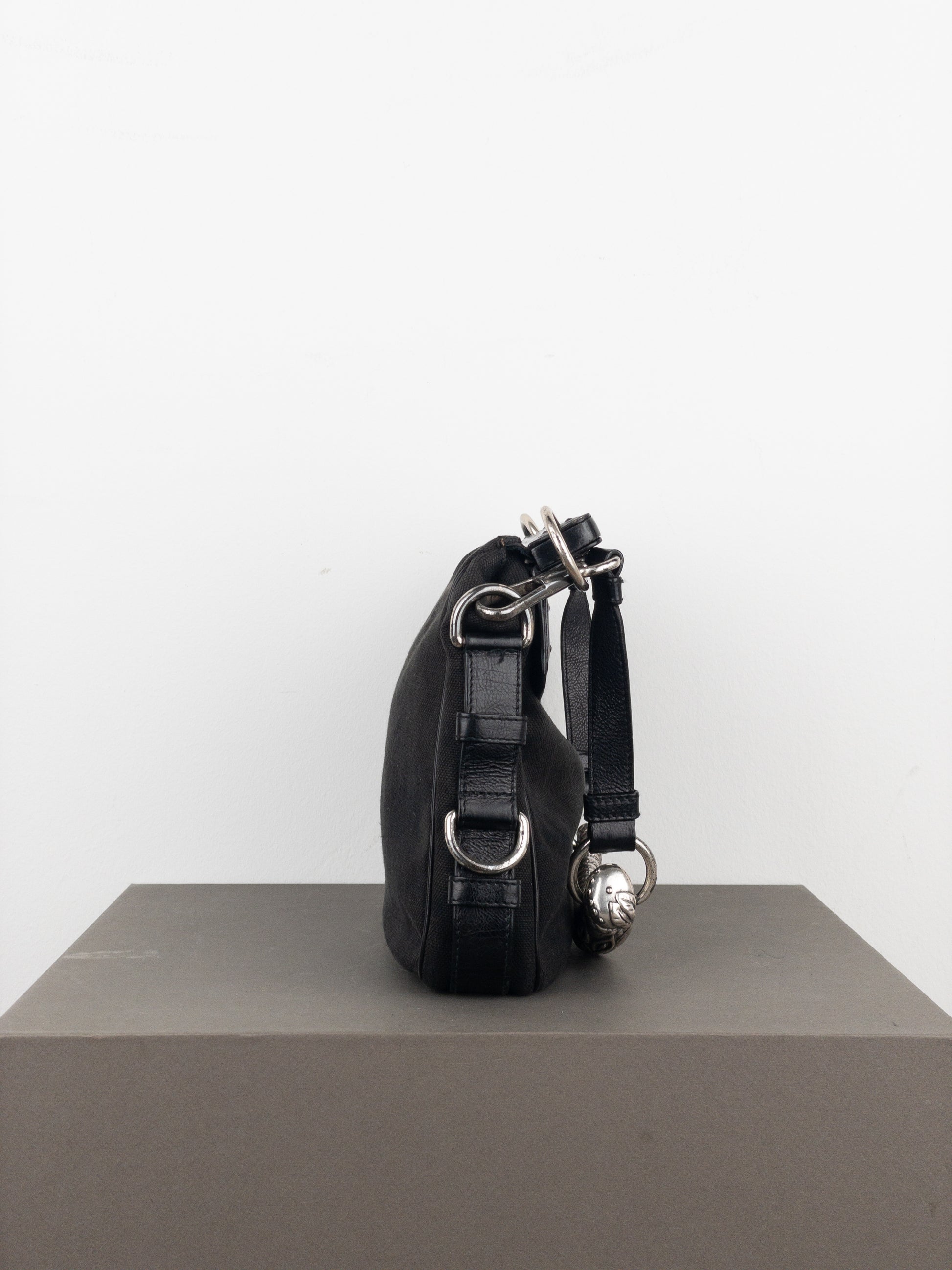 Small hobo shoulder bag in black canvas with a leather flap, featuring the signature