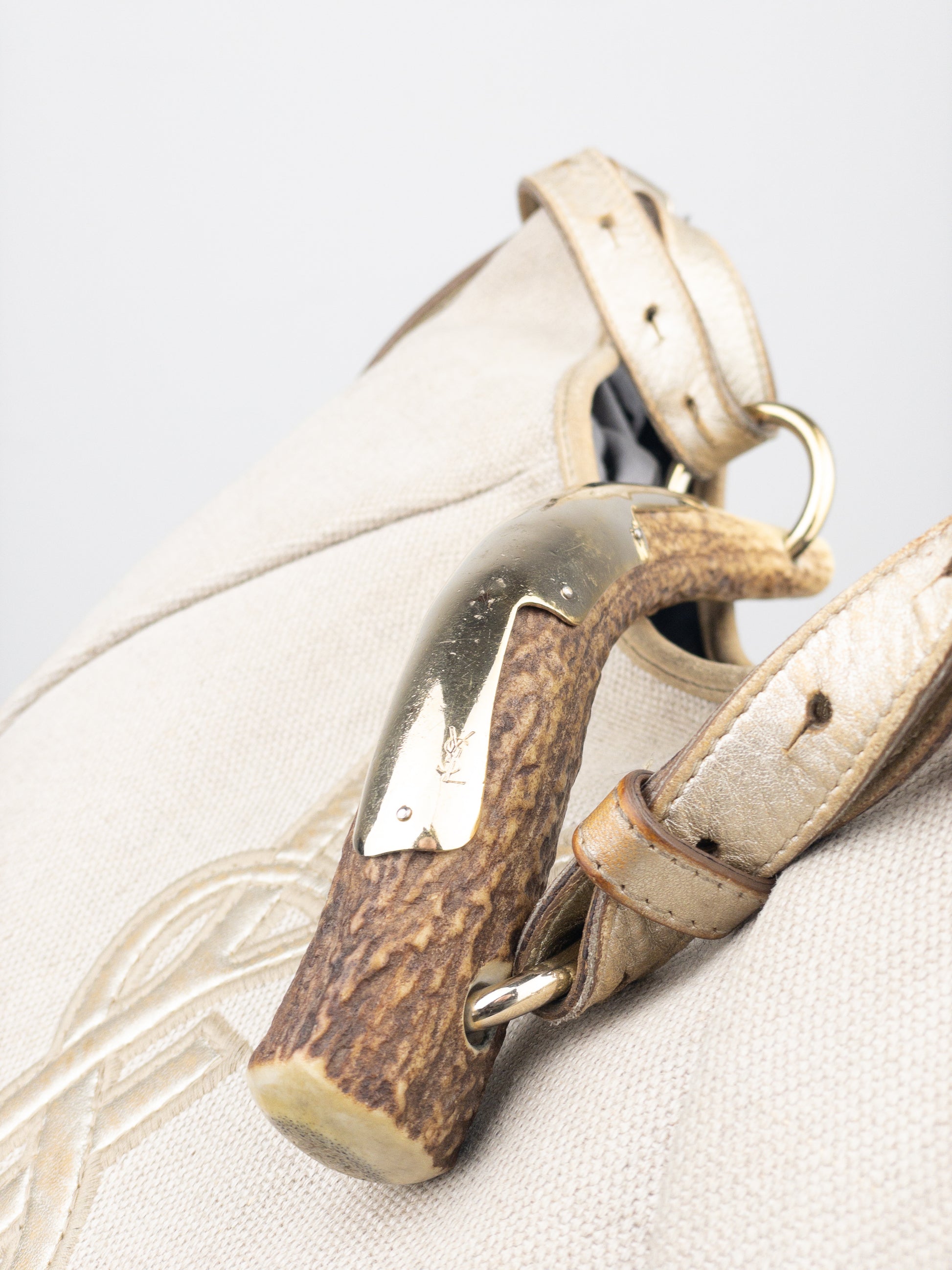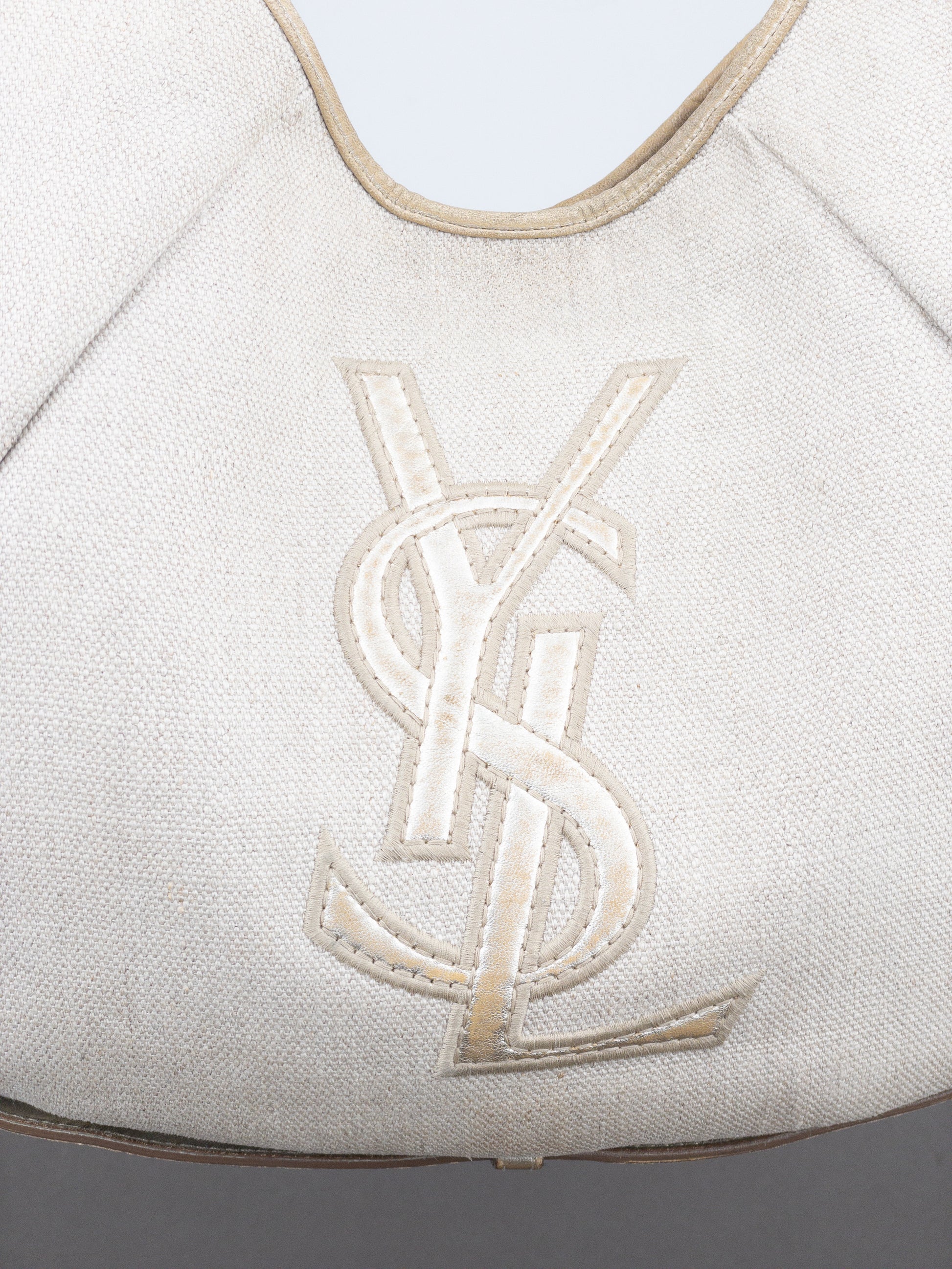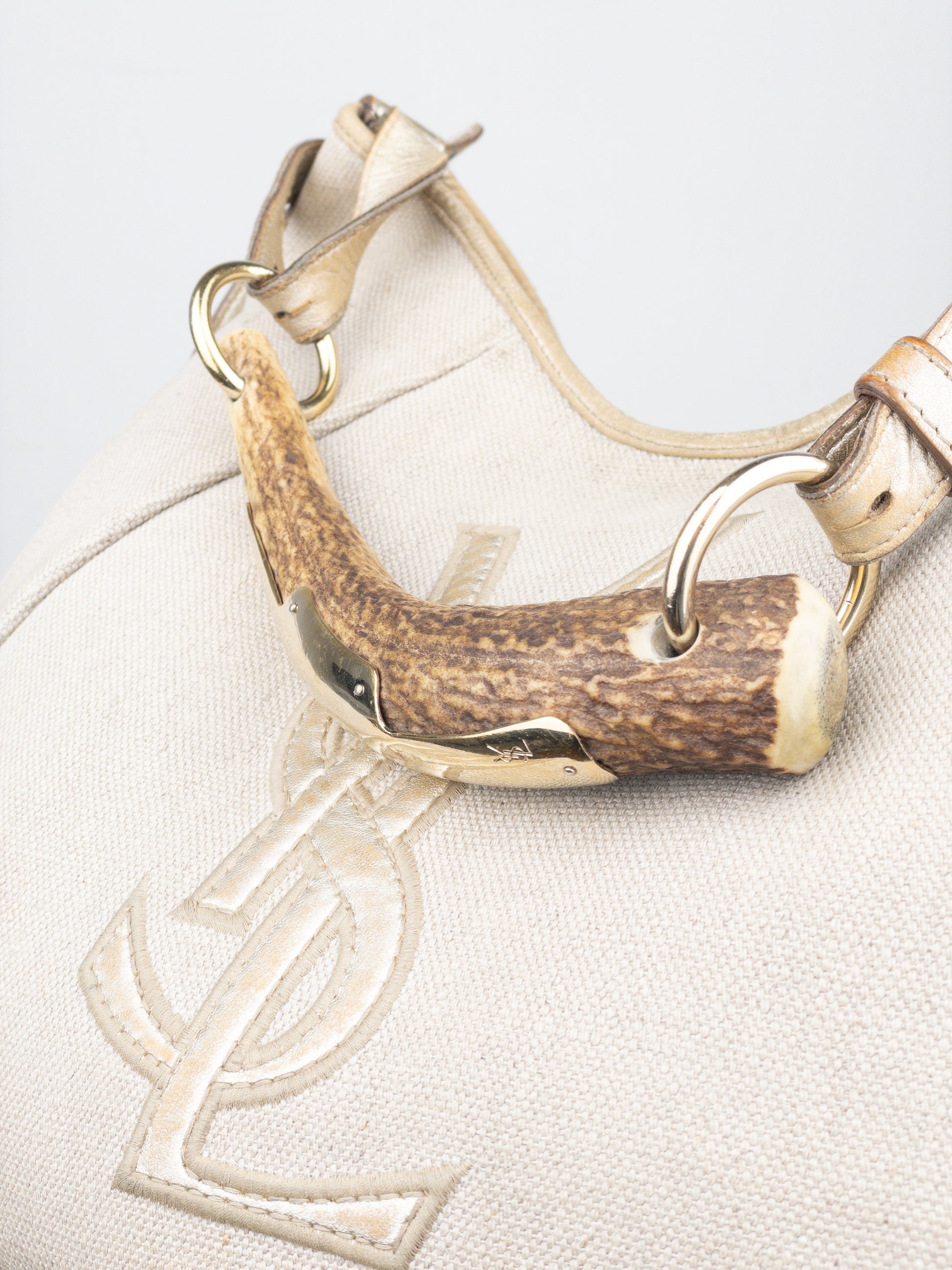 Hobo shoulder bag in beige canvas and metallic rose leather, featuring large YSL Logo in the front and the signature ‘Mombasa’ horn at the strap, from the autumn-winter 2002 collection.