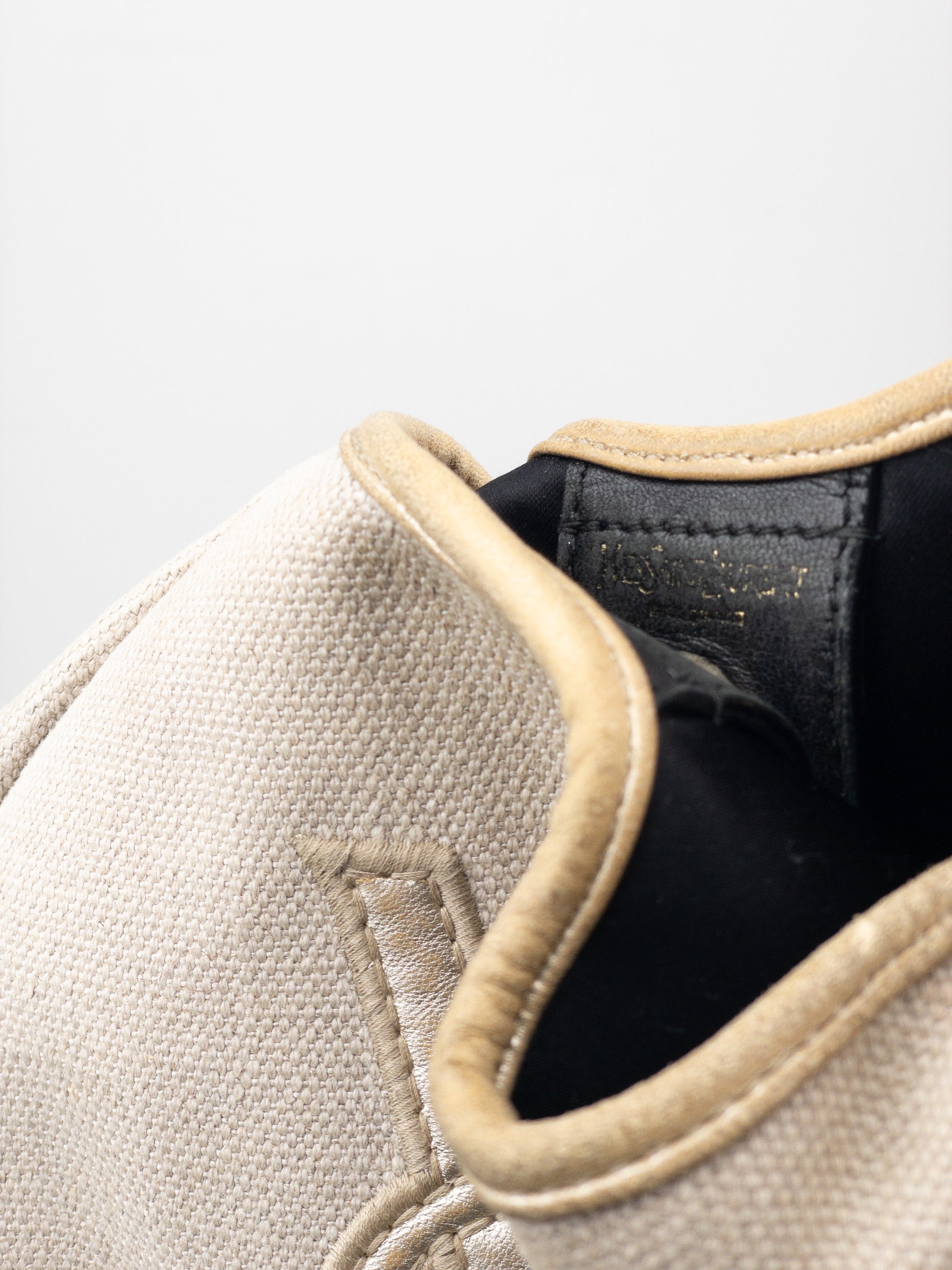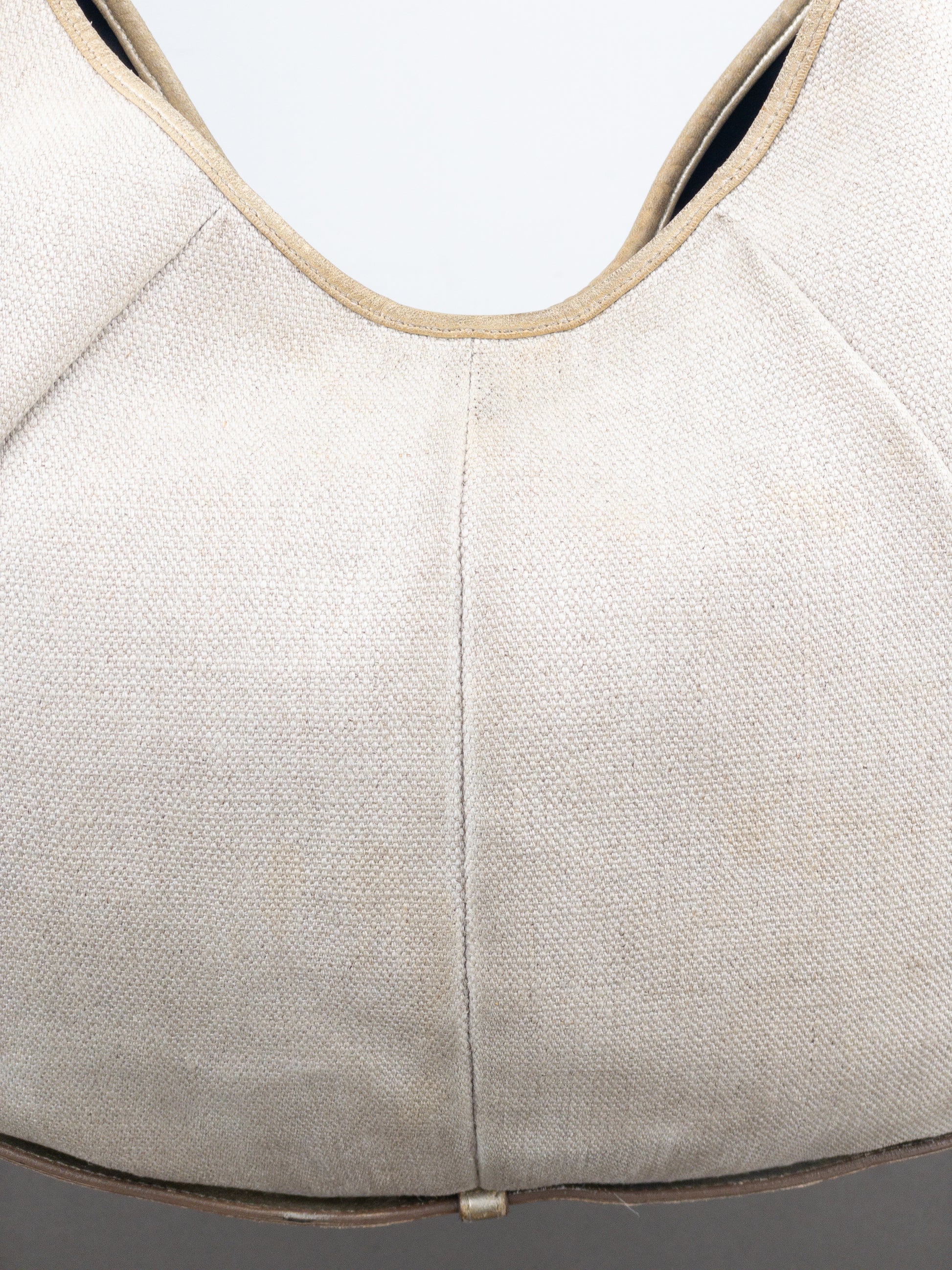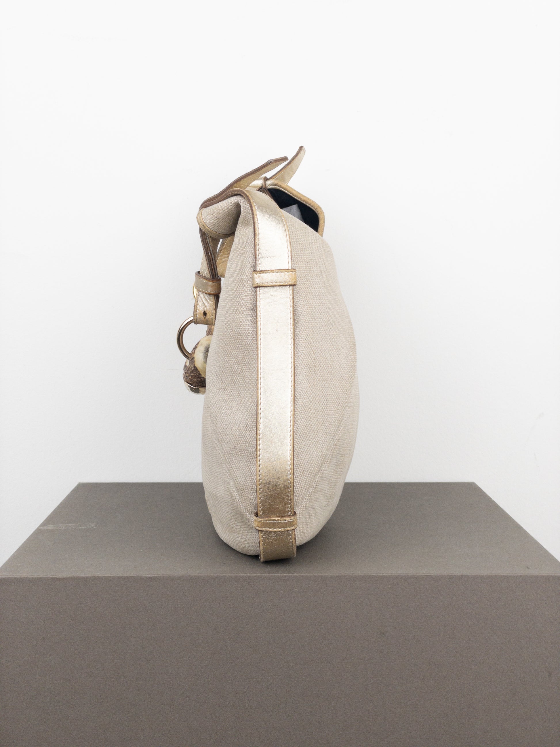Hobo shoulder bag in beige canvas and metallic rose leather, featuring large YSL Logo in the front and the signature ‘Mombasa’ horn at the strap, from the autumn-winter 2002 collection.