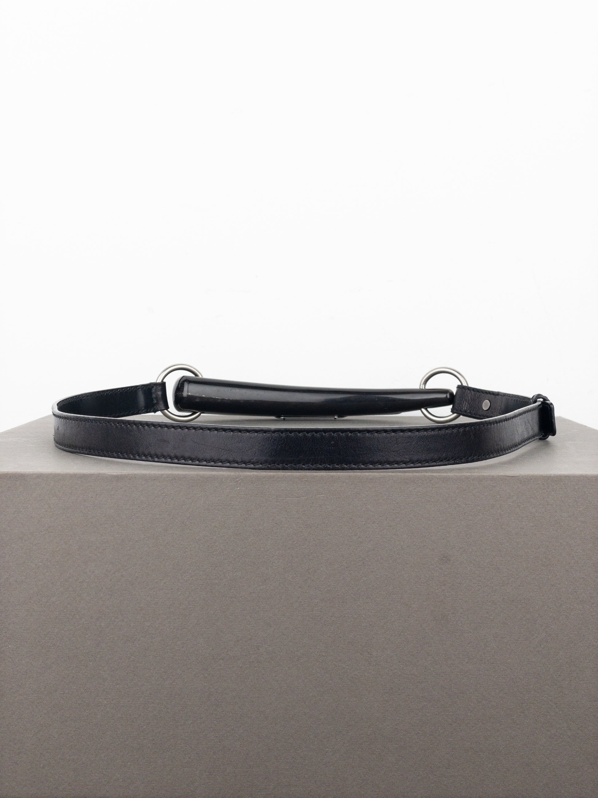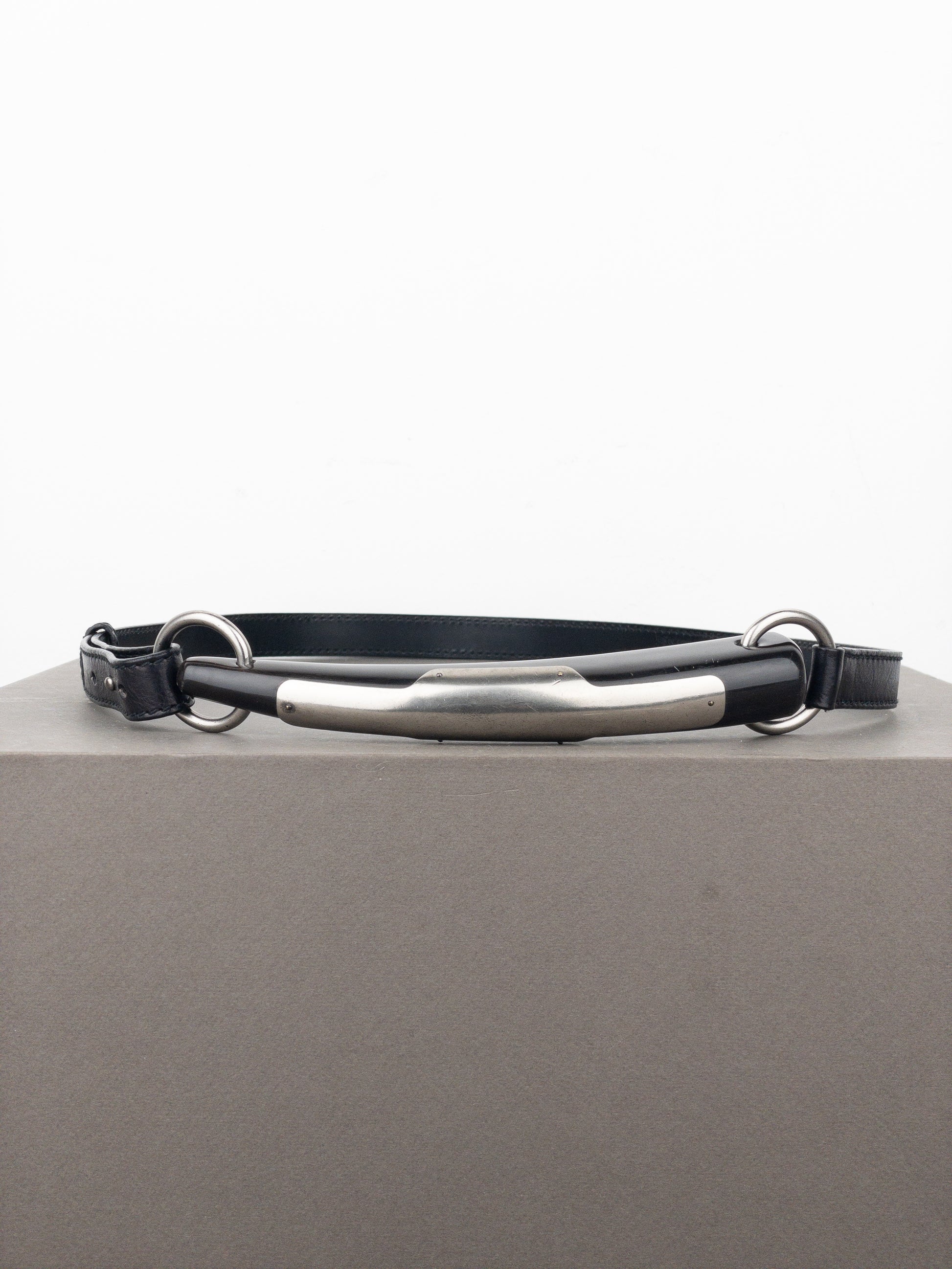 Black leather belt with large polished black horn in the front, featuring silver colored details, from the spring-summer 2002 collection